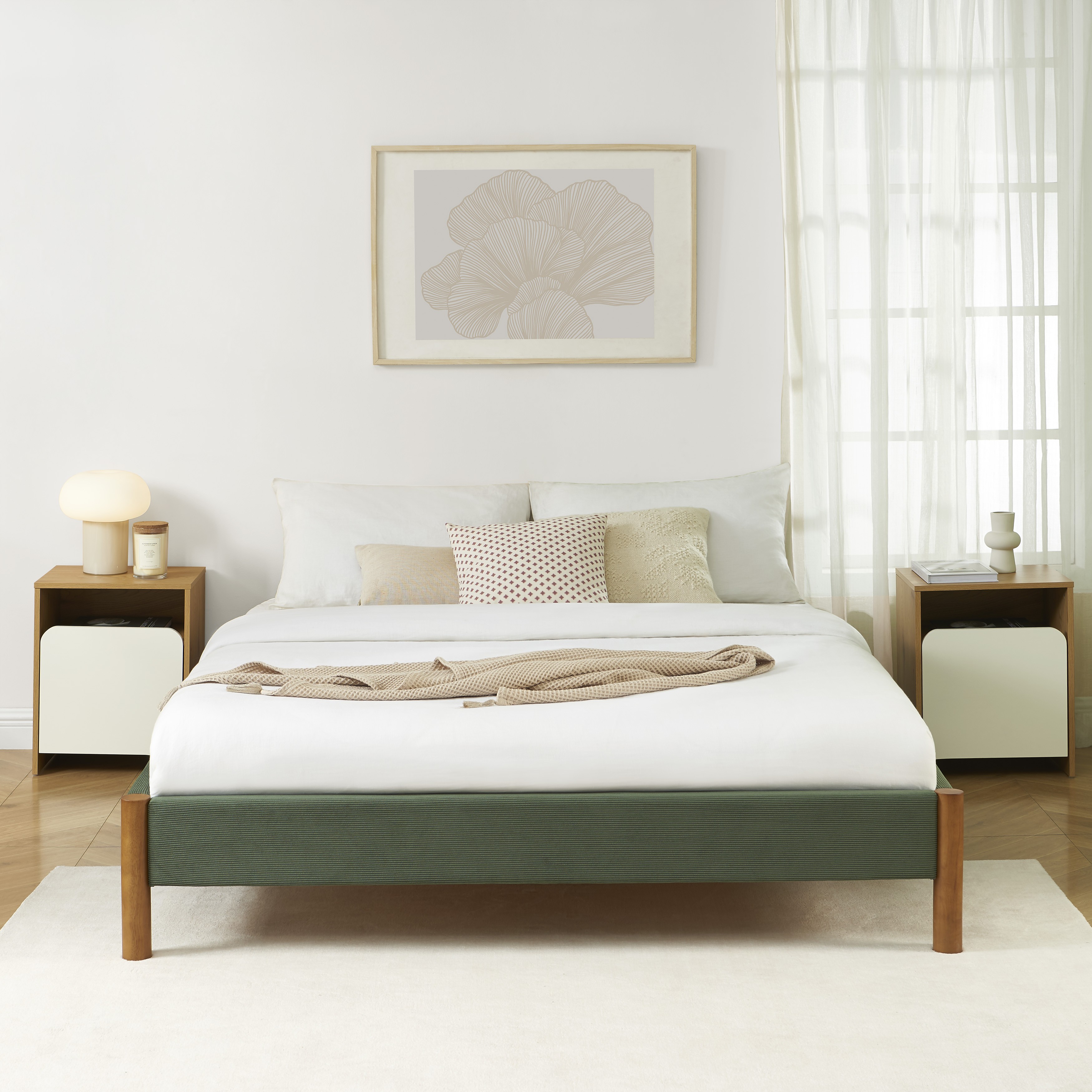 Avec son revêtement en velours côtelé moderne et ses pieds en hévéa massif, le lit BOWI apporte confort et élégance à votre chambre.