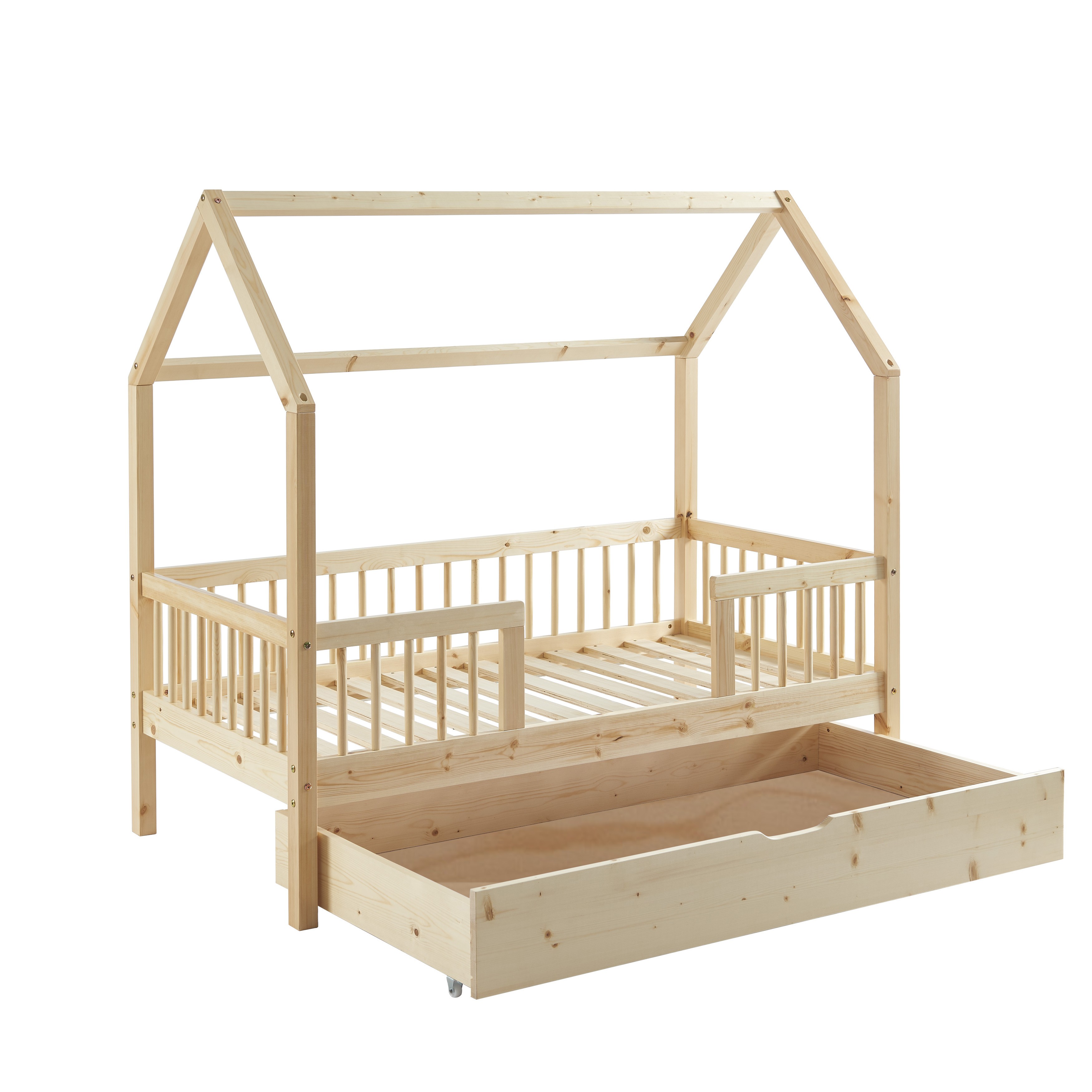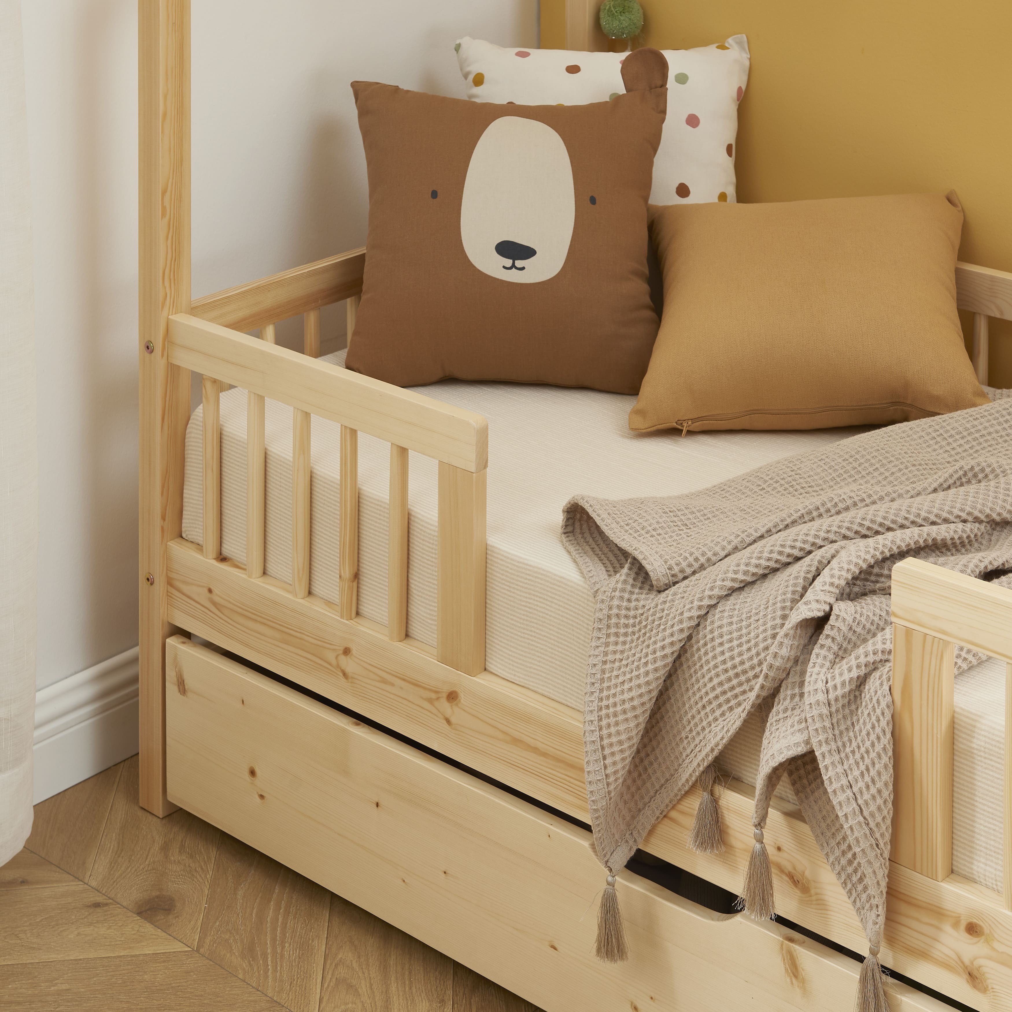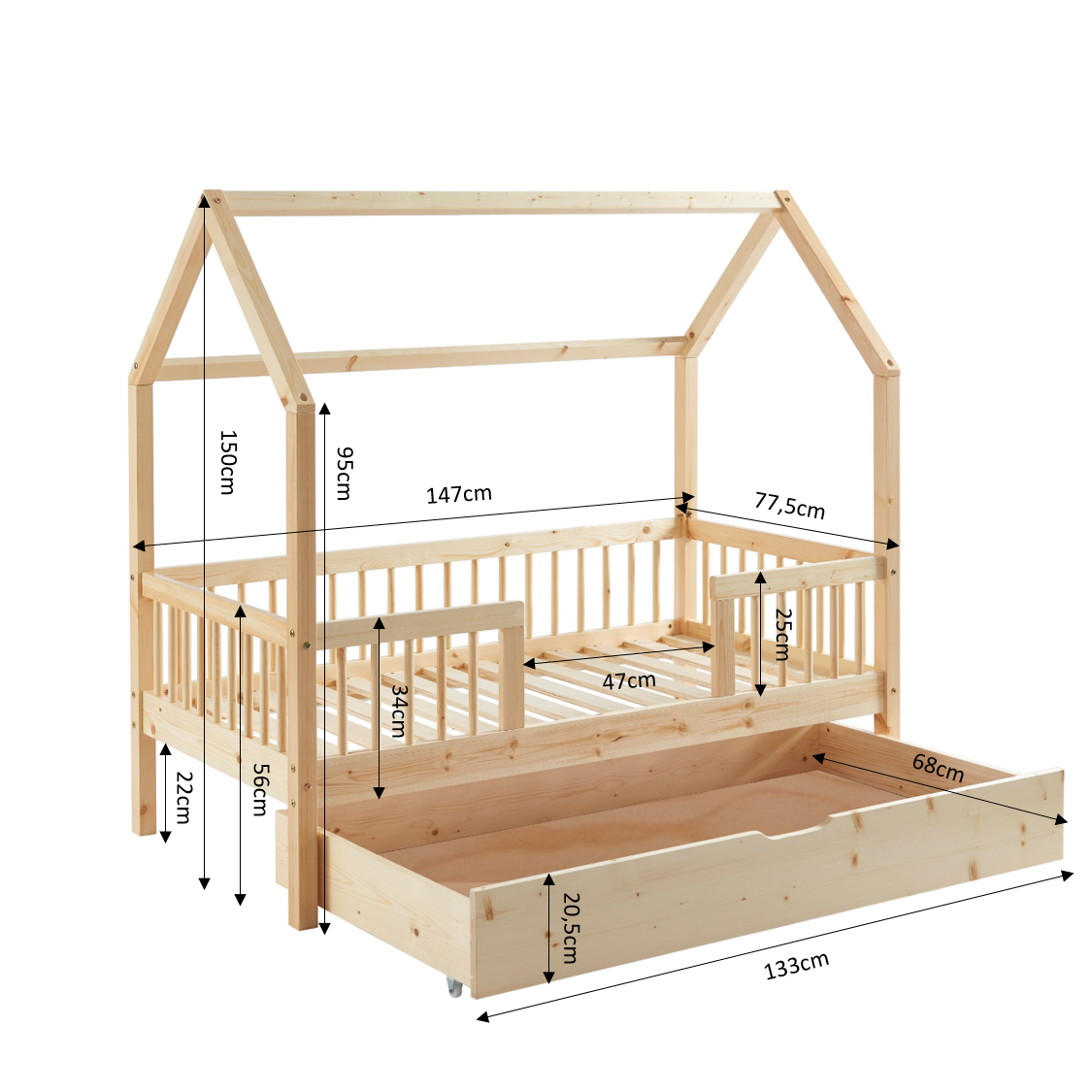 Outre son design, le lit cabane TINY vous offre un aspect fonctionnel, grâce à son tiroir de rangement astucieusement intégré sous le sommier. Cela offre un espace pratique pour ranger les jouets, les couvertures, les livres ou tout ce que votre enfant souhaite garder à portée de main. C'est un excellent moyen d'encourager l'organisation et de maintenir la chambre de votre enfant propre et bien rangée.