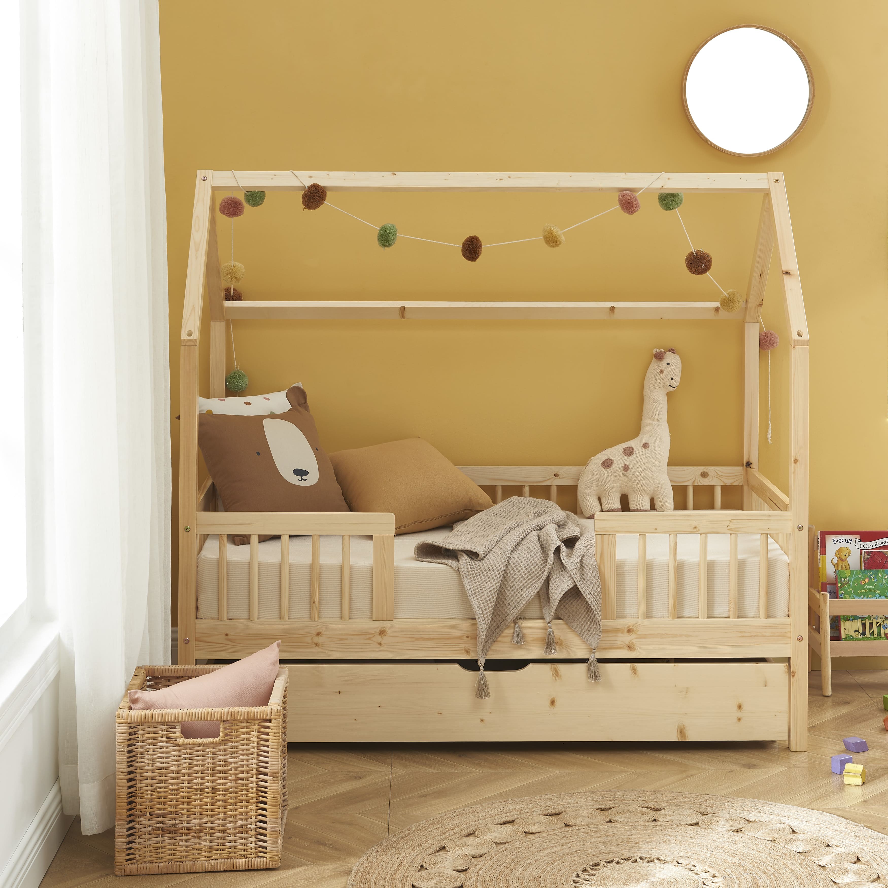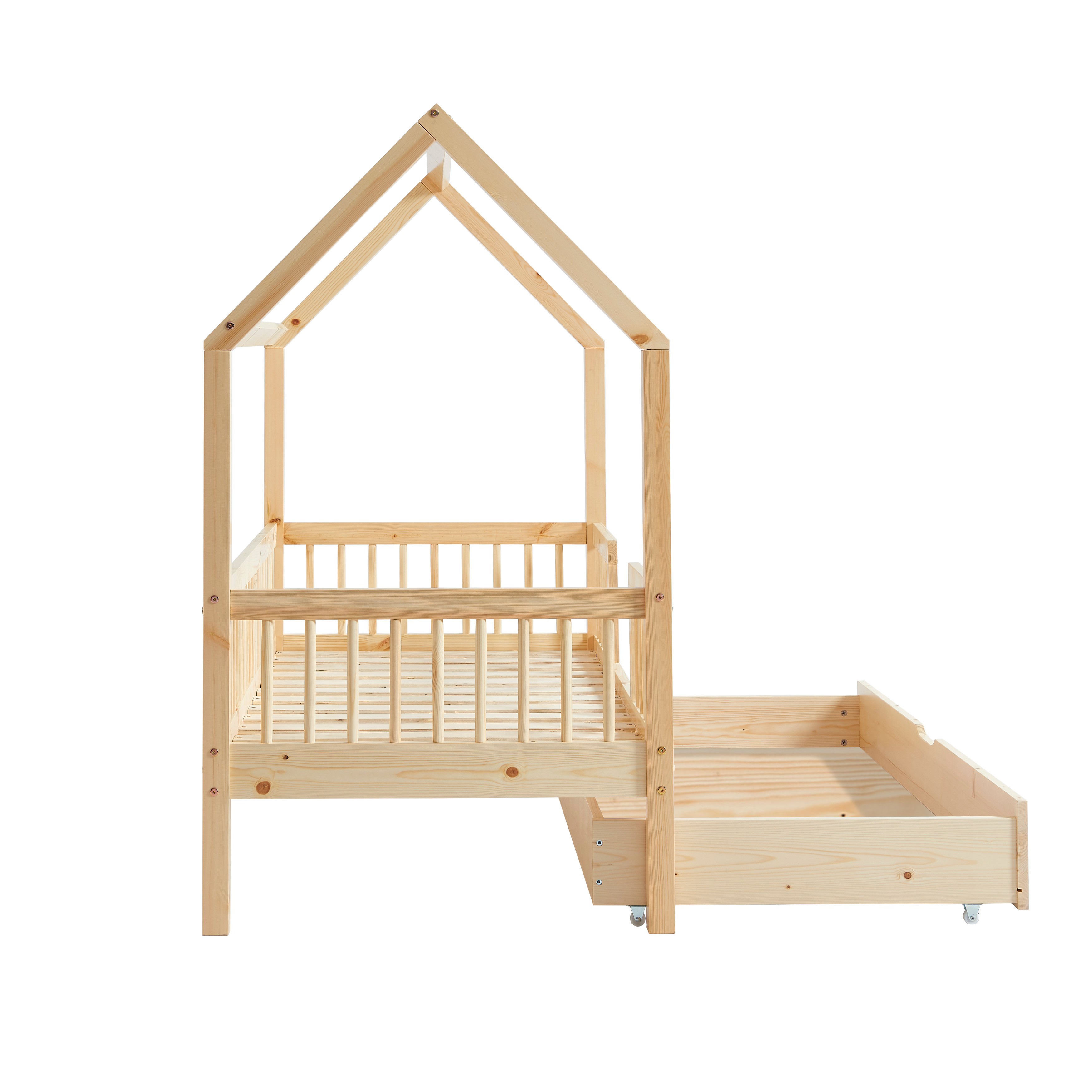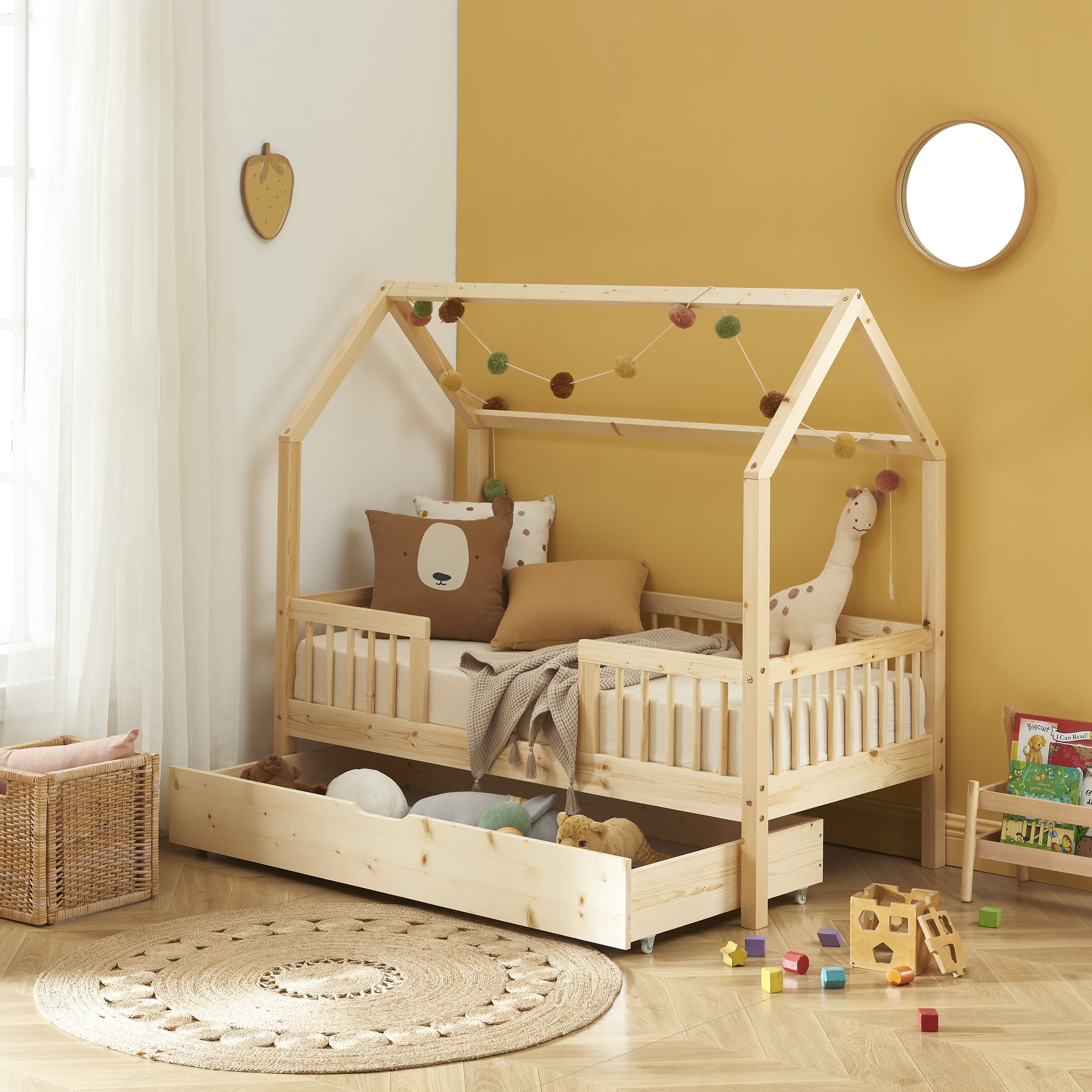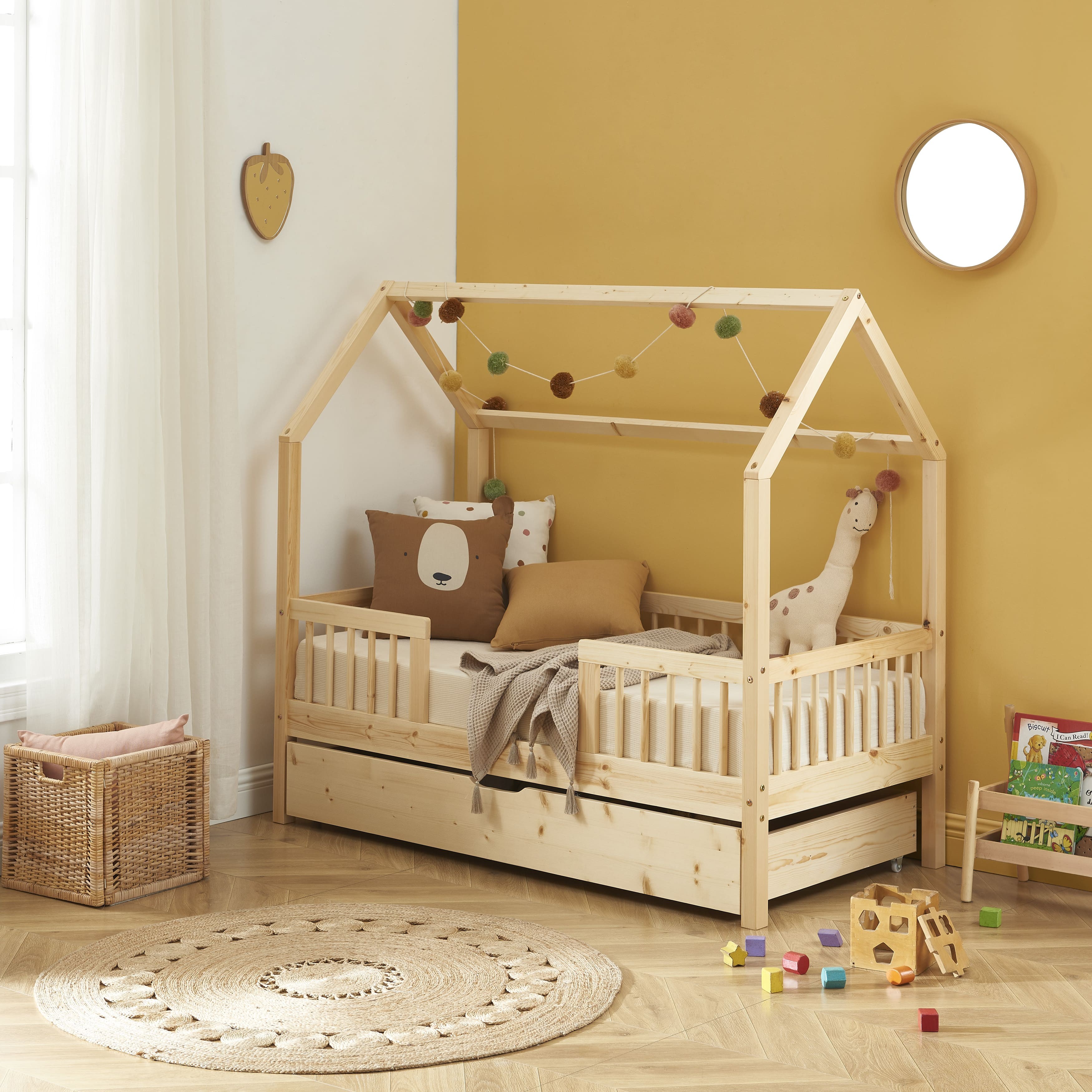 Outre son design, le lit cabane TINY vous offre un aspect fonctionnel, grâce à son tiroir de rangement astucieusement intégré sous le sommier. Cela offre un espace pratique pour ranger les jouets, les couvertures, les livres ou tout ce que votre enfant souhaite garder à portée de main. C'est un excellent moyen d'encourager l'organisation et de maintenir la chambre de votre enfant propre et bien rangée.