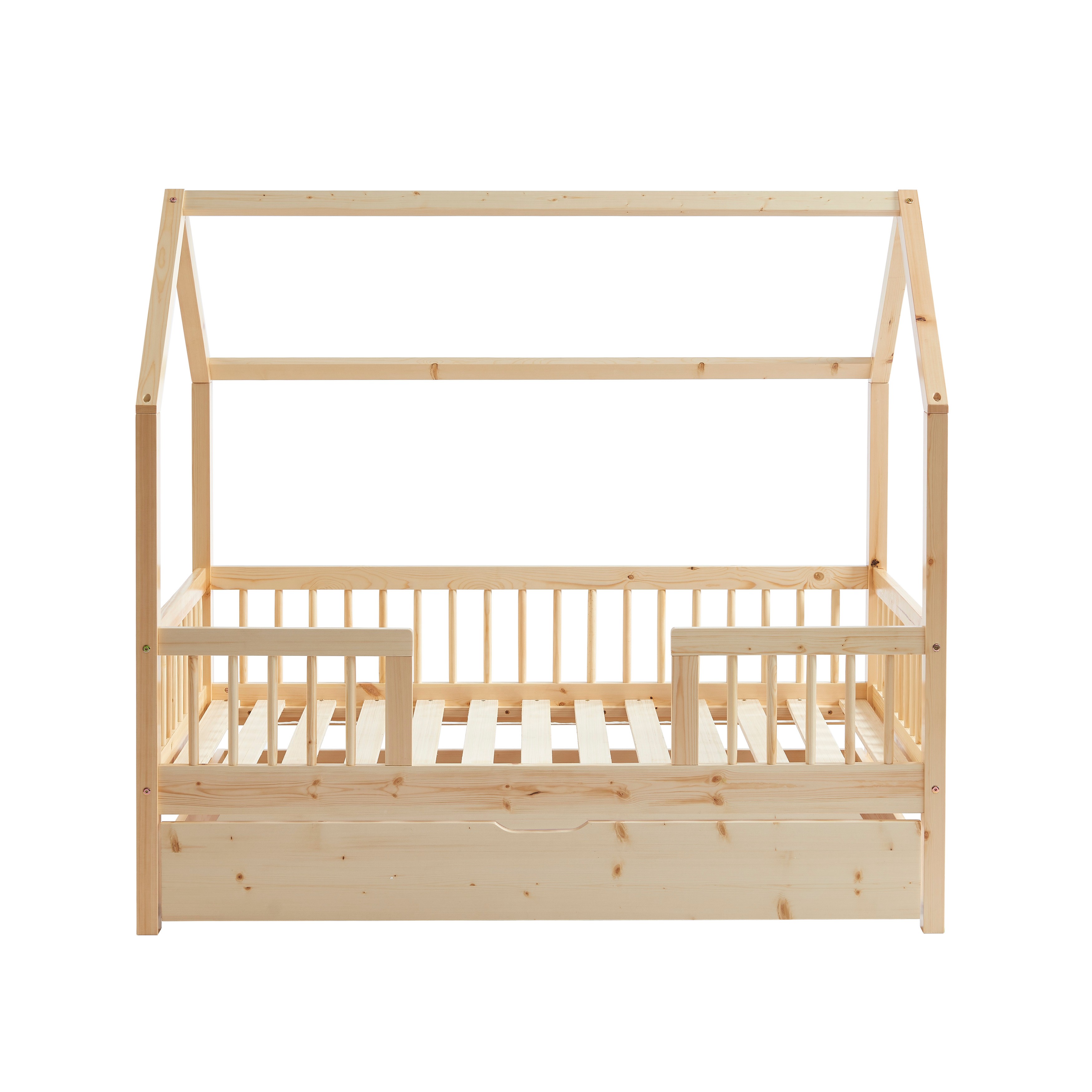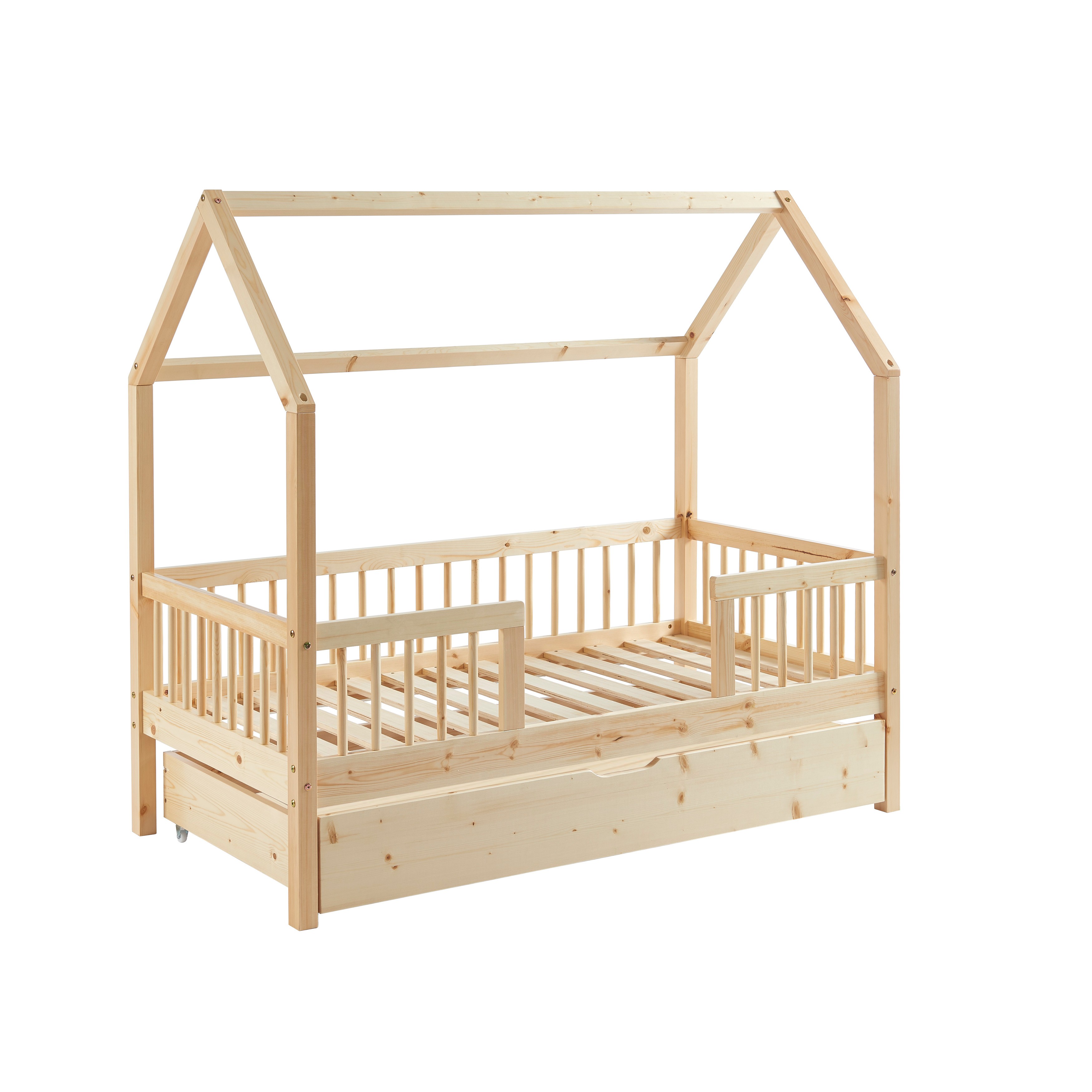 Lit cabane avec barrières TINY pin massif 70x140 sommier + tiroir inclus - dimensions : 147 x 77.5 x 1 cm