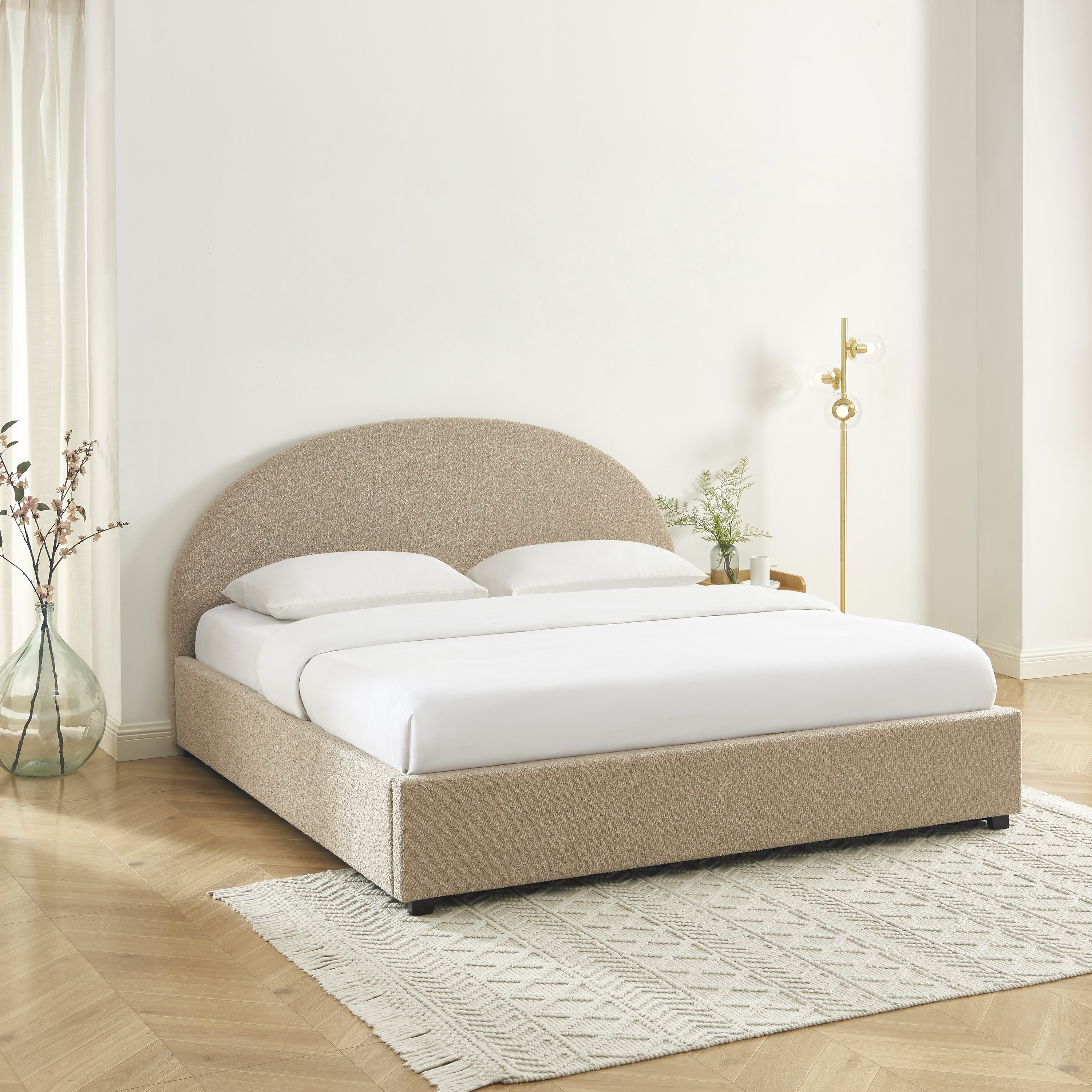 Le revêtement en laine bouclée du lit OLAF, disponible en coloris beige ou écru, offre une texture douce et chaleureuse, créant une ambiance cocooning dans votre espace de repos. Les nuances neutres et apaisantes de la laine bouclée permettent au lit de s'intégrer parfaitement dans divers styles de décoration intérieure, qu'il s'agisse d'un environnement moderne, minimaliste ou classique.