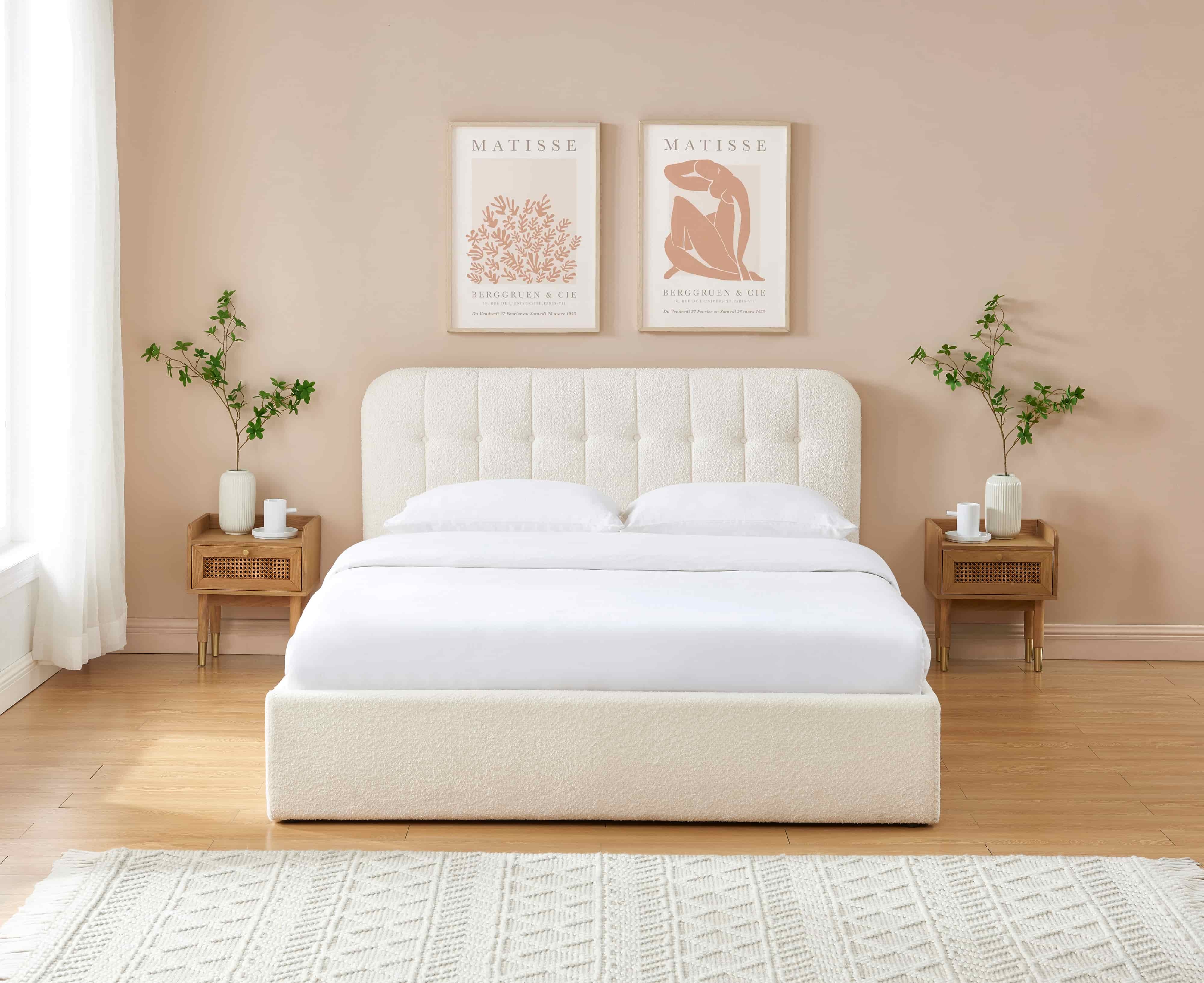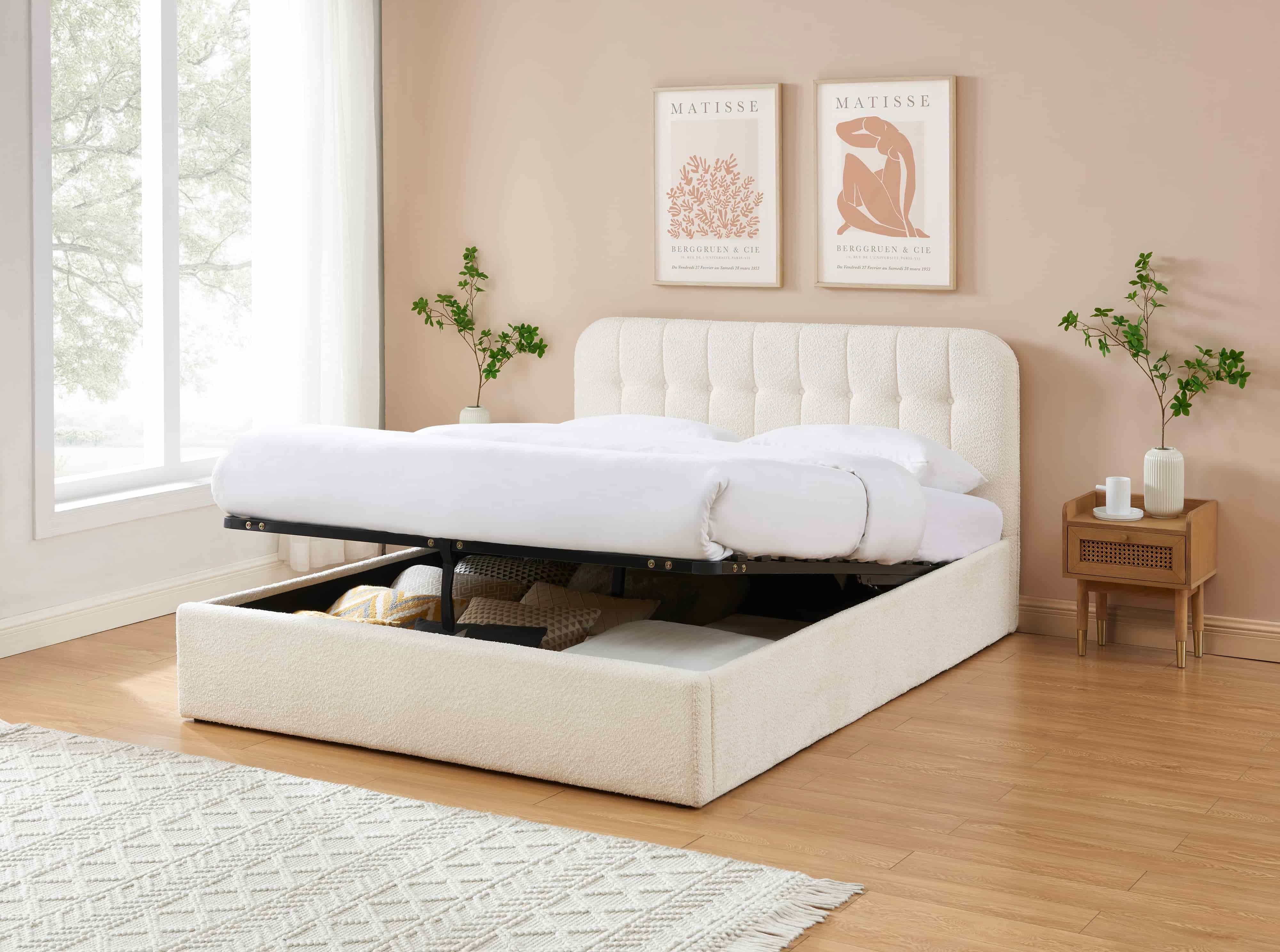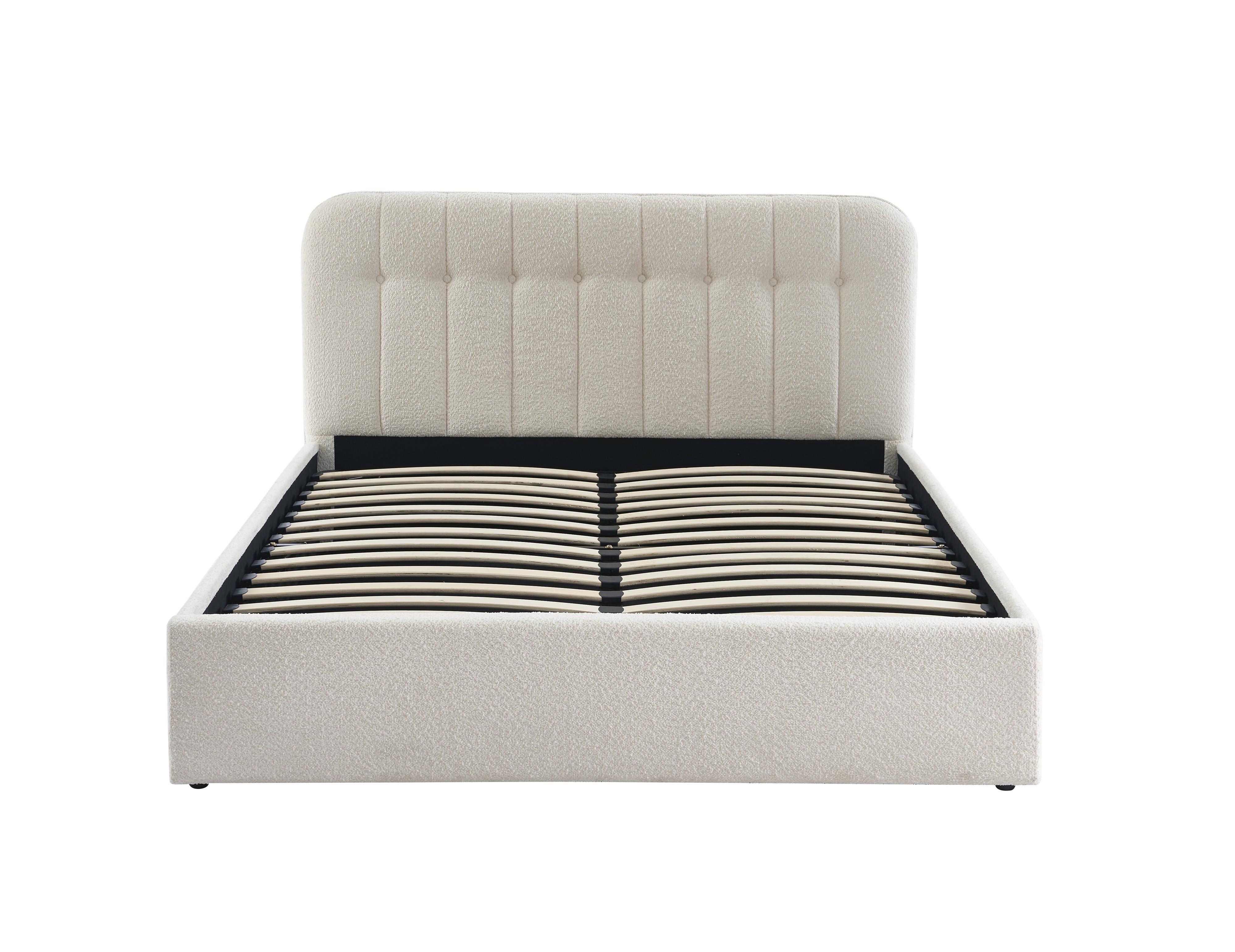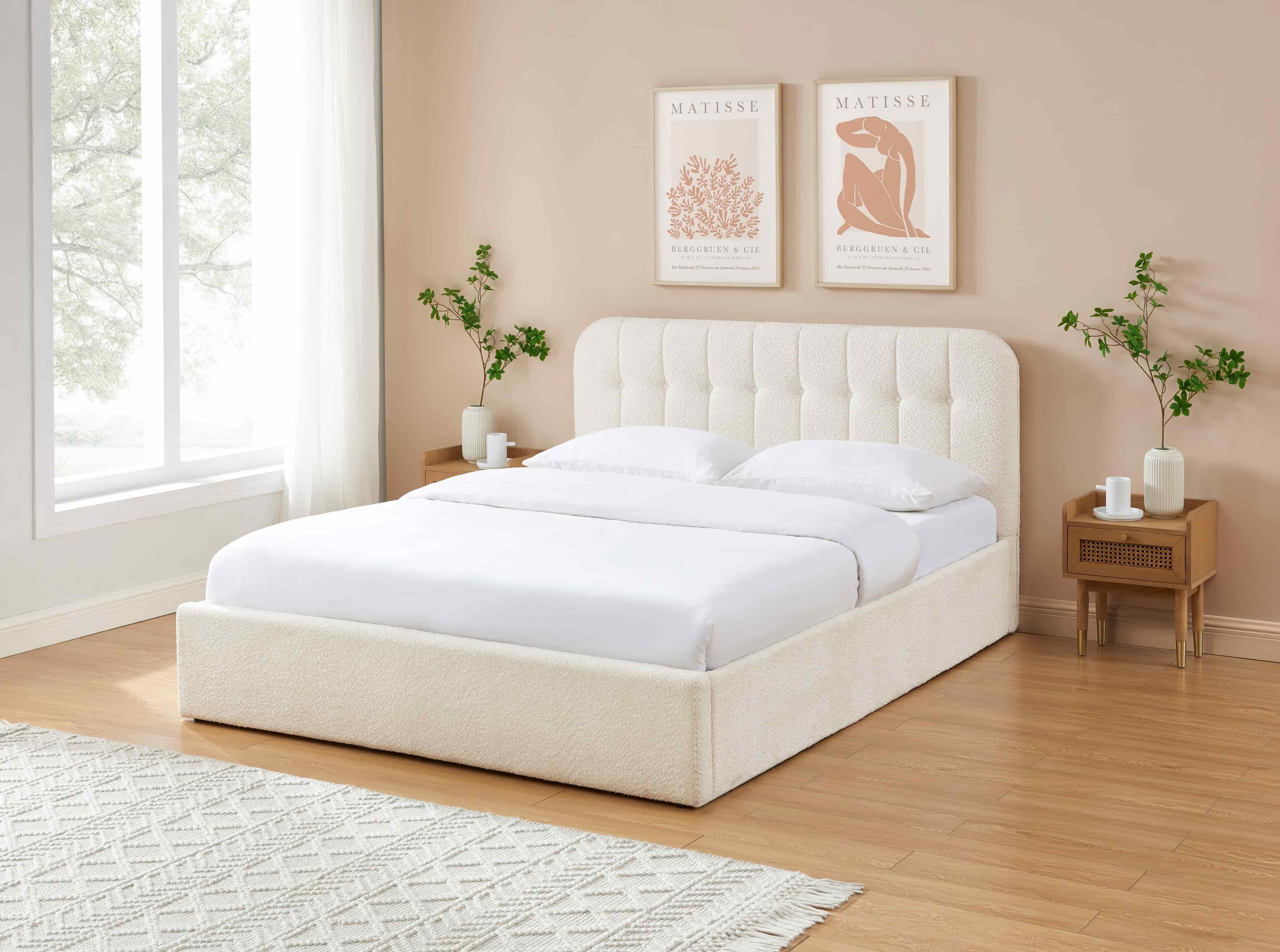 Lit coffre ANDRE tissu bouclettes écru 160x200 sommier inclus