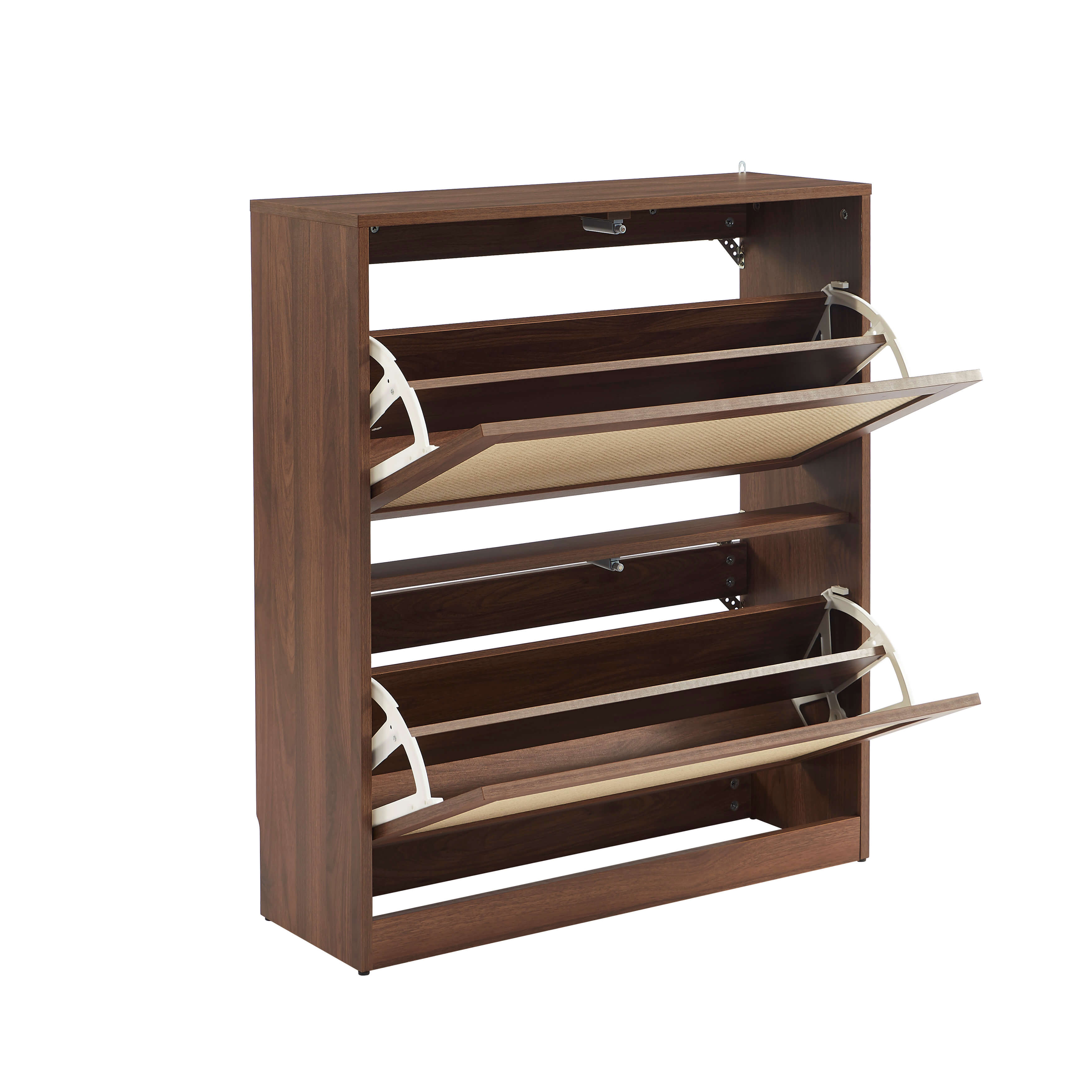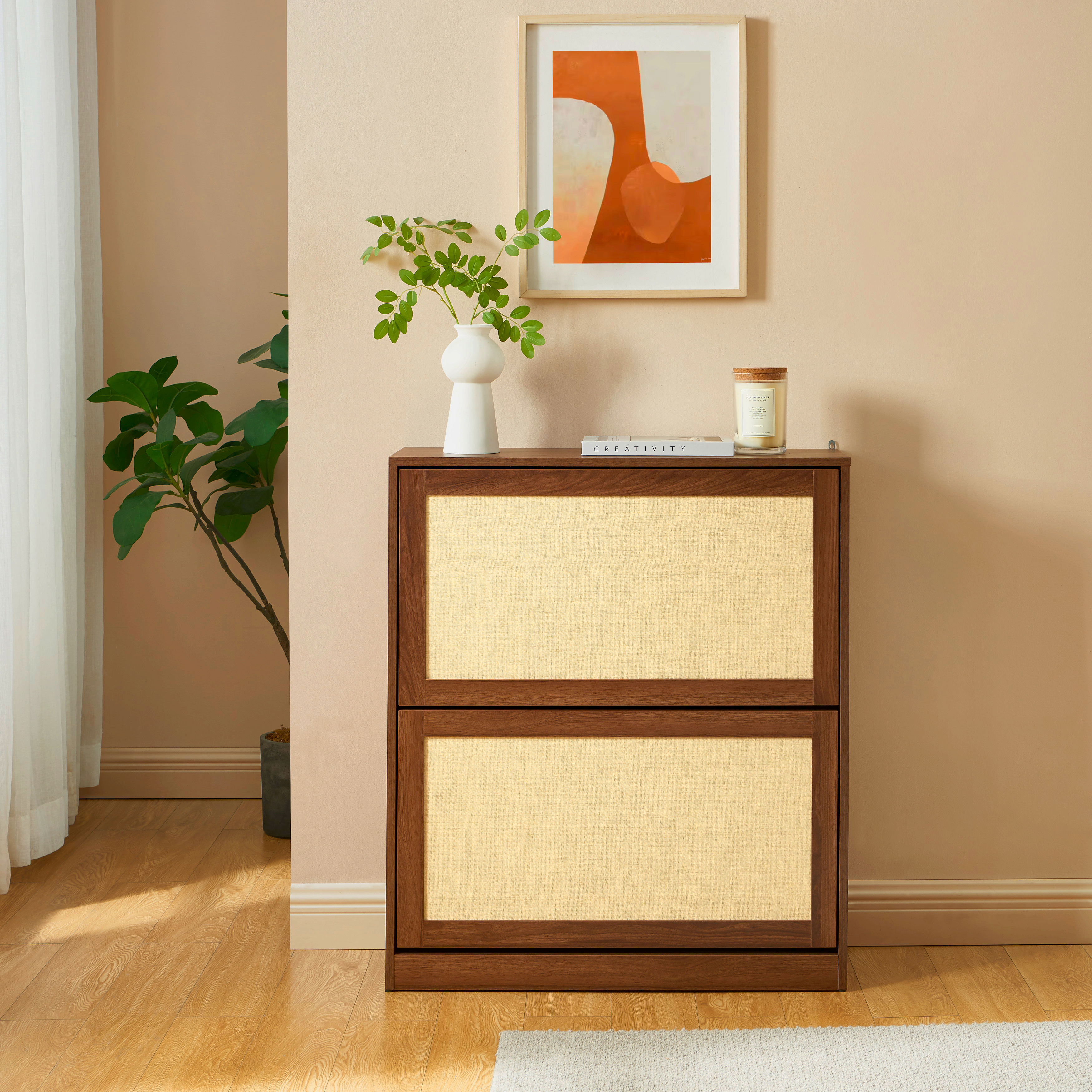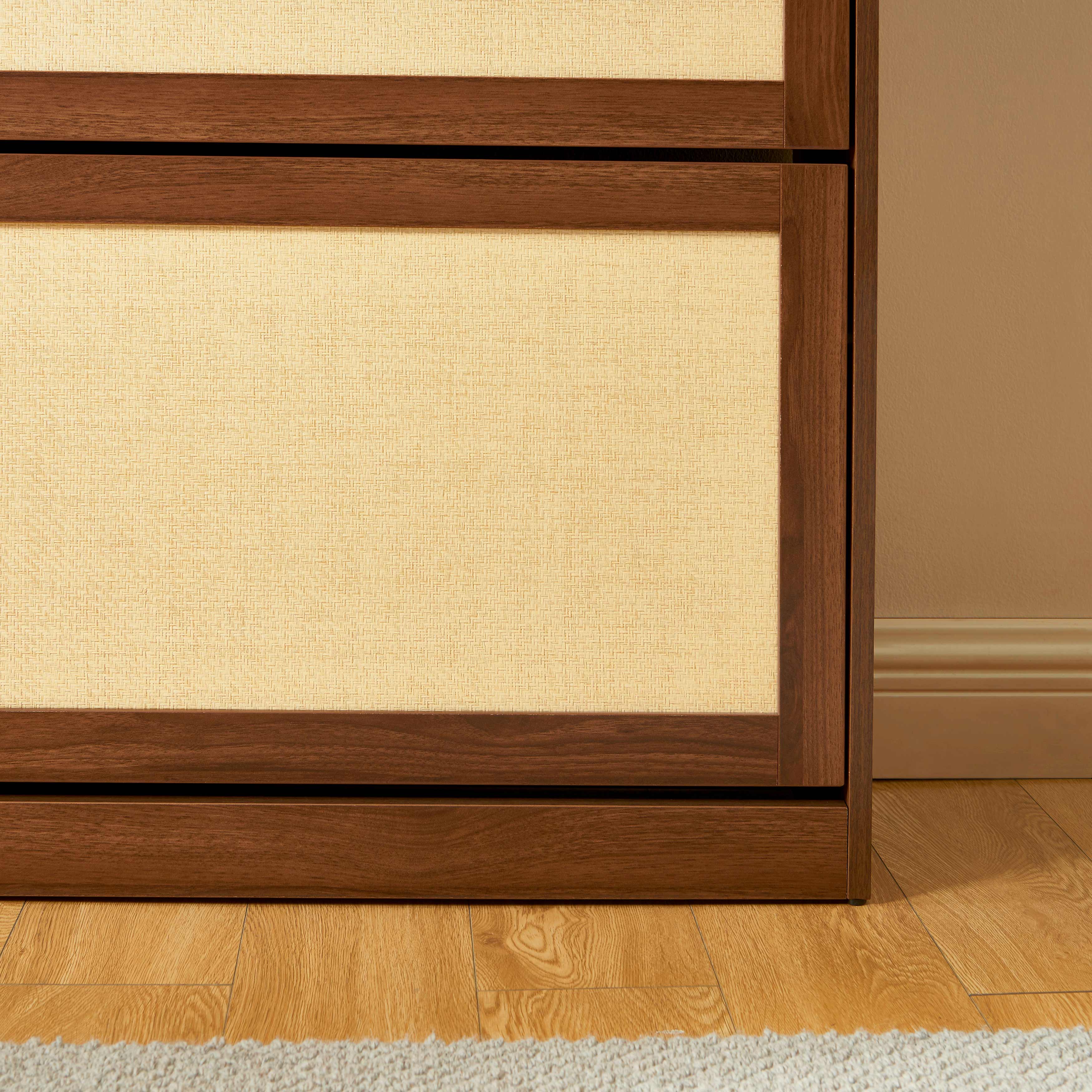 Rangez vos chaussures avec style grâce au meuble HARIA ! Son design chaleureux en bois effet noyer et rotin s'intègre facilement dans une entrée, un couloir ou une chambre.