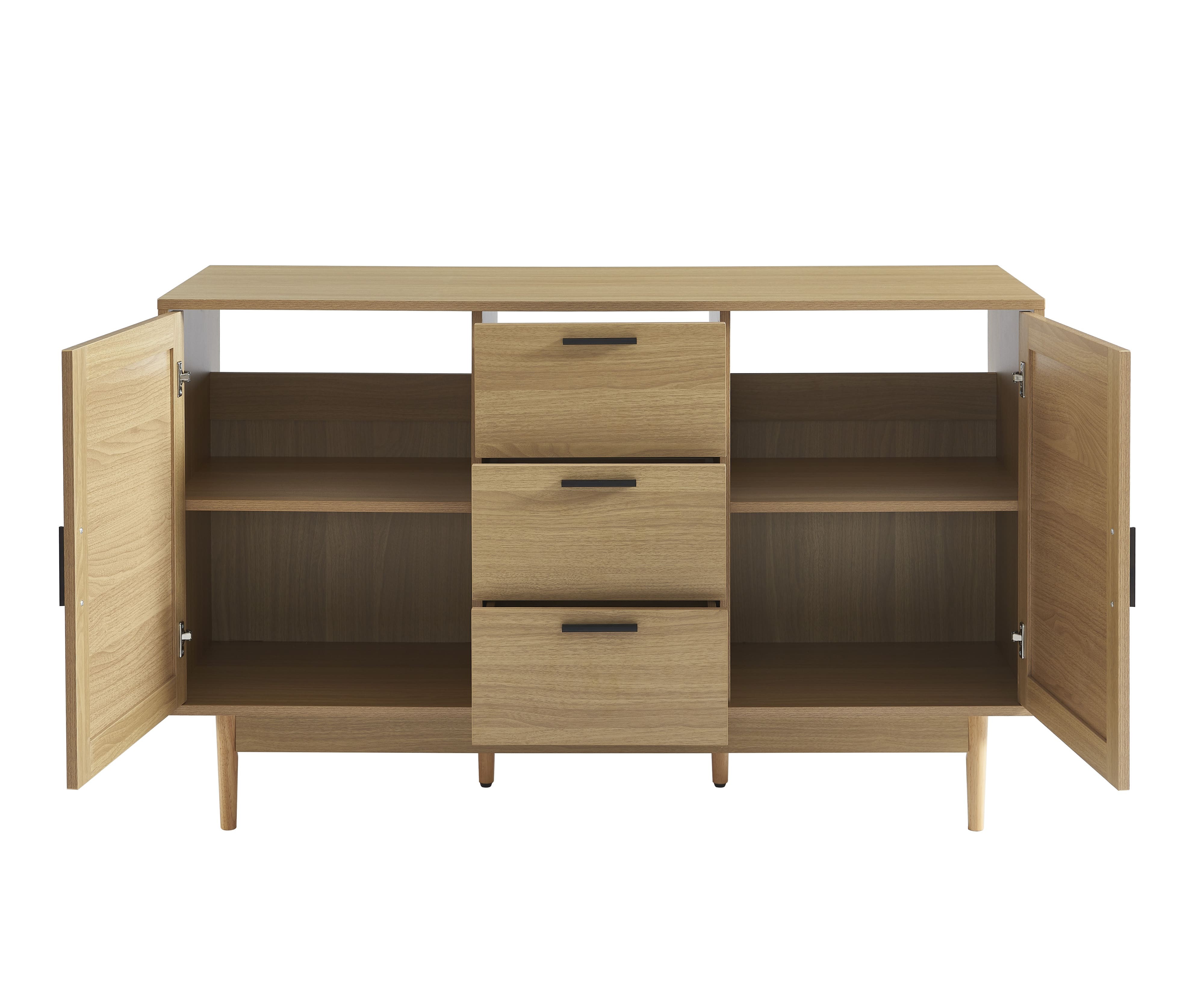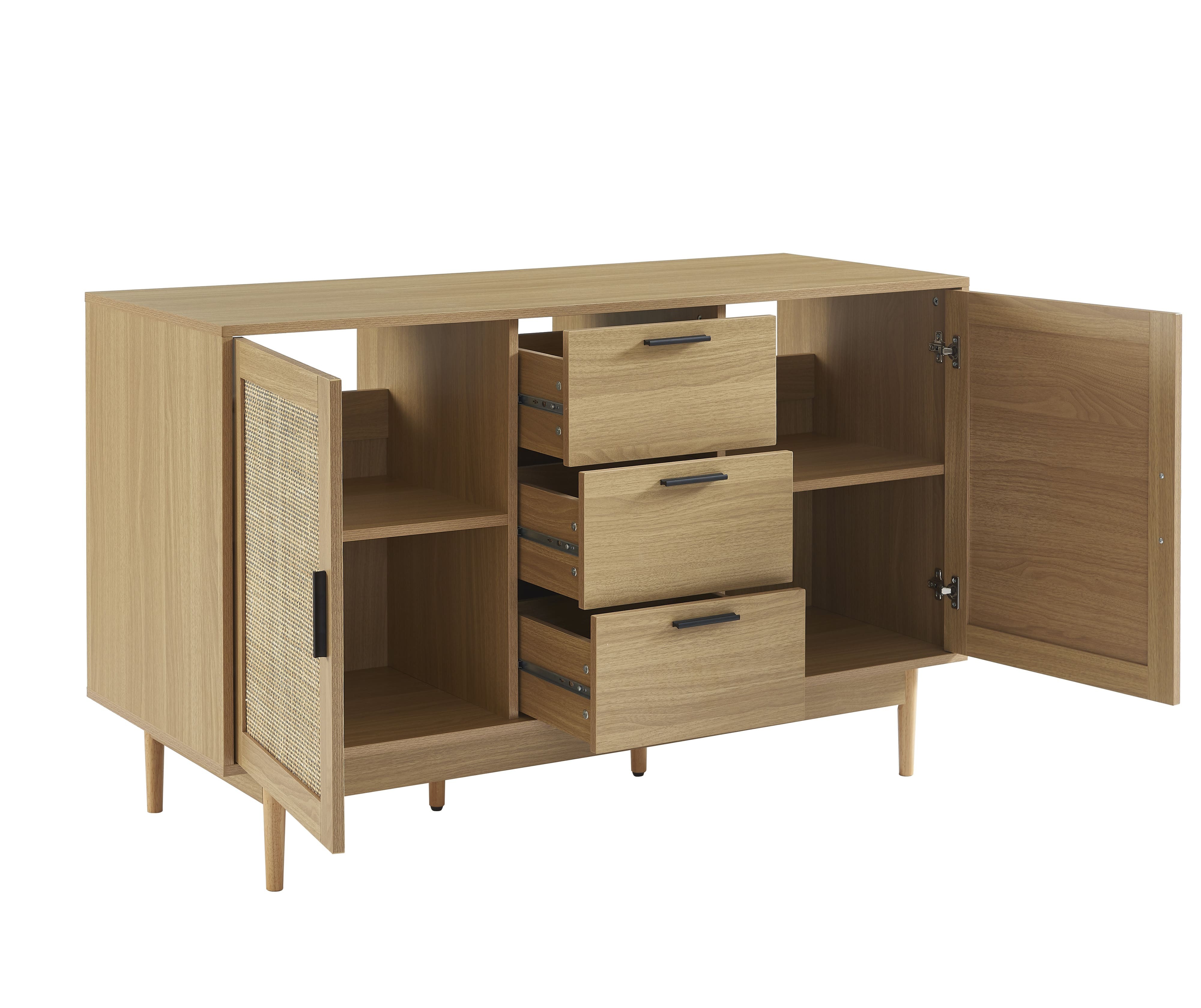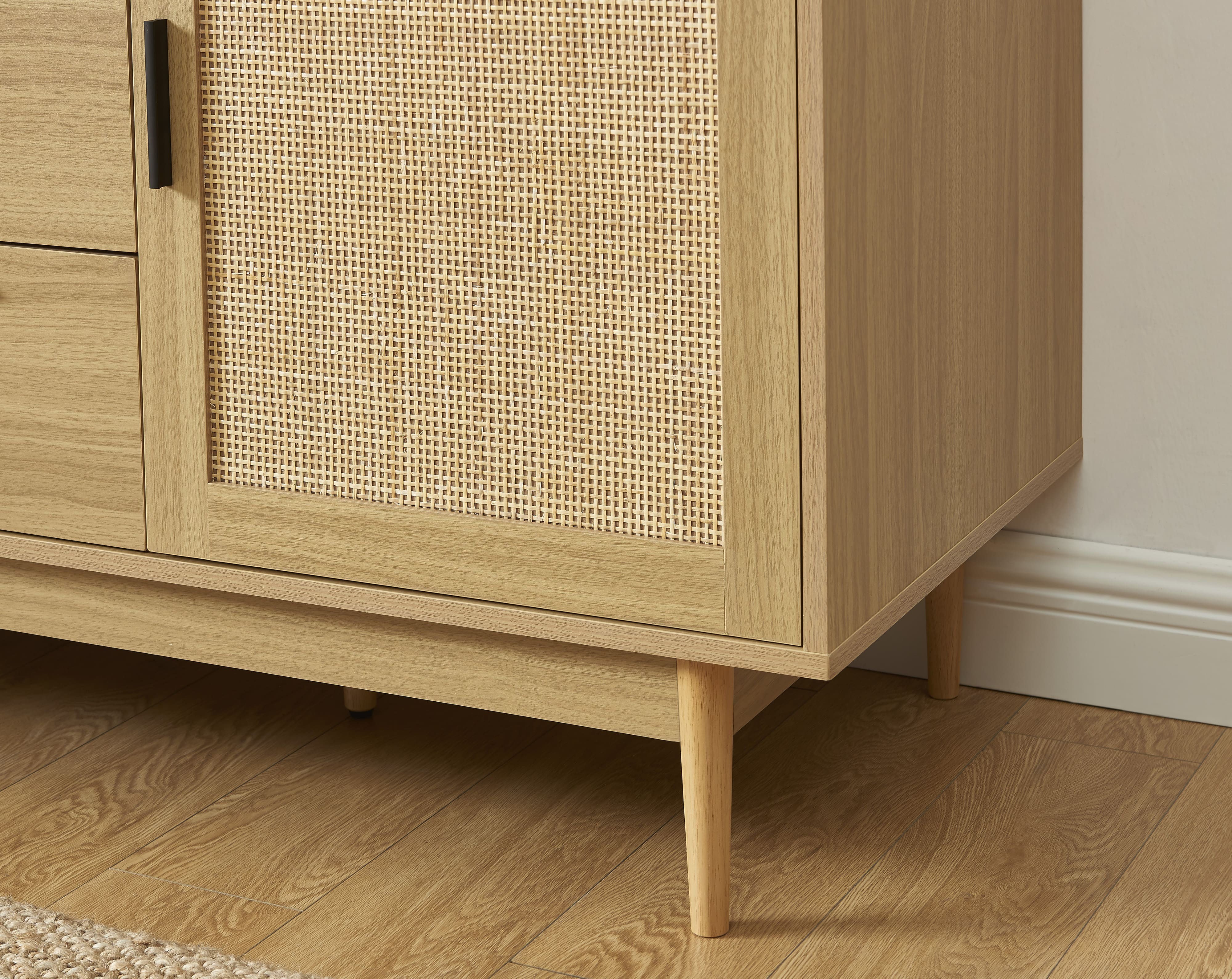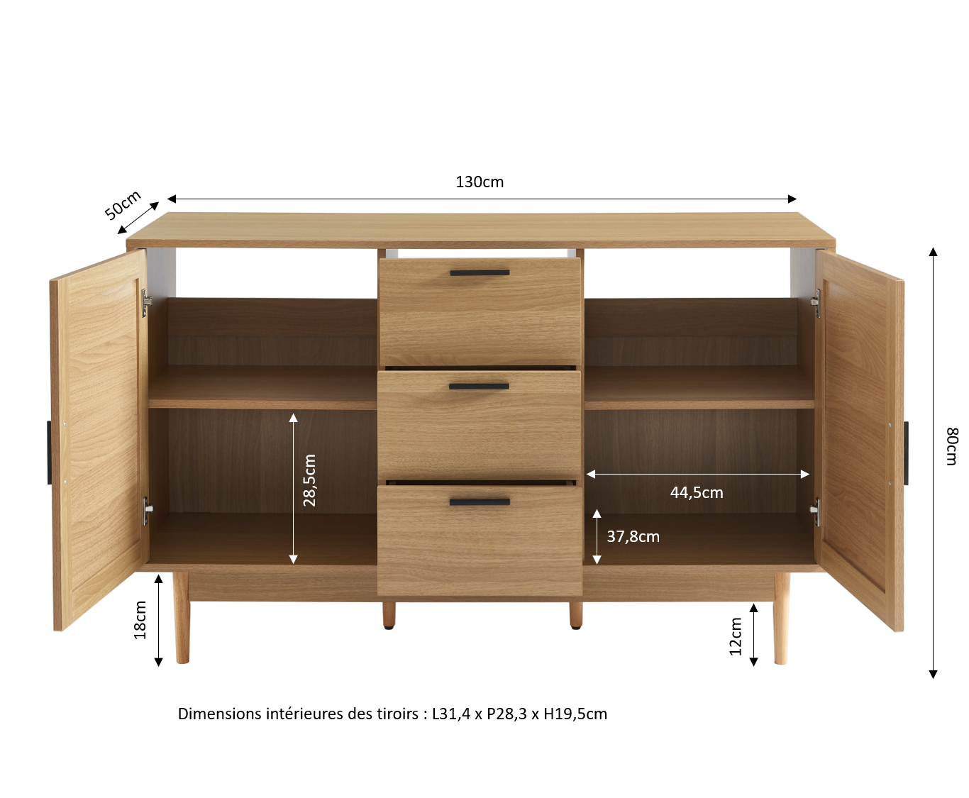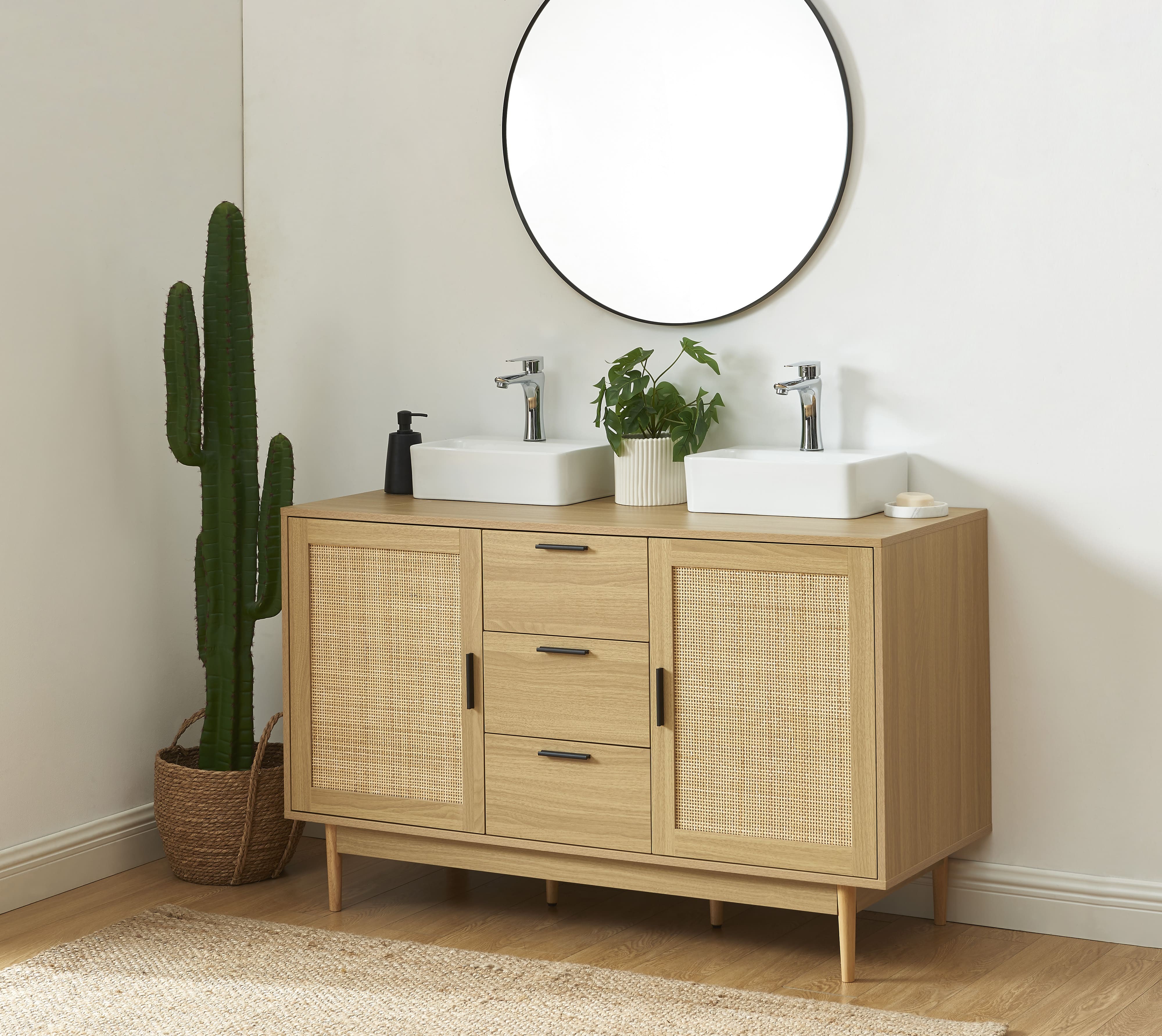 Ce meuble sous-vasque en cannage s'intègre harmonieusement dans une variété de styles de décoration, que ce soit une salle de bain naturelle, moderne ou bohème. Sa finition en effet chêne ajoute une touche de chaleur à votre espace, créant un environnement où vous pourrez vous détendre en toute tranquillité.