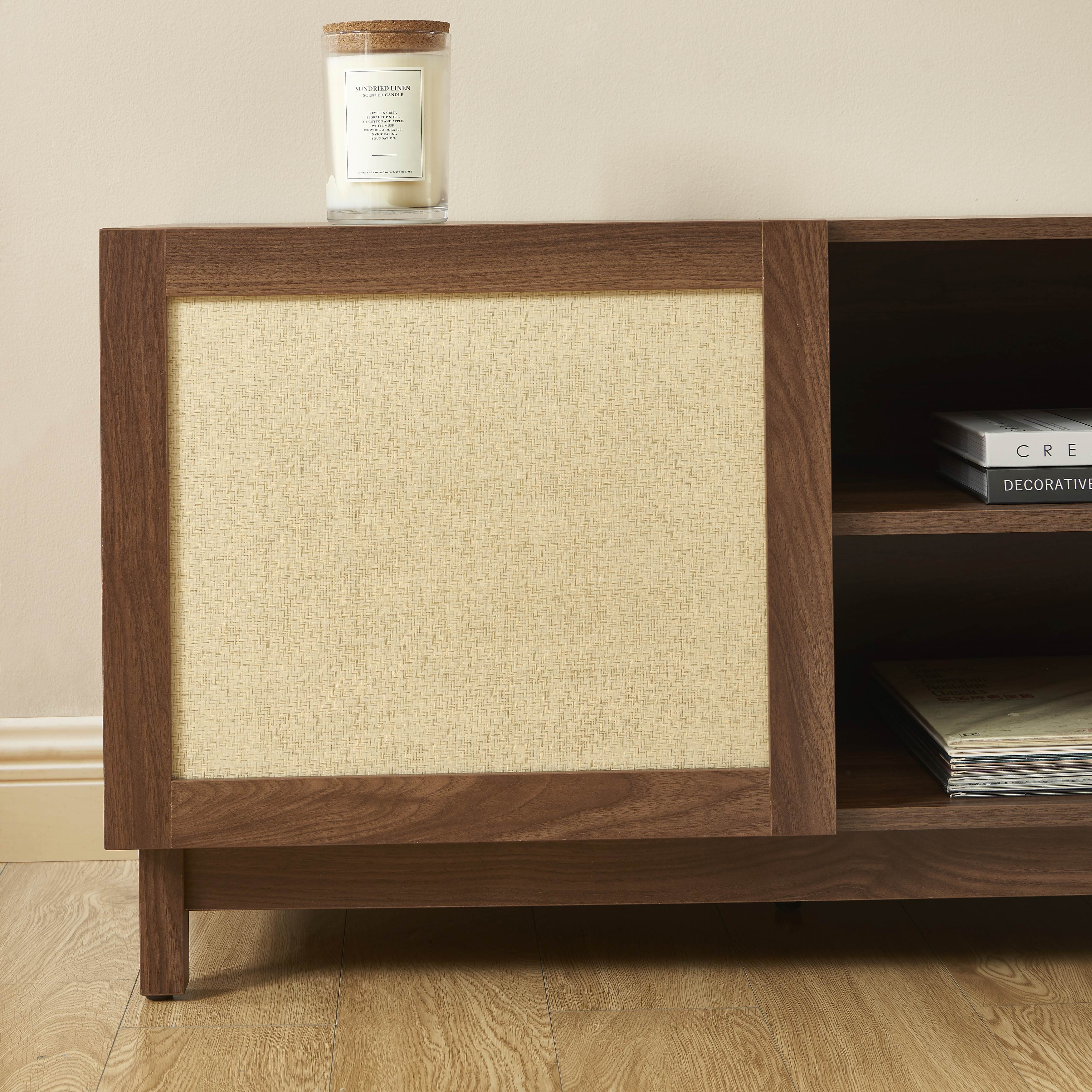 Ajoutez du cachet à votre salon avec le meuble TV HARIA. Son design effet noyer et ses portes en rotin mixent chaleur naturelle et lignes épurées pour un rangement fonctionnel.