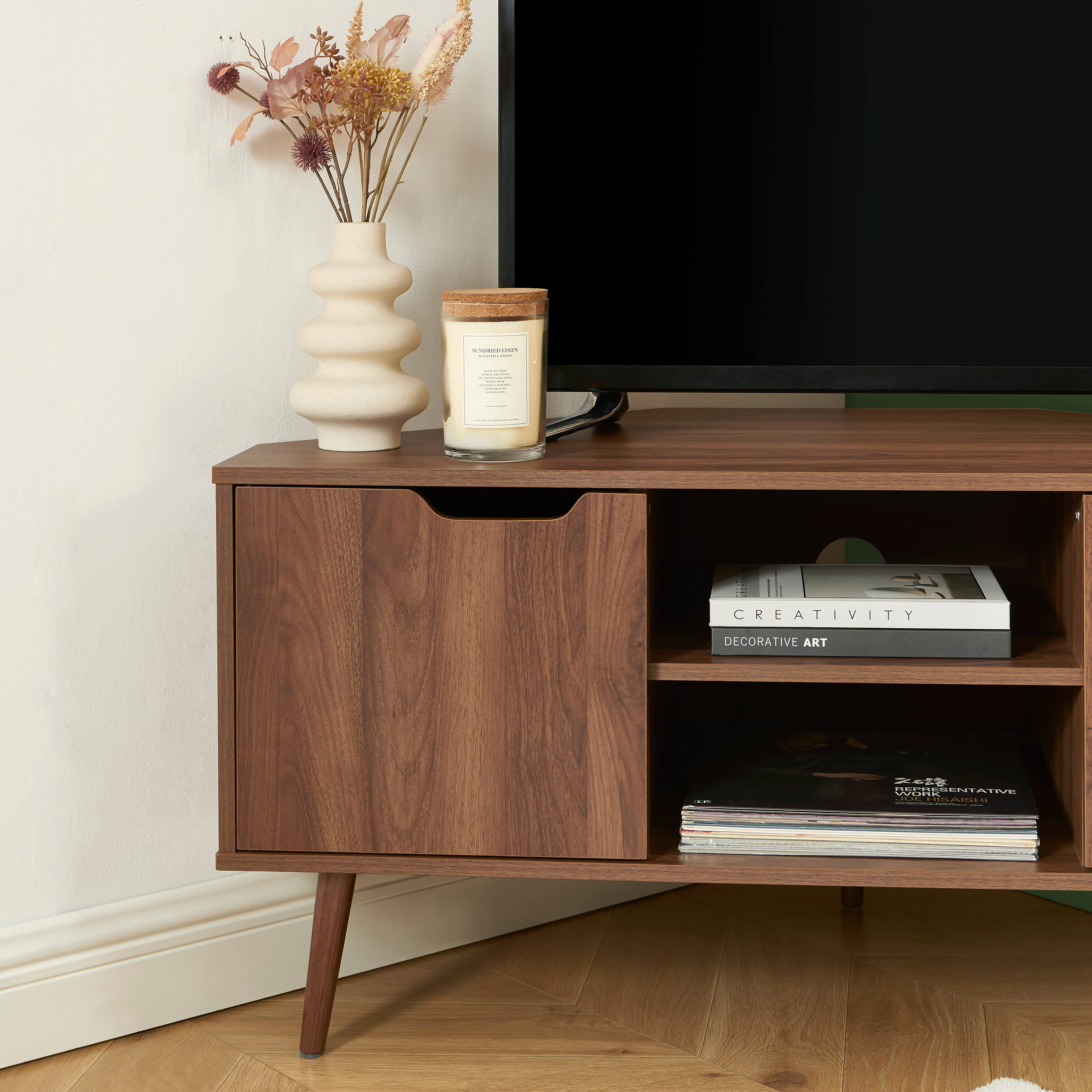 Le meuble TV d'angle LYNA combine un design effet noyer chaleureux et des rangements pratiques pour optimiser l'espace de votre salon.