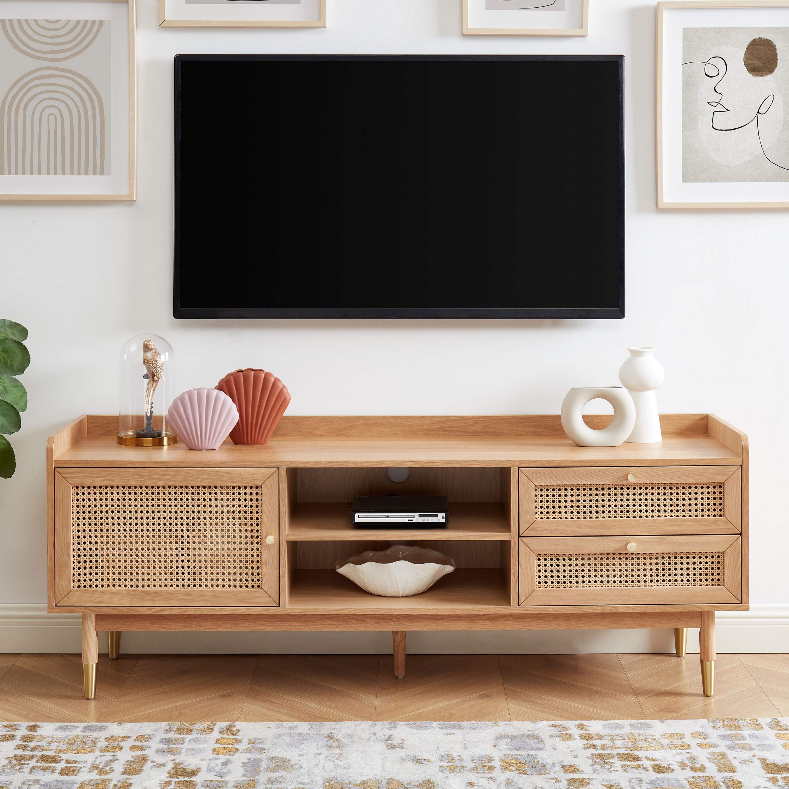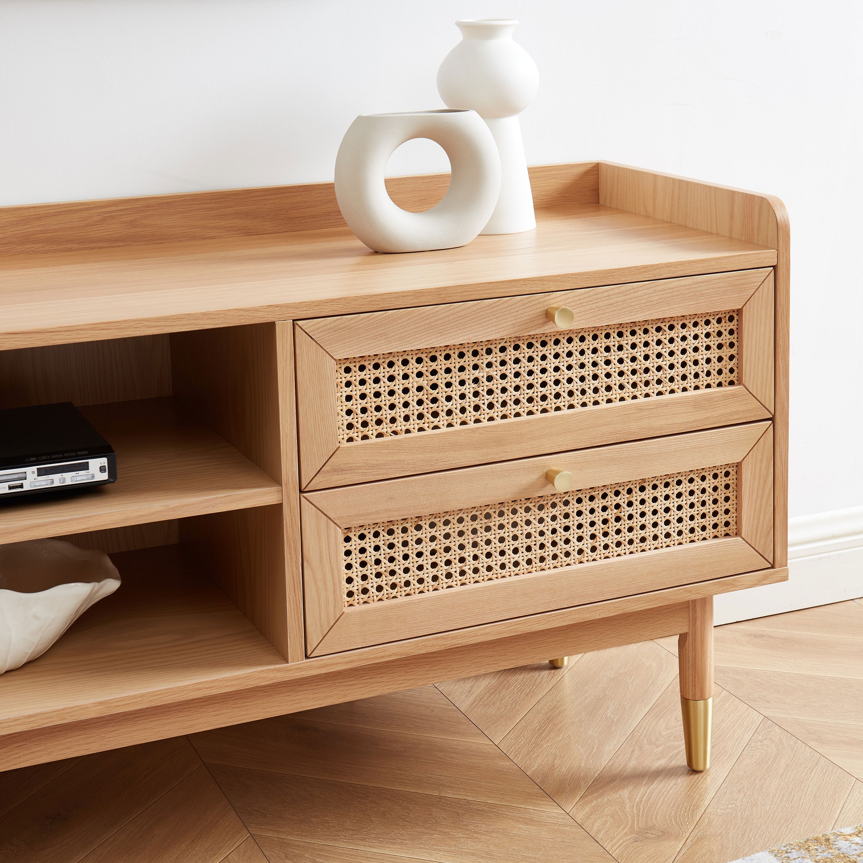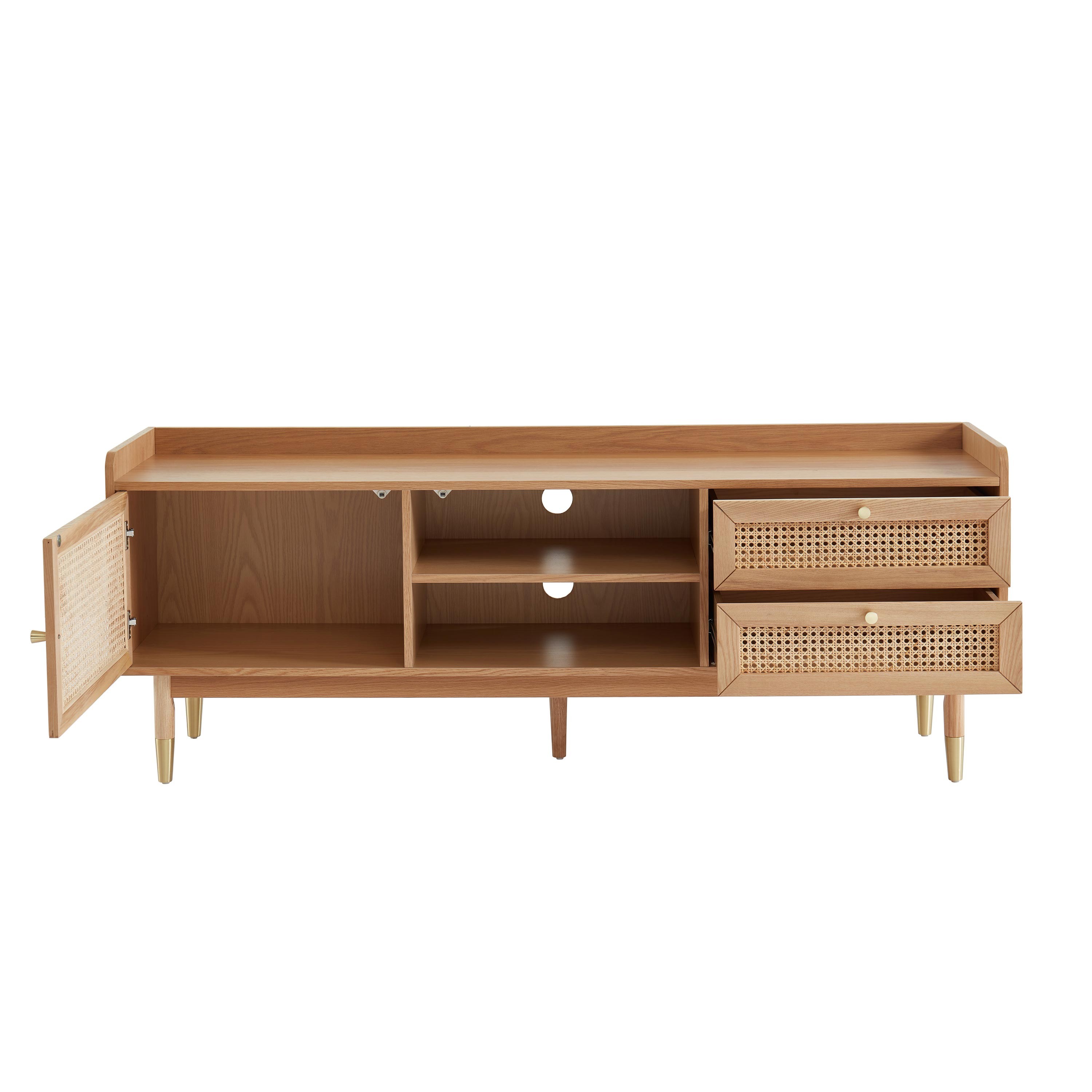 Le cannage revient à la mode cette année ! Alors pourquoi ne pas opter pour notre gamme LÉON et son style rétro ? Avec ce meuble TV en cannage, vous apporterez une touche de modernité à votre intérieur, tout en y ajoutant de nouveaux espaces de rangements. En effet, ce meuble TV en cannage est doté d'1 porte, de 2 tiroirs et de 2 niches ! De quoi y ranger vos livres, vos télécommandes ou encore vos chargeurs. Pour finir, le meuble TV LÉON possède également des emplacements dédiés aux passages de câbles.