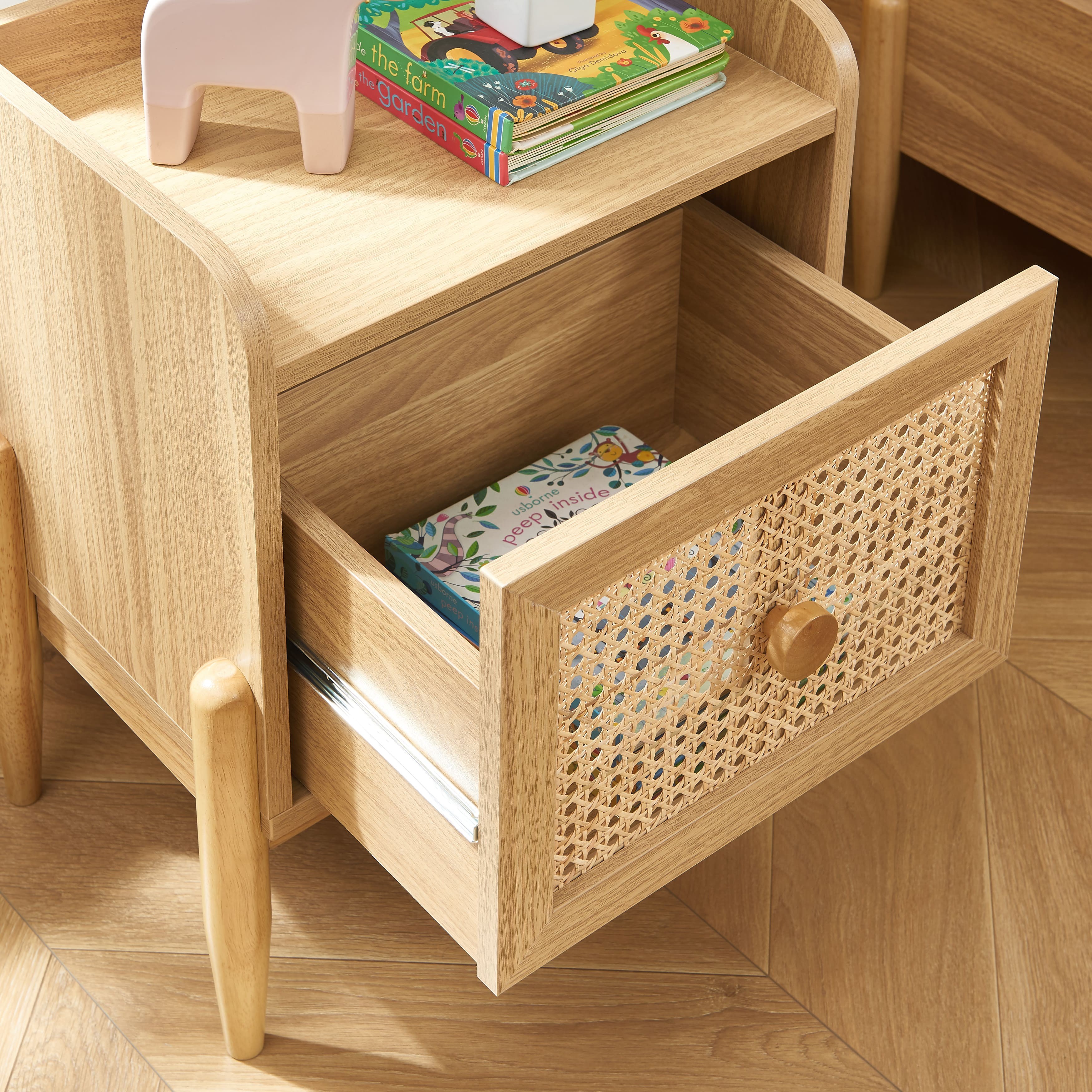 La table de chevet PABLO est dotée d'un tiroir spacieux en cannage rotin, offrant un espace de rangement pratique pour les pyjamas, les livres d'histoires, les peluches ou les petits secrets de votre enfant. Le tiroir, facile à ouvrir et à fermer, permet à votre enfant d'accéder facilement à ses affaires.