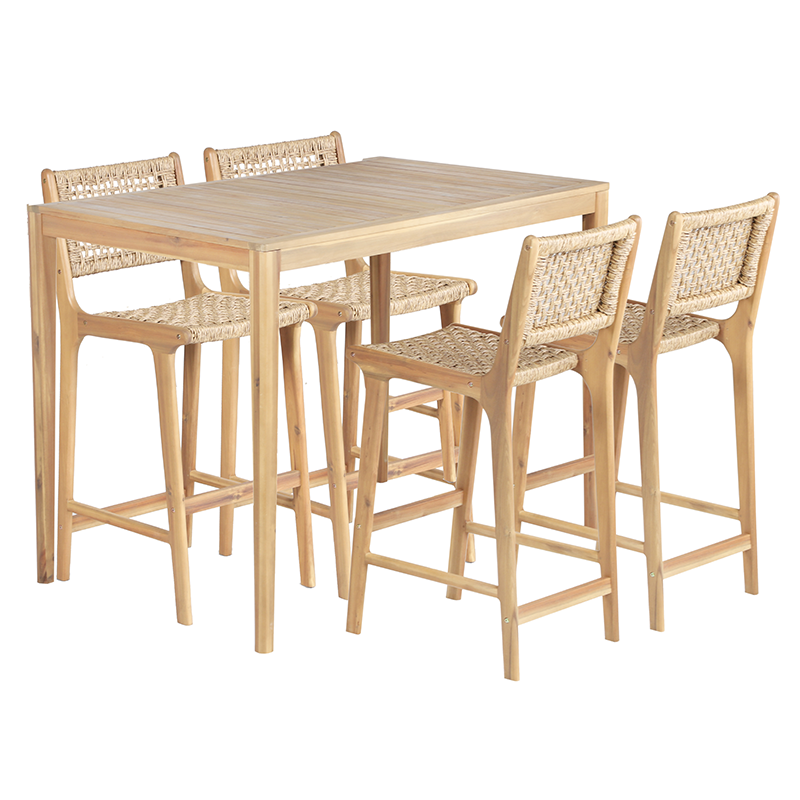 La table de bar haute KUTA de la collection BEAU RIVAGE® présente une structure en bois d'acacia blanchi, entièrement certifié FSC.
