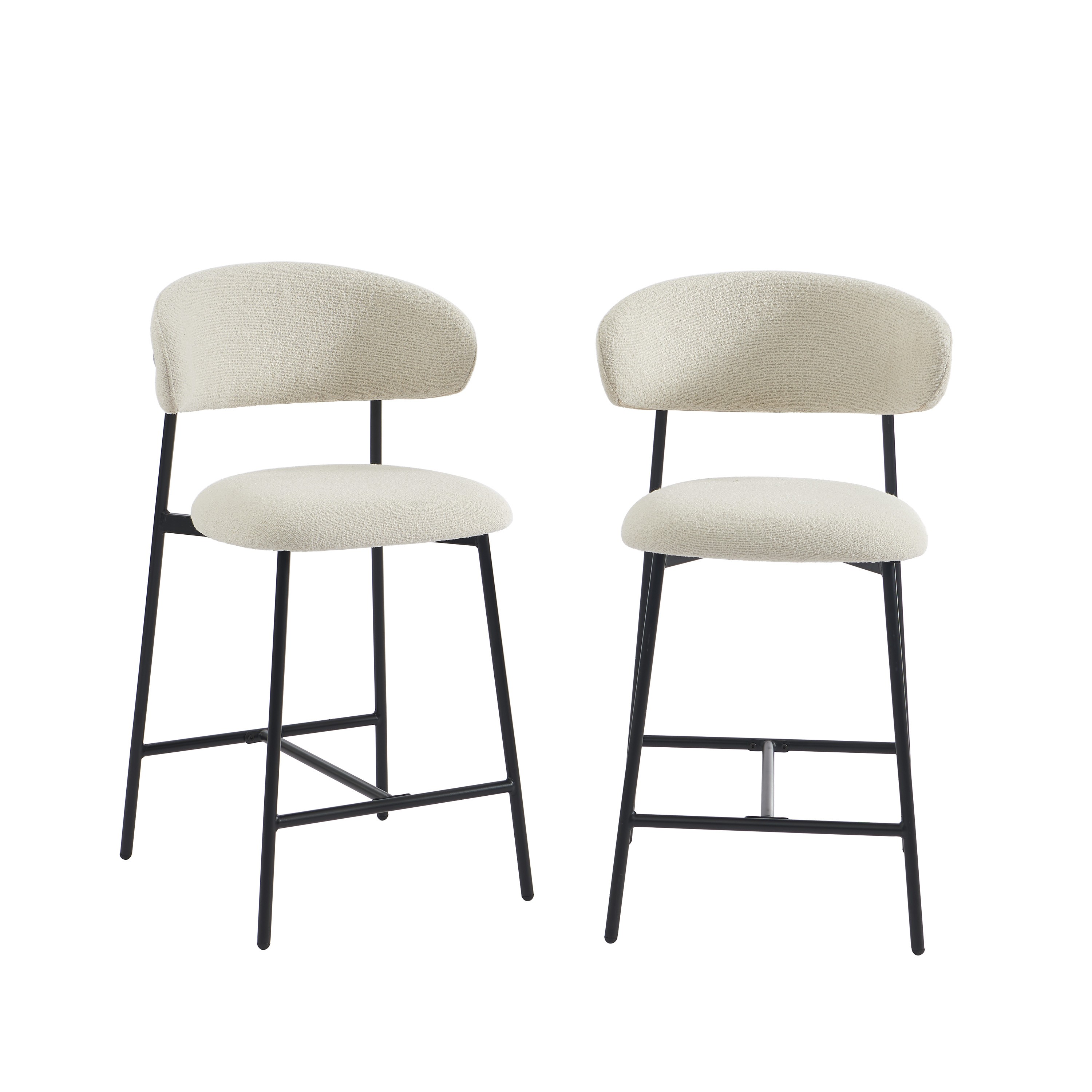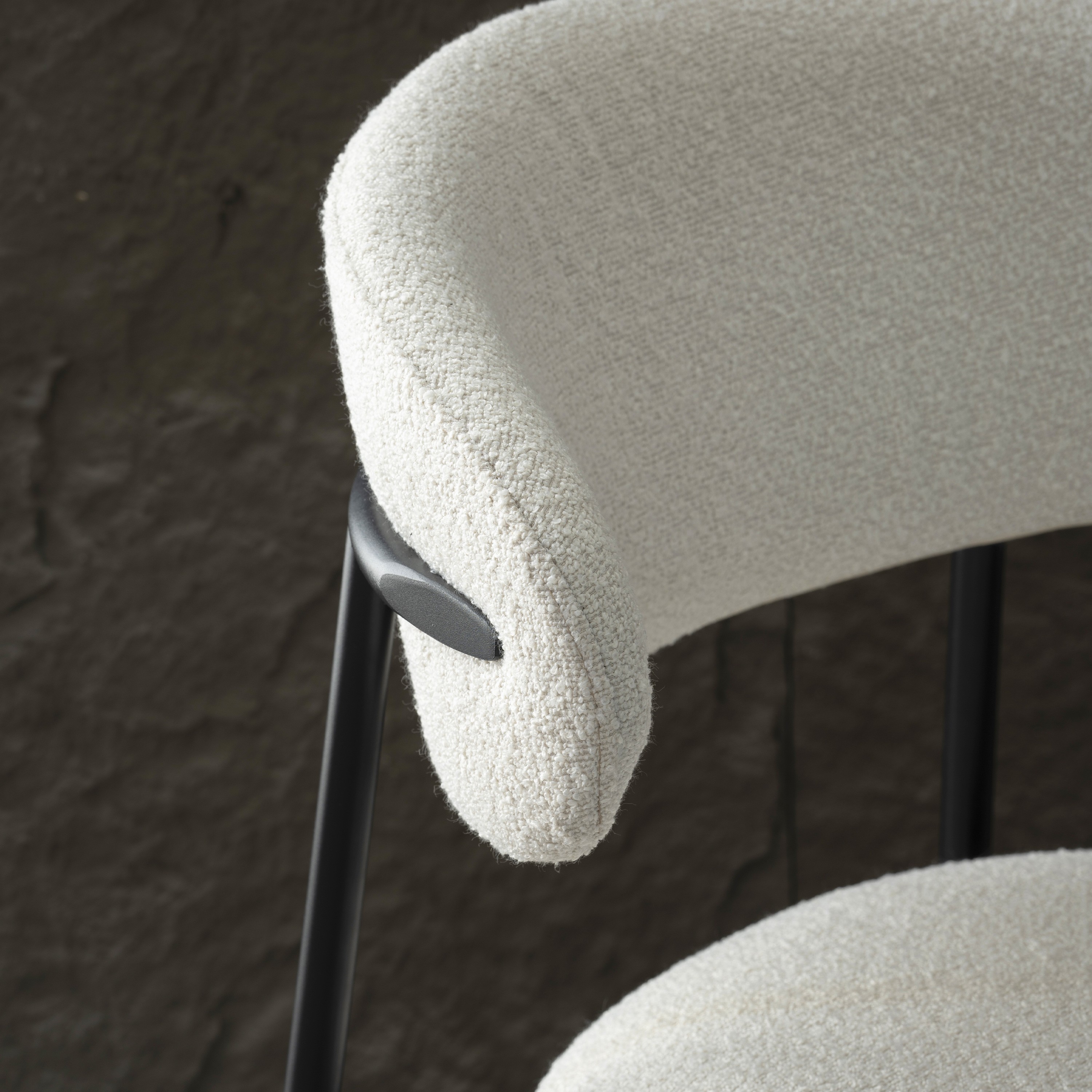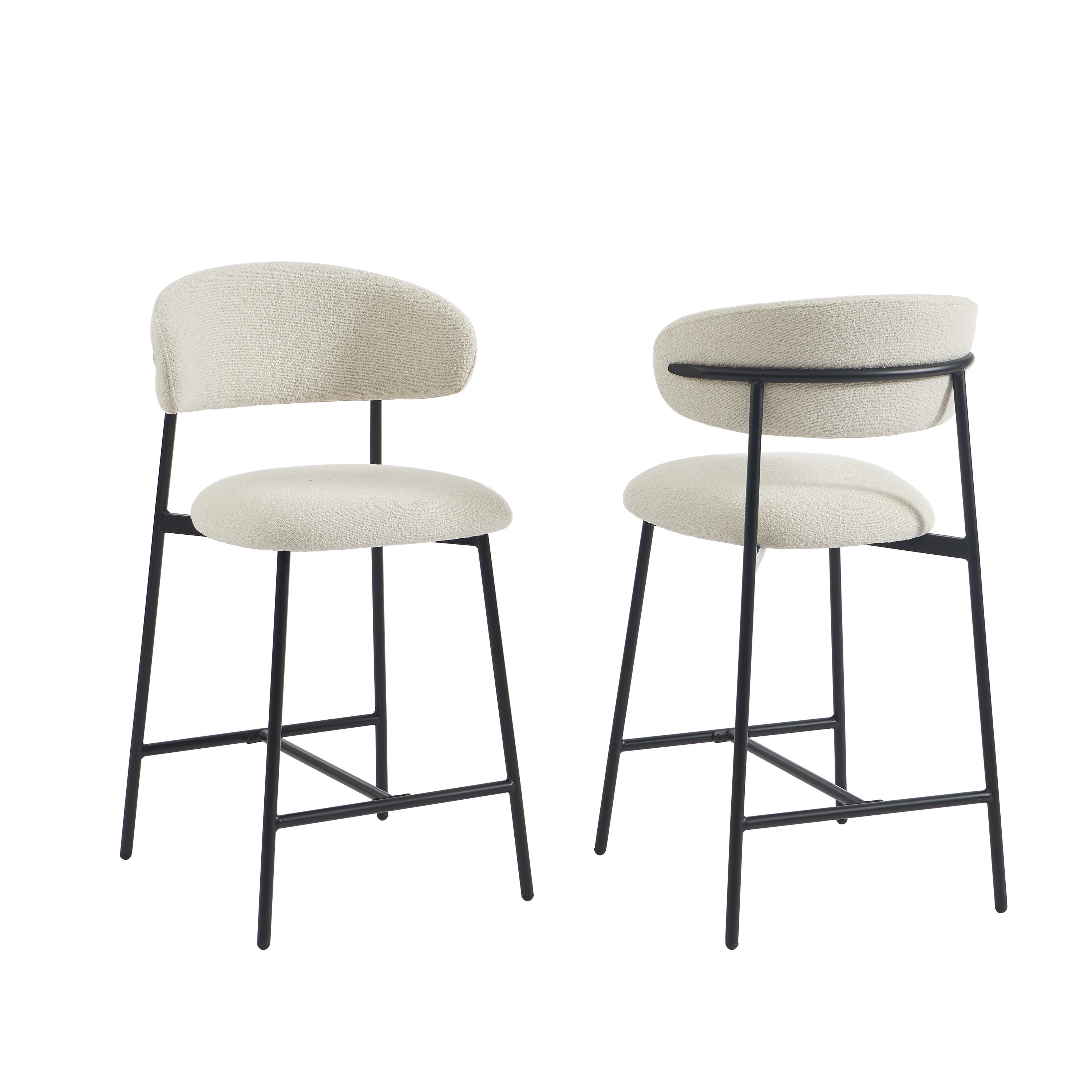 Les tabourets GALLY se distinguent par leurs lignes arrondies et leur tissu élégant. Leur dossier légèrement incurvé offre une allure sophistiquée tout en garantissant un bon maintien du dos. L'association du tissu texturé et du piètement en métal noir crée un contraste moderne et intemporel, parfait pour sublimer votre cuisine ou votre coin bar.