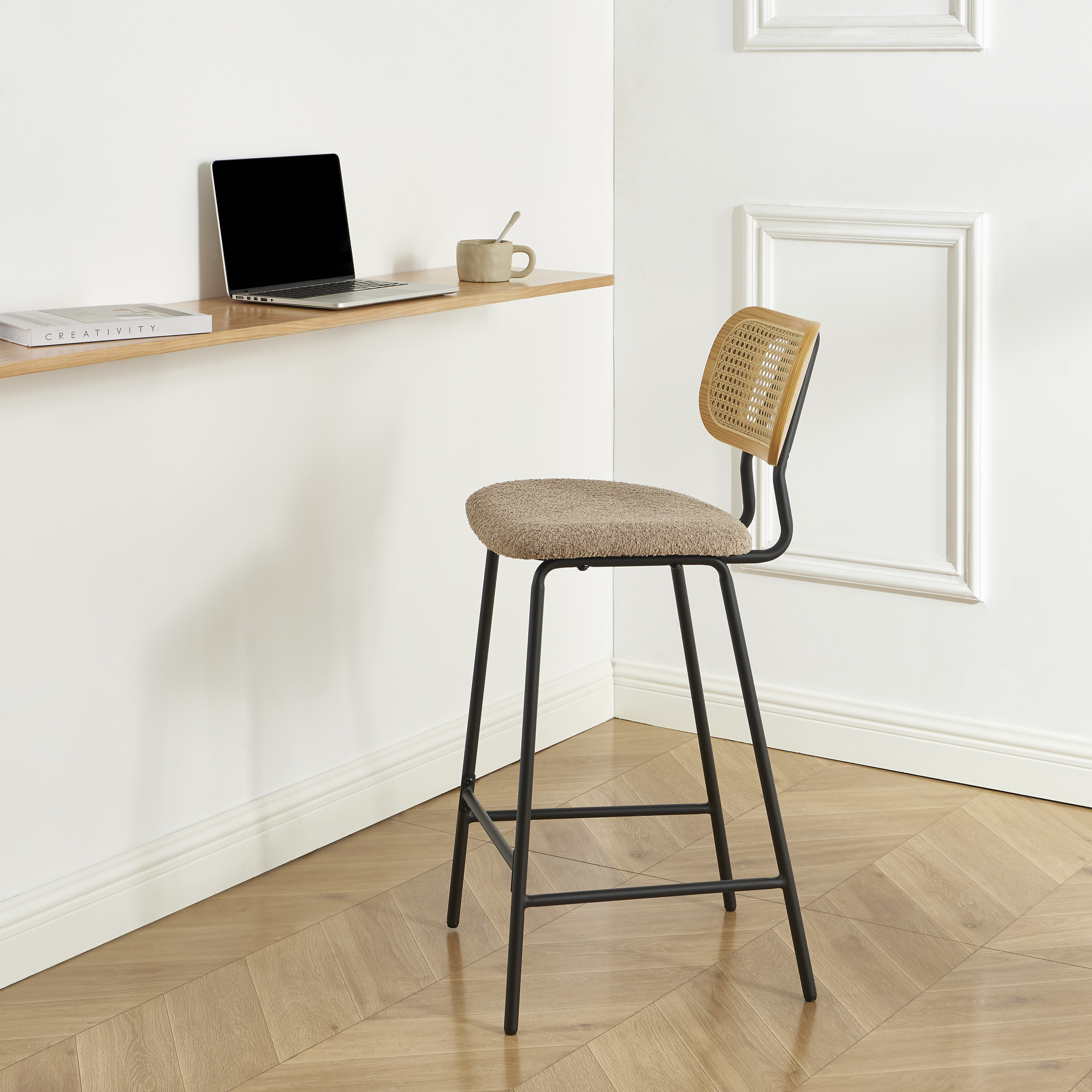 Les tabourets TINA mêlent avec élégance des matières actuelles et naturelles : le tissu bouclette apporte de la douceur, tandis que le dossier en cannage rotin donne un charme authentique et un esprit bohème à l'ensemble.