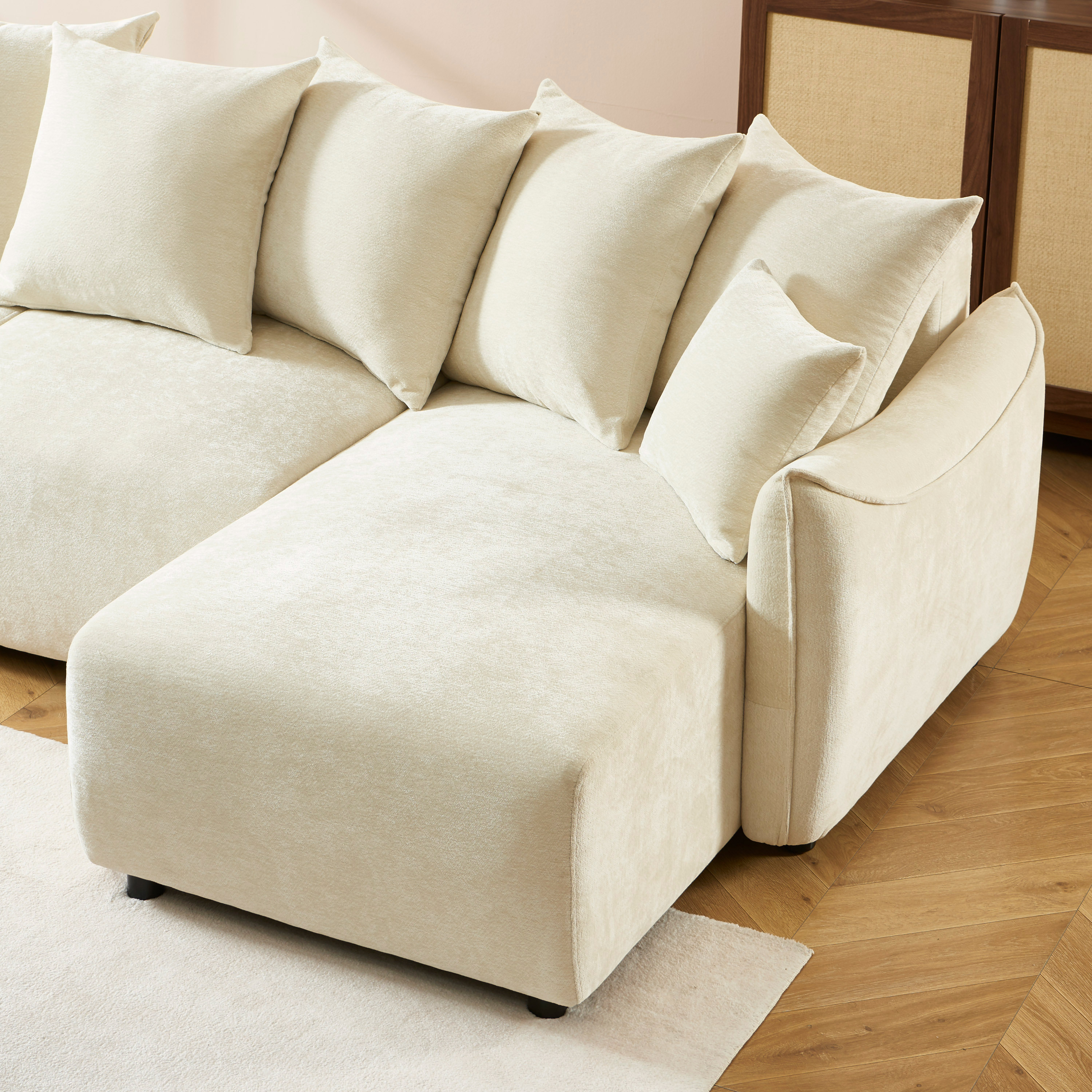 Il divano angolare OPALINE offre 4 comodi posti a sedere, una superficie di riposo di 140x200 cm e un angolo reversibile, ideale per creare un salotto accogliente e ultra-pratico.