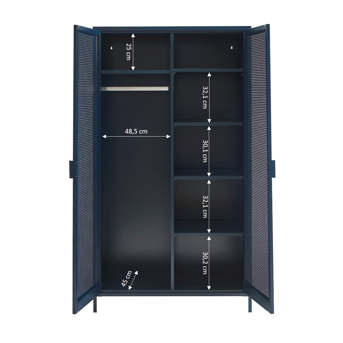 Con le sue dimensioni L100 x P50 x H180 cm, questo armadio offre un ampio volume di archiviazione pur mantenendo una silhouette pulita. Le sue due ante metalliche consentono di nascondere facilmente vestiti, accessori o oggetti di uso quotidiano, per un interno perfettamente organizzato.