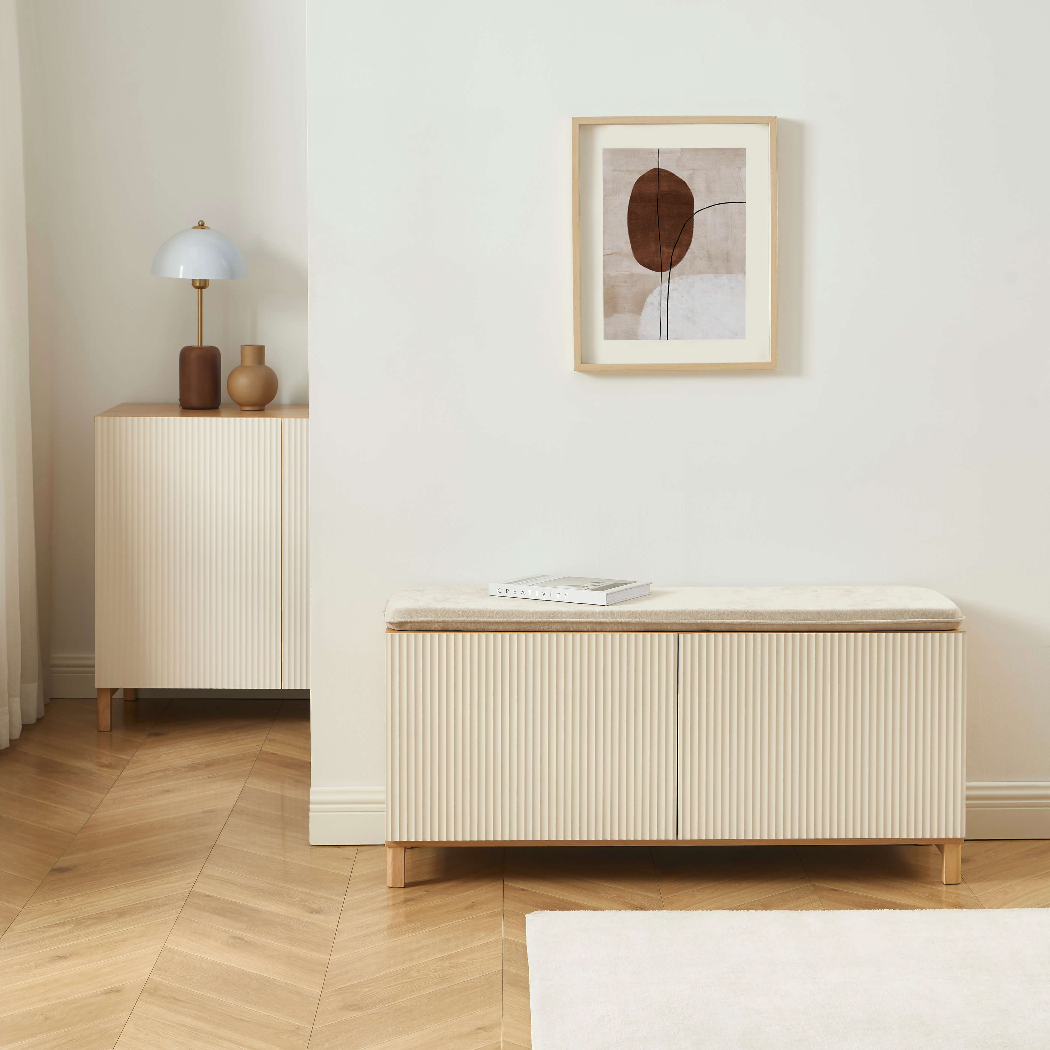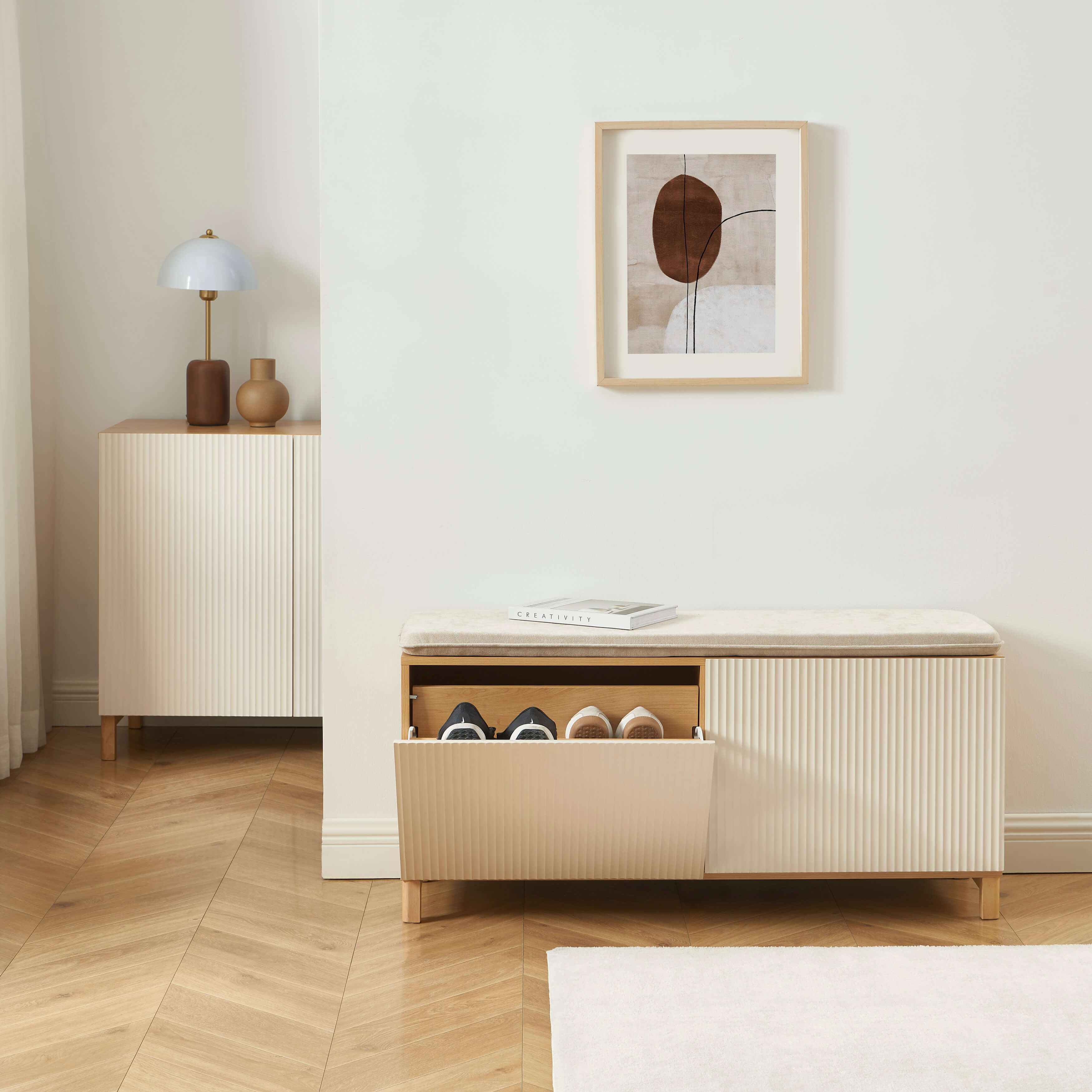 Con il suo rivestimento effetto rovere e il cuscino beige, la panca porta scarpe ORCA si integra facilmente in un ingresso moderno, scandinavo o più classico. Unisce comfort e funzionalità per semplificare la vostra vita quotidiana. Il cuscino in tessuto beige, non fissato al mobile, offre un comfort apprezzabile per indossare o togliere le scarpe. Inoltre, dona un tocco decorativo morbido e naturale al vostro ingresso.
