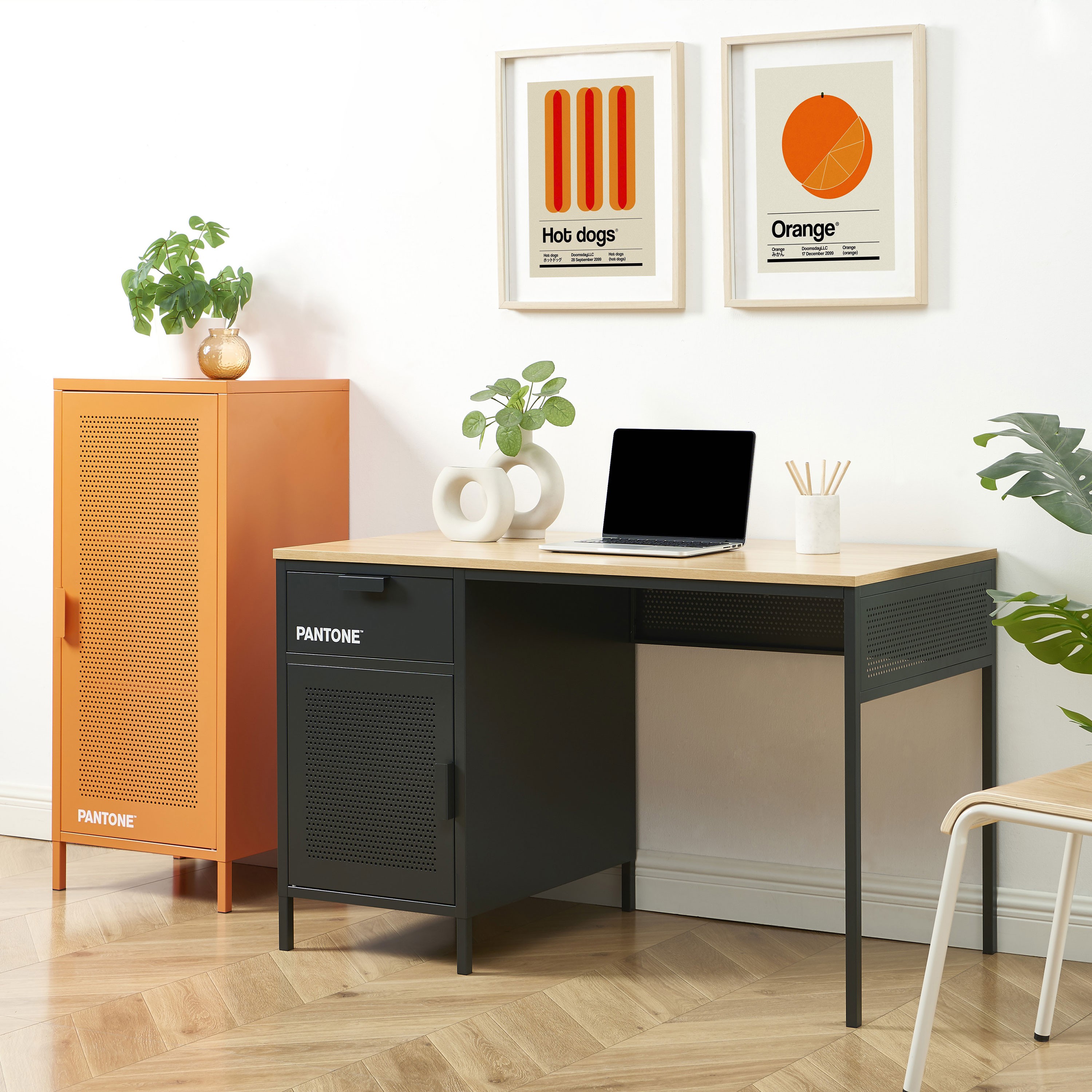 La struttura in metallo garantisce una durata eccezionale, aggiungendo al contempo un tocco industriale sofisticato. Il cassetto e l'anta integrati offrono uno spazio di archiviazione intelligente per mantenere il tuo spazio di lavoro organizzato e impeccabile. Le nostre scrivanie PANTONE ti danno accesso a colori eccezionali per perfezionare i tuoi interni.