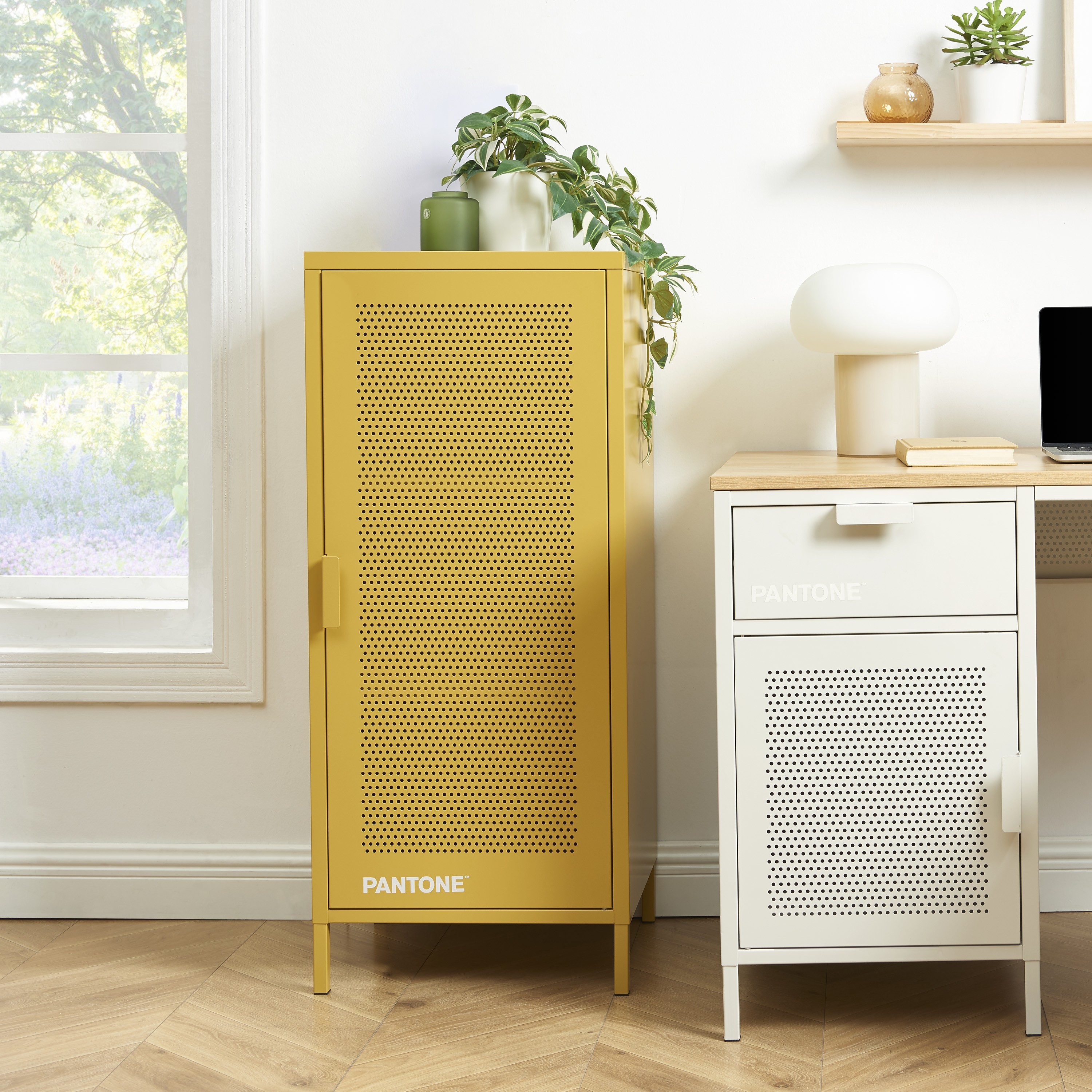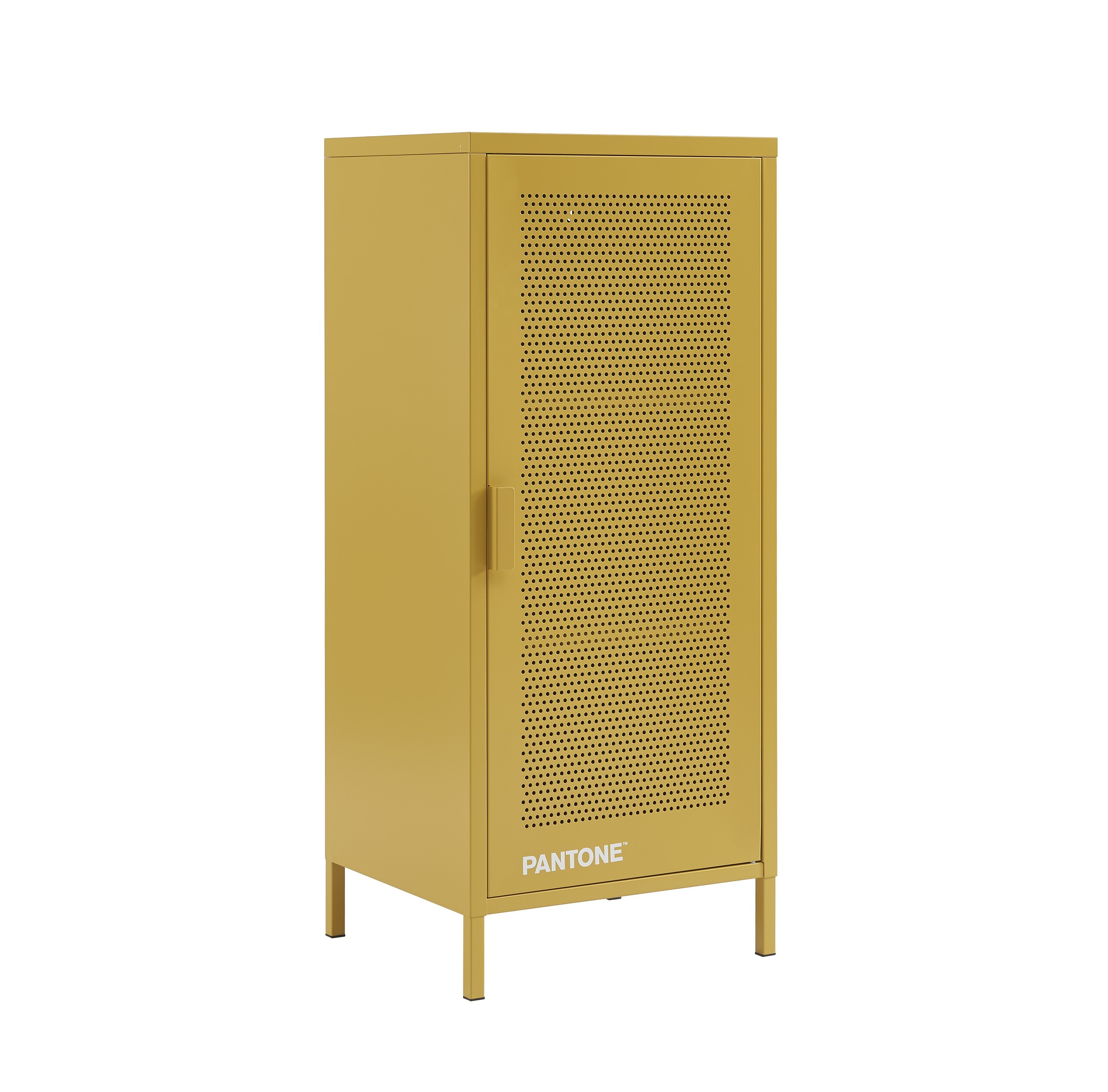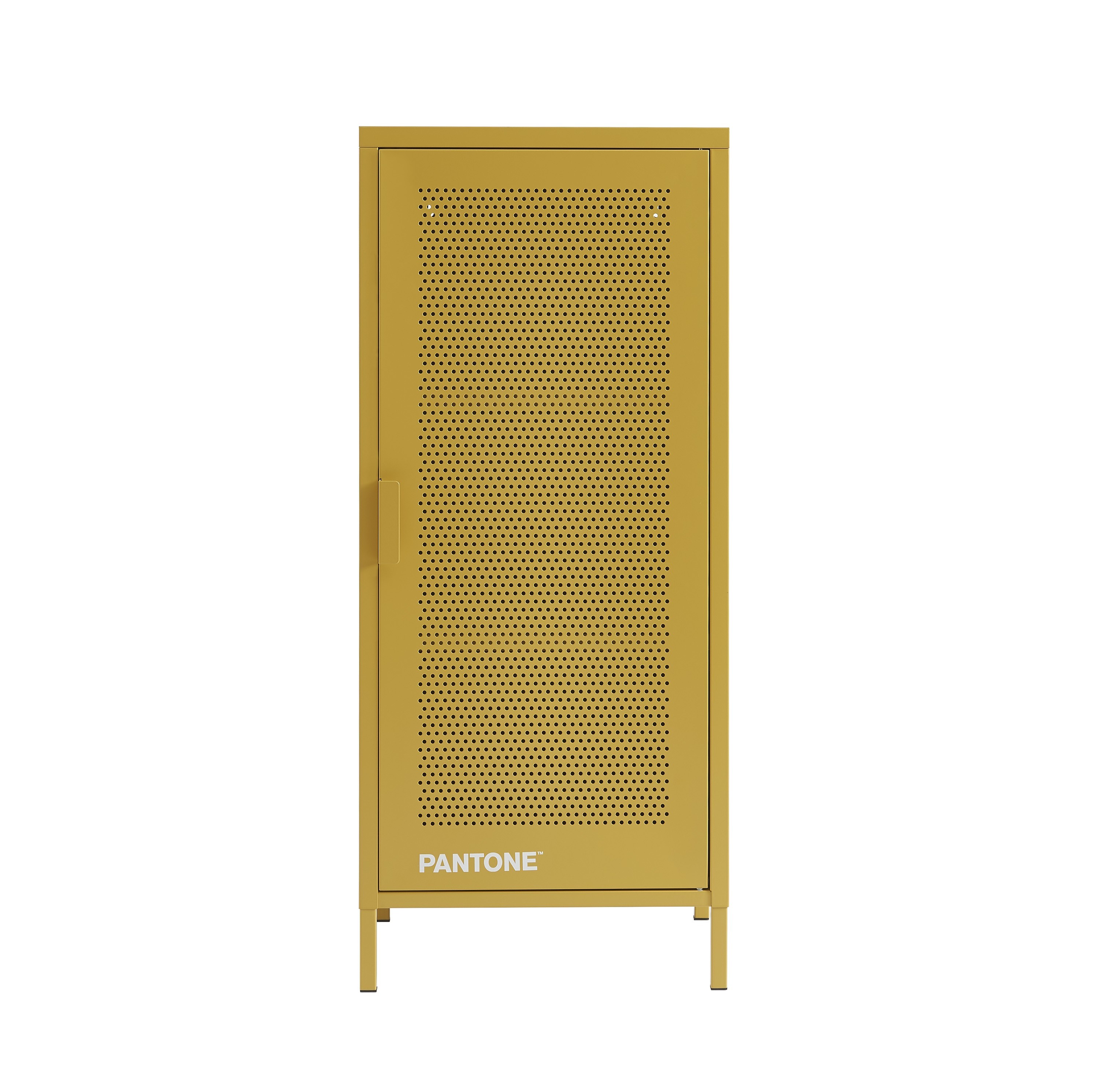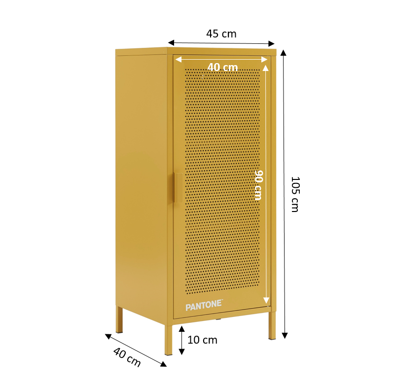 L'anta in acciaio traforato dell'armadio PANTONE esalta ulteriormente lo stile industriale, mentre le gambe in metallo ne garantiscono la stabilità.