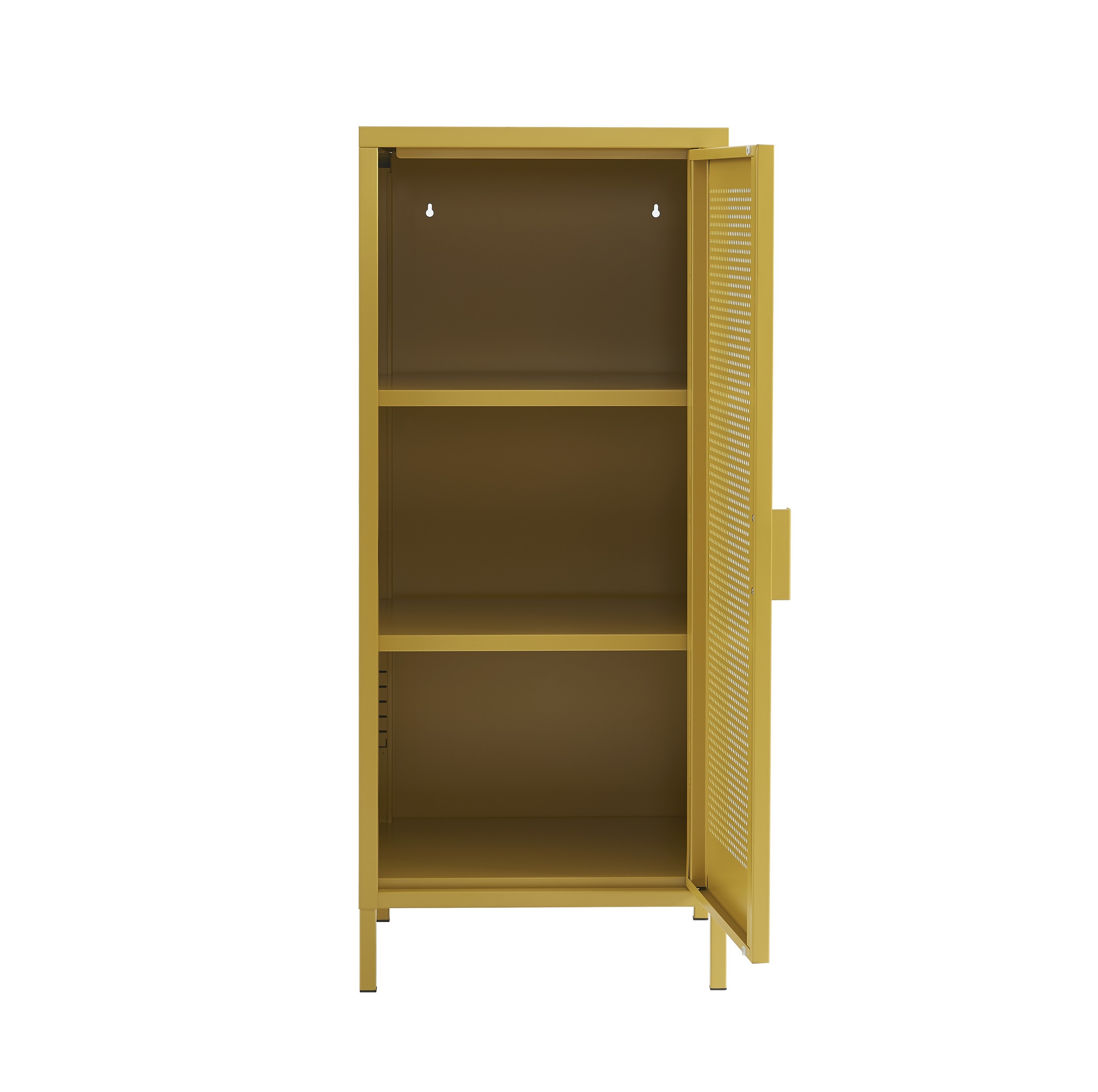 Misurando 105 cm di altezza, questo mobile alto offre generoso spazio per riporre una varietà di oggetti, da libri e riviste a oggetti decorativi e forniture per ufficio. Inoltre, all'interno, due ripiani in metallo dividono lo spazio di archiviazione in tre scomparti uguali, offrendo uno spazio organizzato.