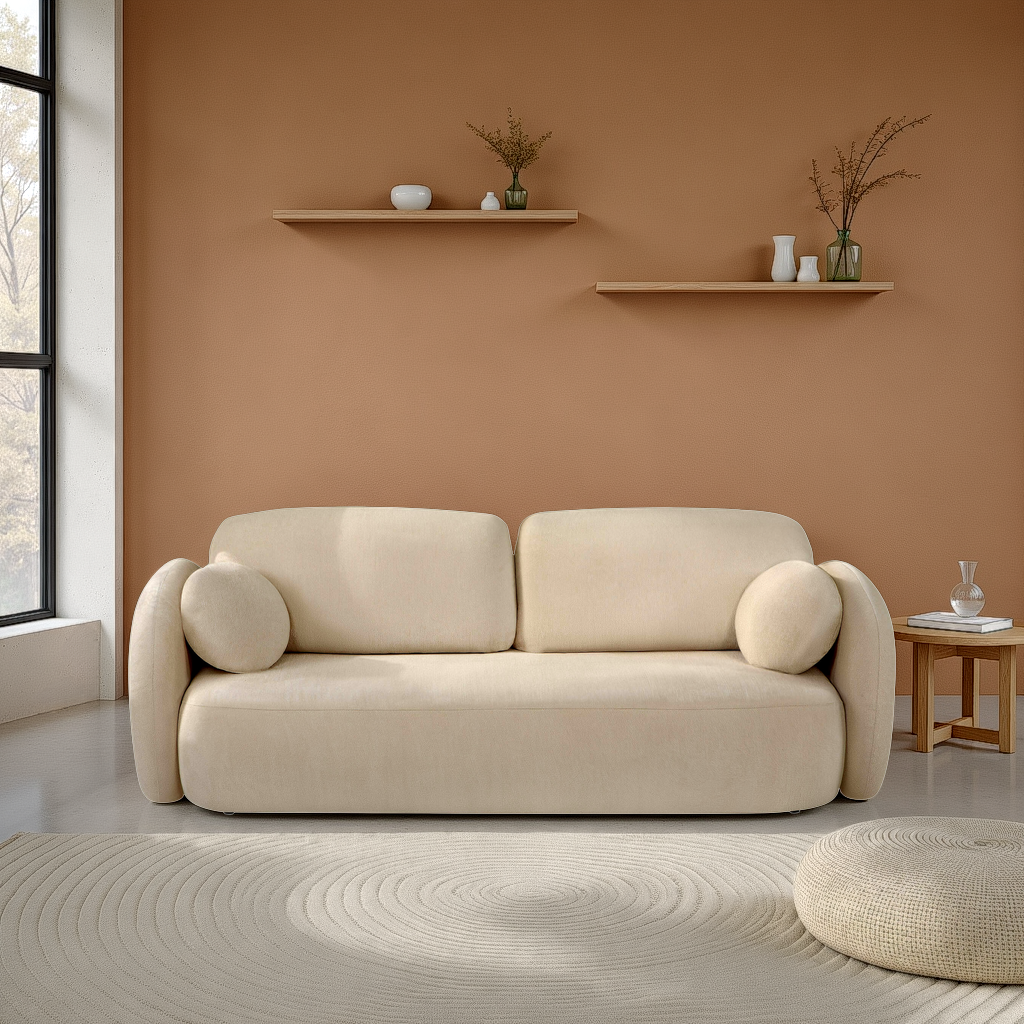Con le sue linee arrotondate e il morbido tessuto bouclé, il divano CARLOTTA unisce stile, comfort e praticità. Convertibile con contenitore integrato, ti accompagna nella vita di tutti i giorni.