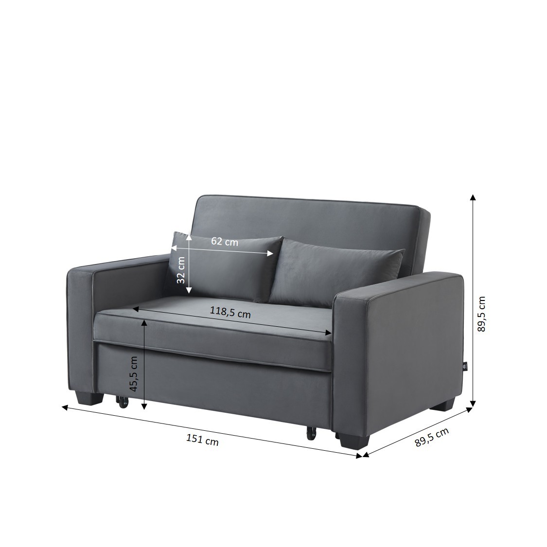 Divano letto lineare LENA a 2 posti in velluto grigio. Dimensioni del divano: 150 x 88 x 88 cm. Dimensioni della superficie di riposo: 120 x 190 cm.
