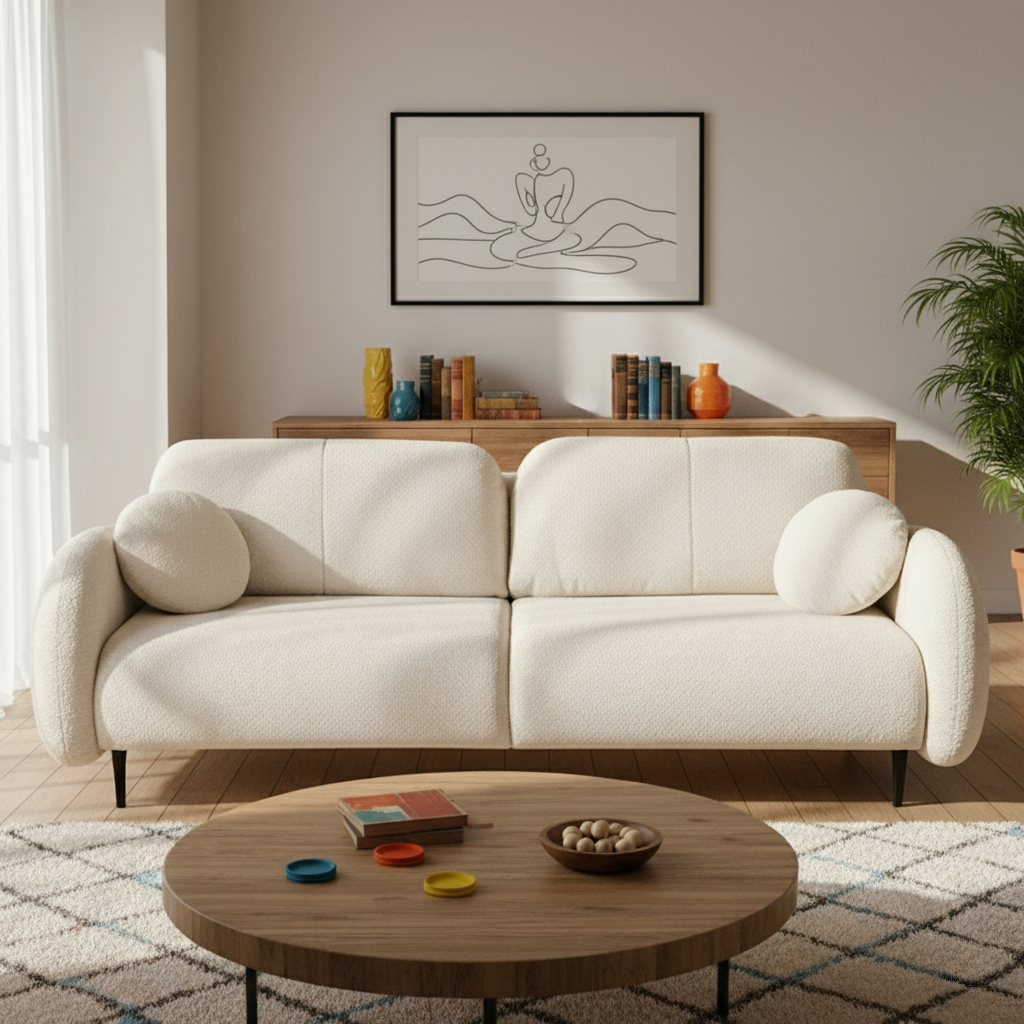 Il divano CARINO seduce per il suo design dalle linee morbide e arrotondate, che creano un'atmosfera calda e accogliente. Il rivestimento in tessuto bouclé accentua questo effetto cocooning, aggiungendo un tocco contemporaneo al vostro arredamento. Grazie al suo stile versatile, trova facilmente posto in un interno moderno come in un ambiente più accogliente.