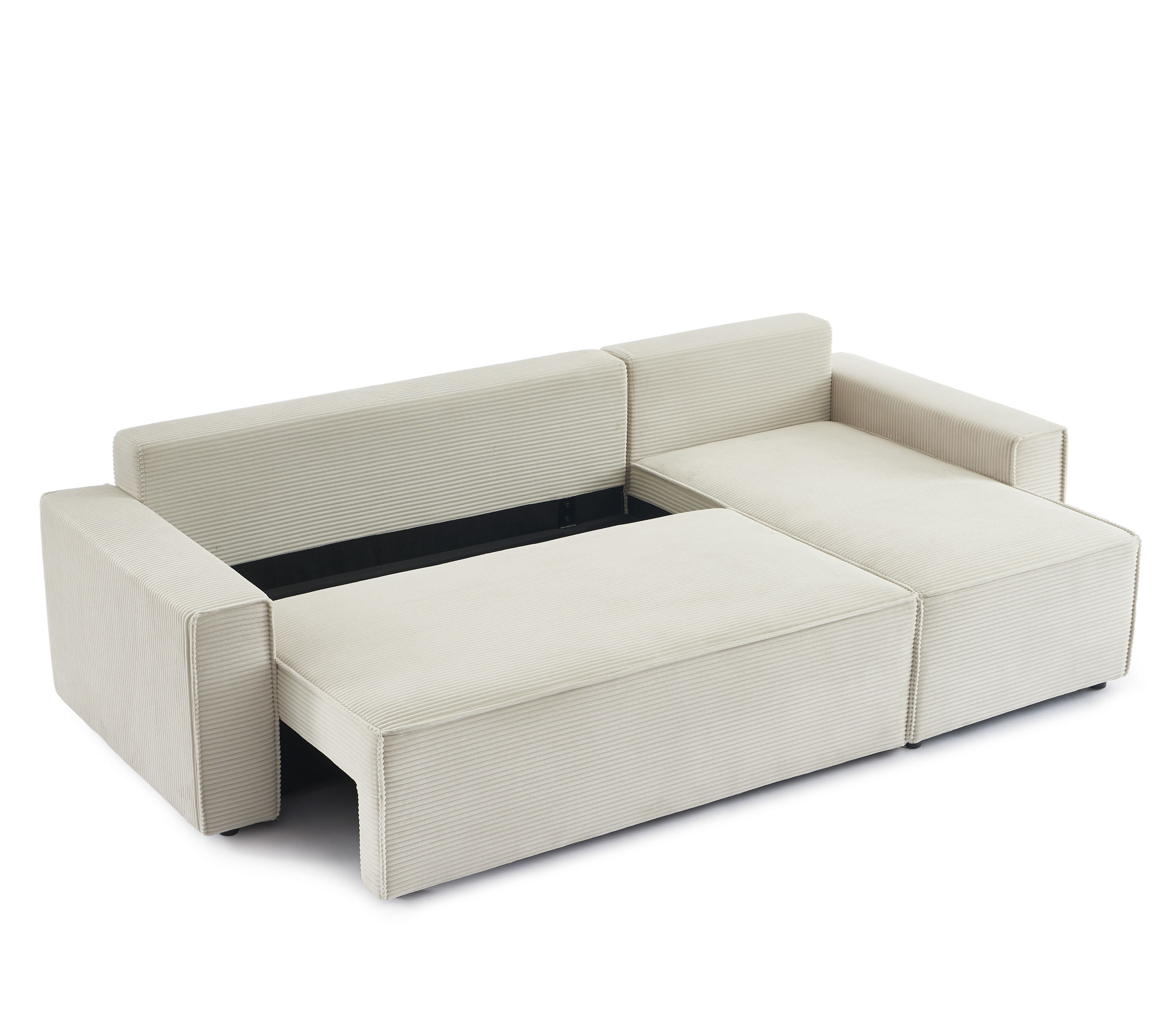 Il divano ZOLA si adatta alle vostre esigenze e al vostro spazio. Il suo angolo reversibile consente di posizionare la chaise longue a sinistra o a destra, a seconda delle vostre esigenze. Inoltre, la sua funzione convertibile permette di trasformarlo rapidamente in un letto aggiuntivo di 140 x 210 cm, perfetto per ospitare familiari e amici in tutta semplicità. Sotto la seduta troverete un vano contenitore, ideale per riporre cuscini e plaid.