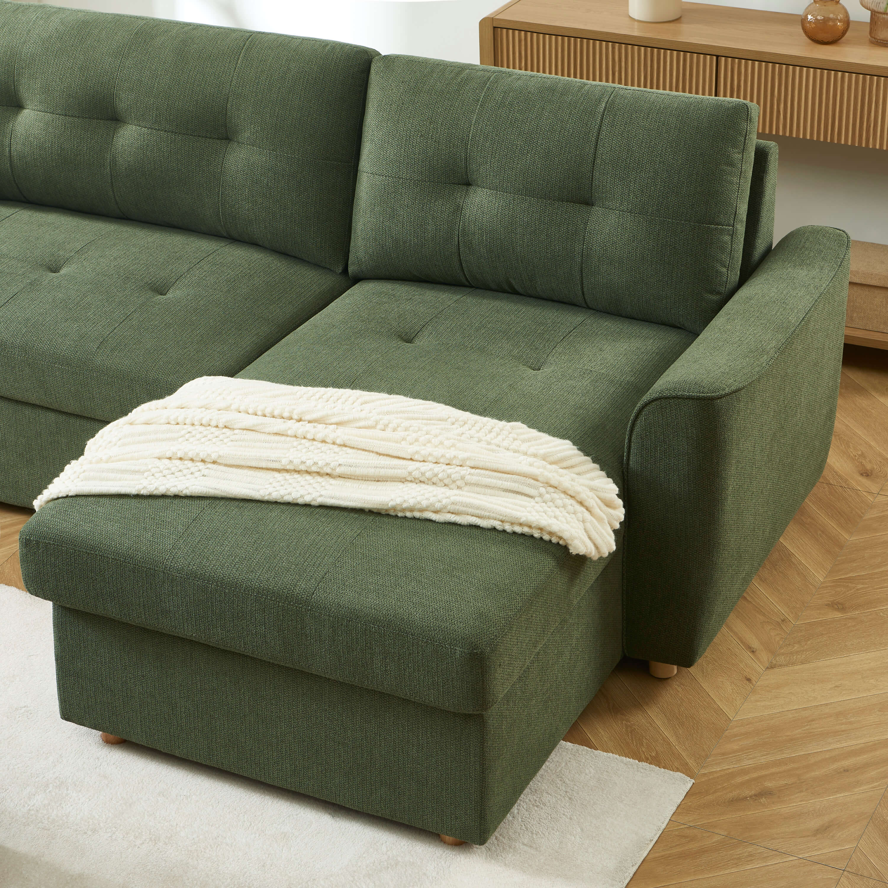 Il divano angolare TAMARA unisce stile e praticità: un divano a 4 posti convertibile e reversibile, pensato per offrire uno spazio conviviale di giorno e un comodo letto di notte.