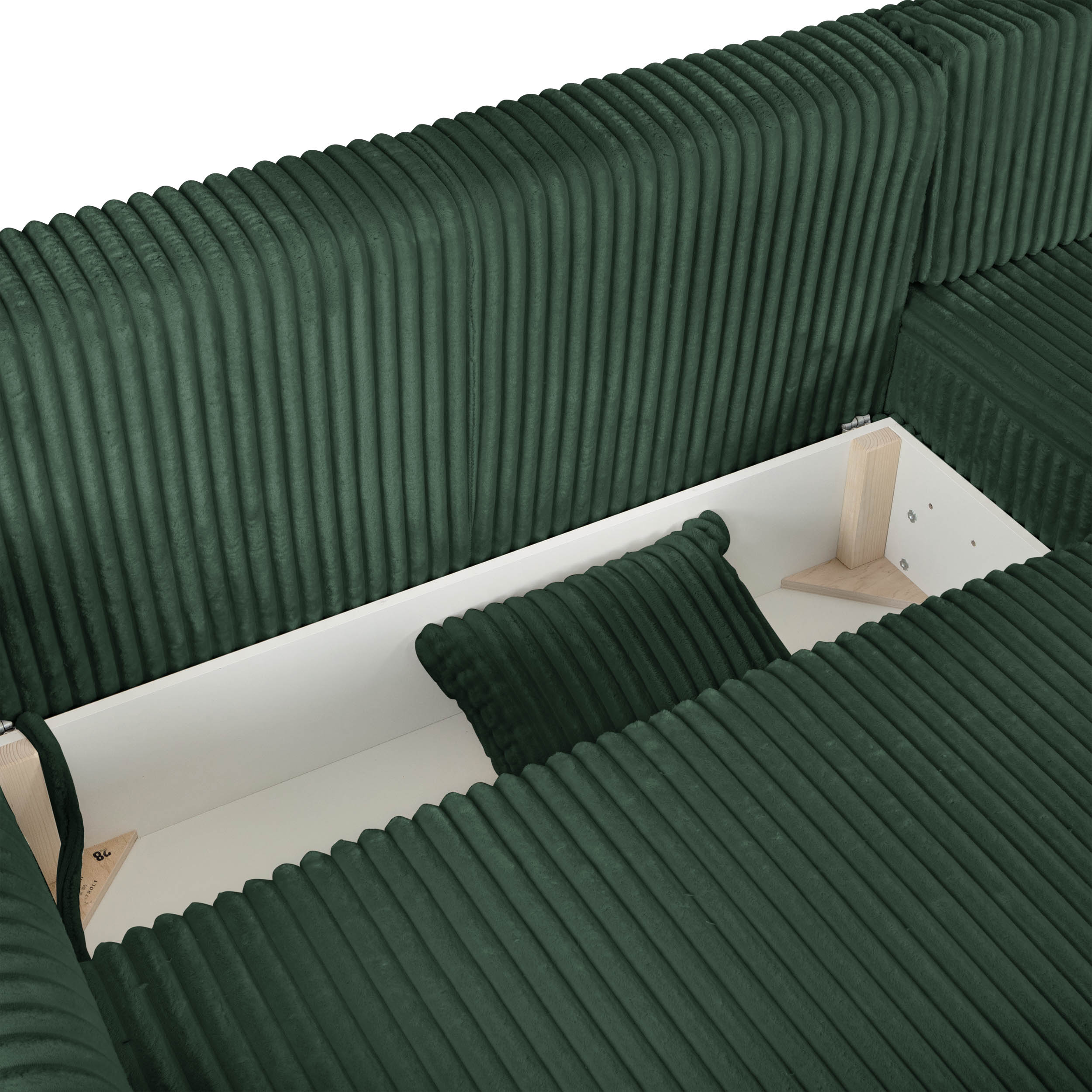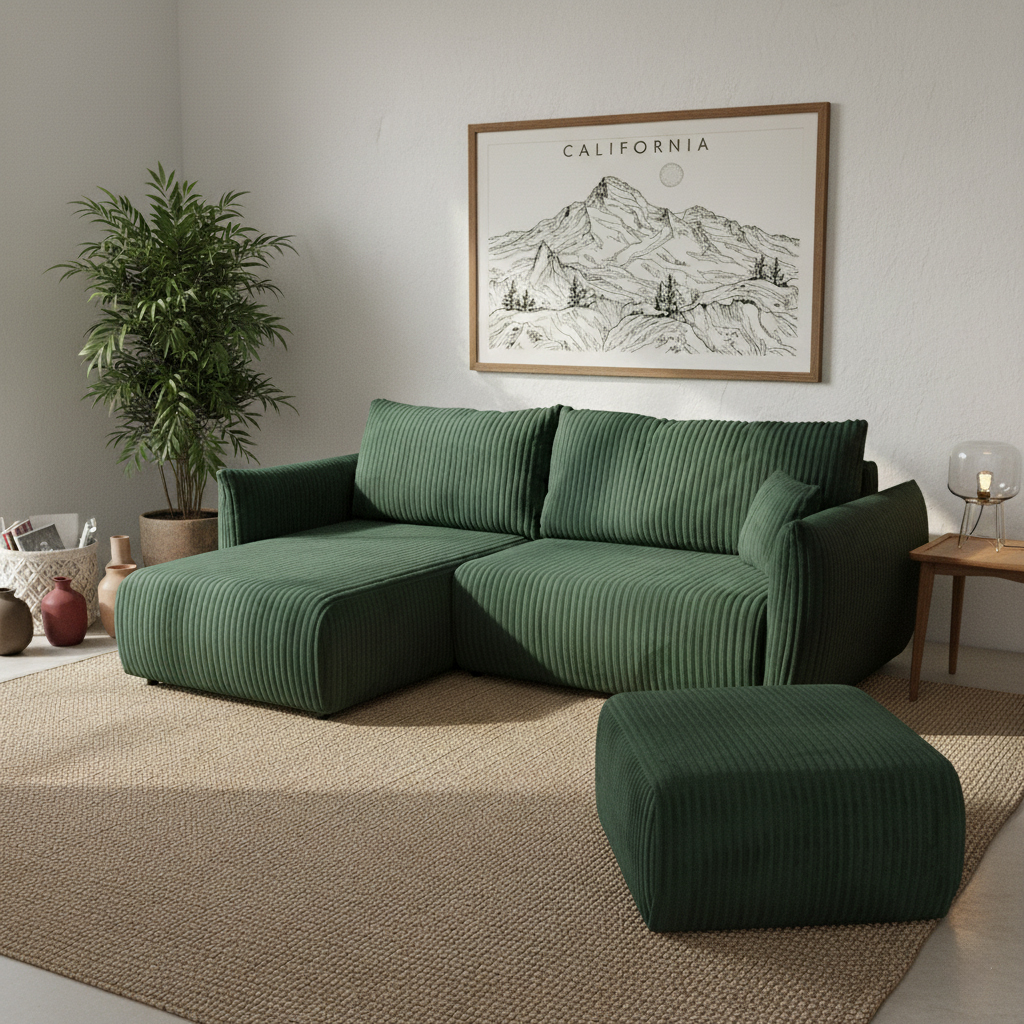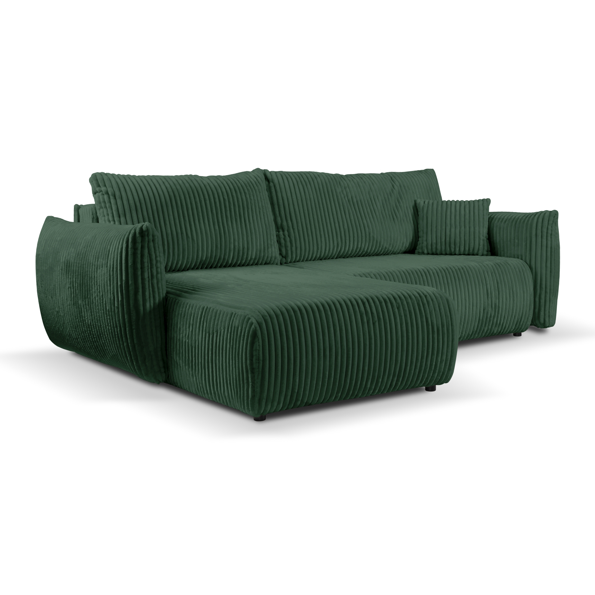 Confortevole e ultra pratico, il divano angolare GLORIA seduce per il suo morbido velluto a coste, il letto aggiuntivo integrato e il discreto vano contenitore.