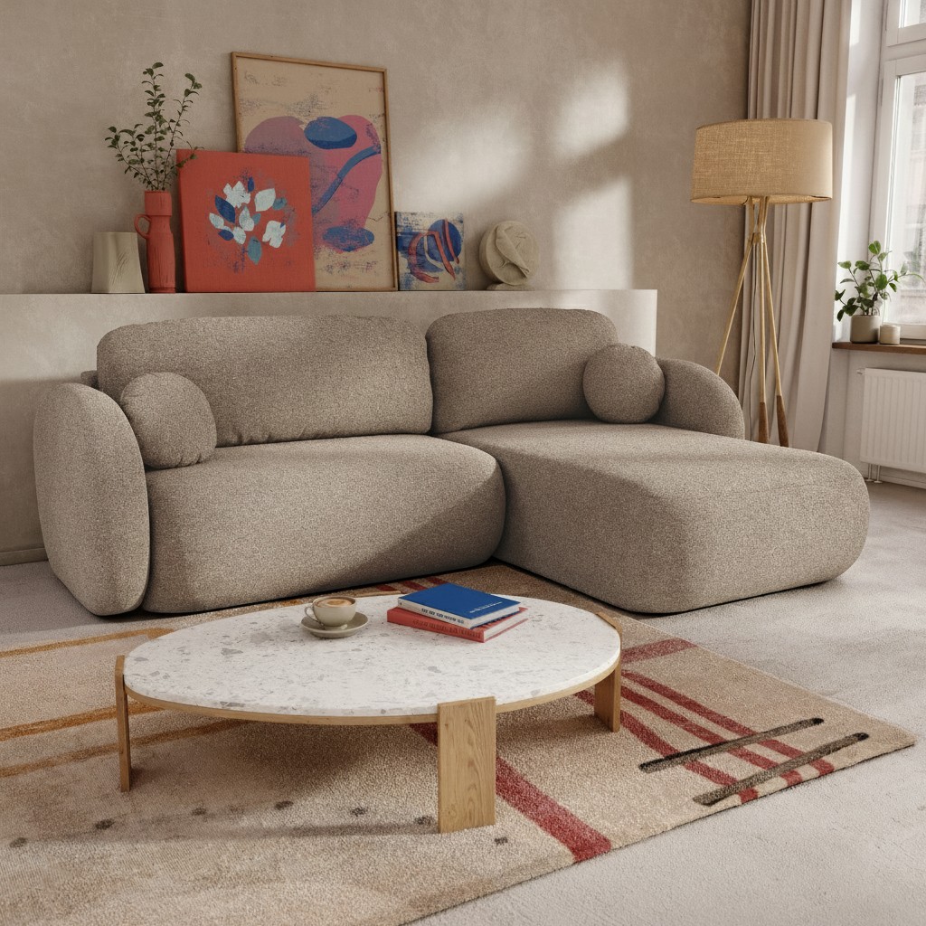 Con il suo morbido tessuto bouclé e il design arrotondato, il divano angolare CARLOTTA trasforma il vostro salotto in un accogliente rifugio. Pratico e confortevole, si adatta a tutte le vostre esigenze grazie al vano contenitore integrato e alla funzione convertibile.