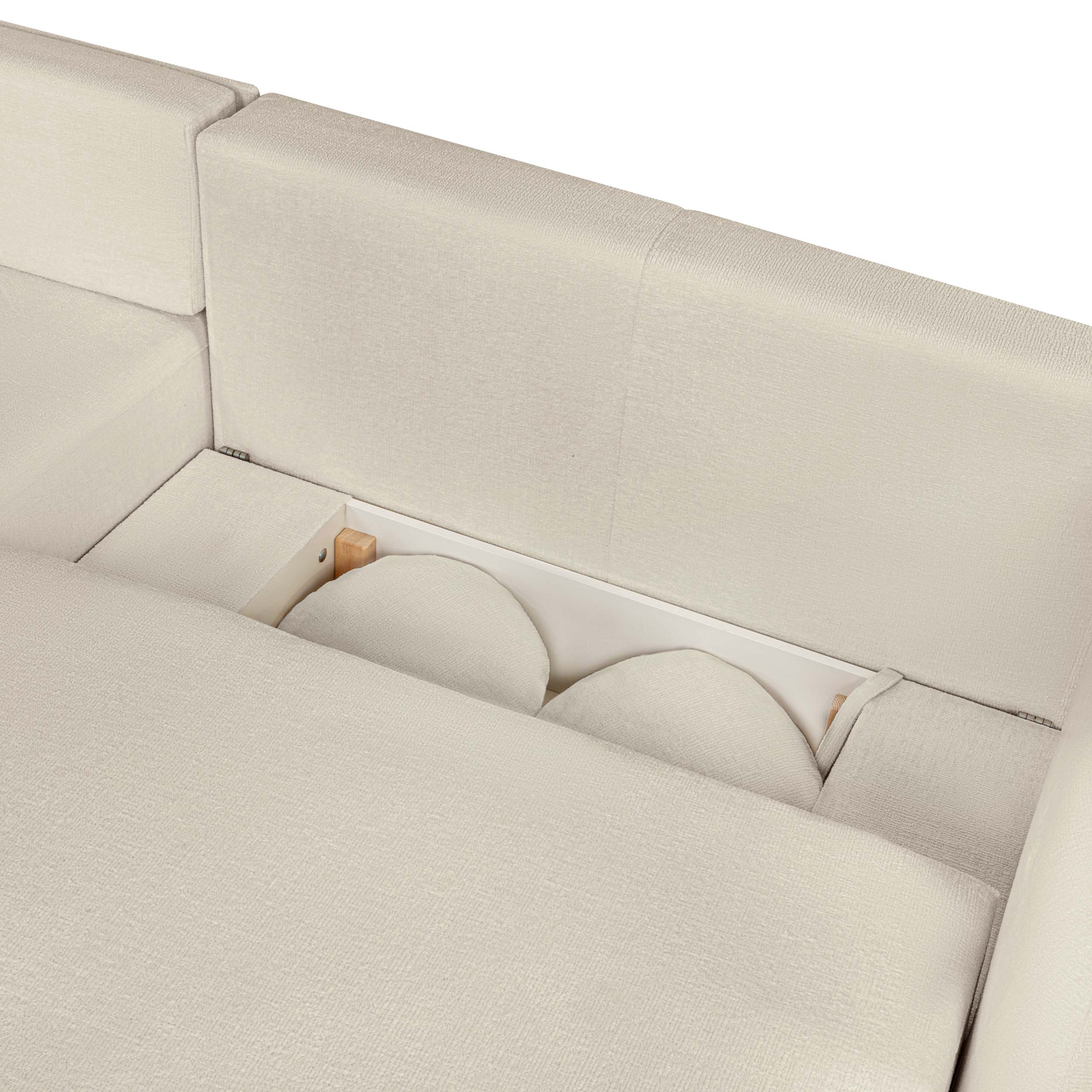 Sotto la sua morbida seduta si nasconde un discreto vano contenitore, ideale per riporre plaid, cuscini o biancheria da letto.