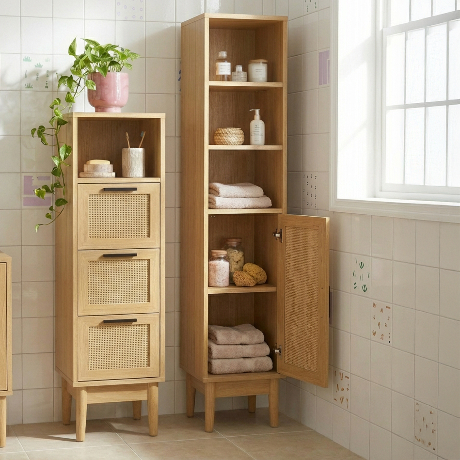 La colonna bagno AMANA si distingue per il suo autentico e raffinato design bohémien, che combina armoniosamente il rivestimento in melamina effetto legno e la canna intrecciata. Questo stile bohémien porterà un tocco di calore e carattere al suo bagno, integrandosi perfettamente con una varietà di stili di interni.