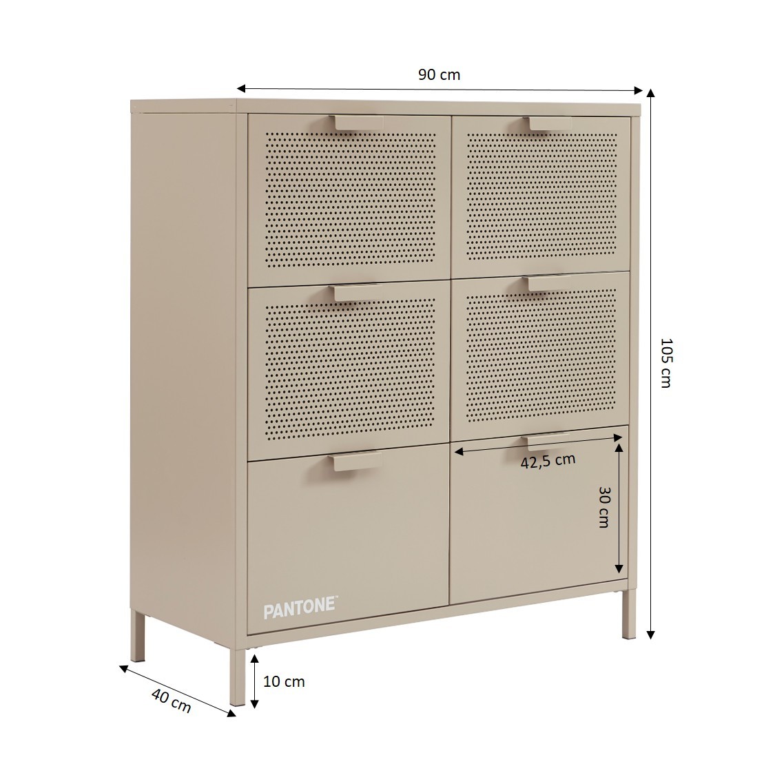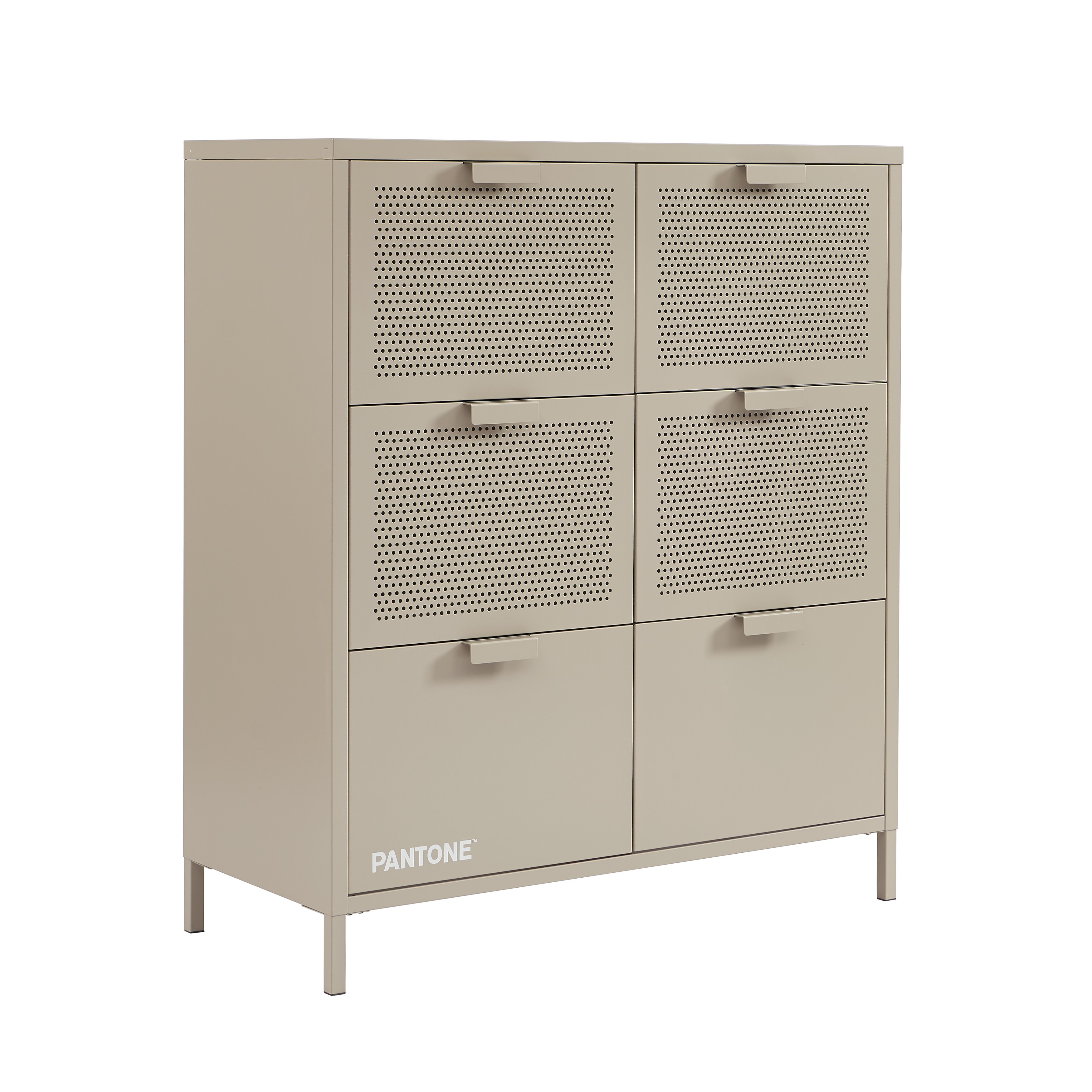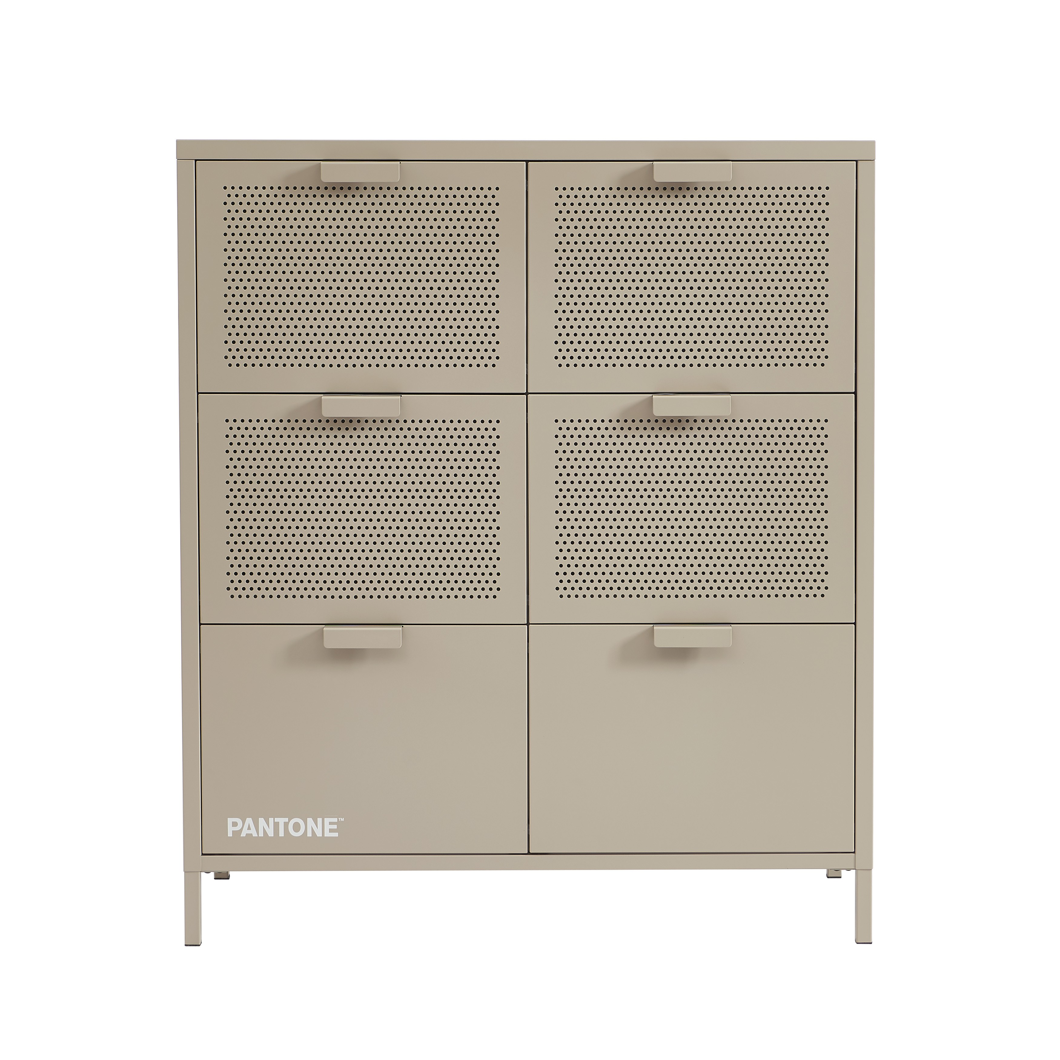 La cassettiera PANTONE è dotata di sei cassetti, offrendo così uno spazio di archiviazione pratico e organizzato per i vostri oggetti. I quattro cassetti superiori hanno un frontale in metallo perforato, che aggiunge un tocco di texture al design del comò, mentre i due cassetti inferiori hanno un frontale in metallo pieno per un look più solido e tradizionale.