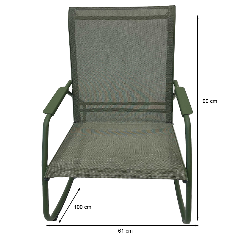 Realizzata con cura in acciaio verniciato resistente e textilene color kaki, questa poltrona incarna la miscela perfetta di robustezza e fascino estetico.