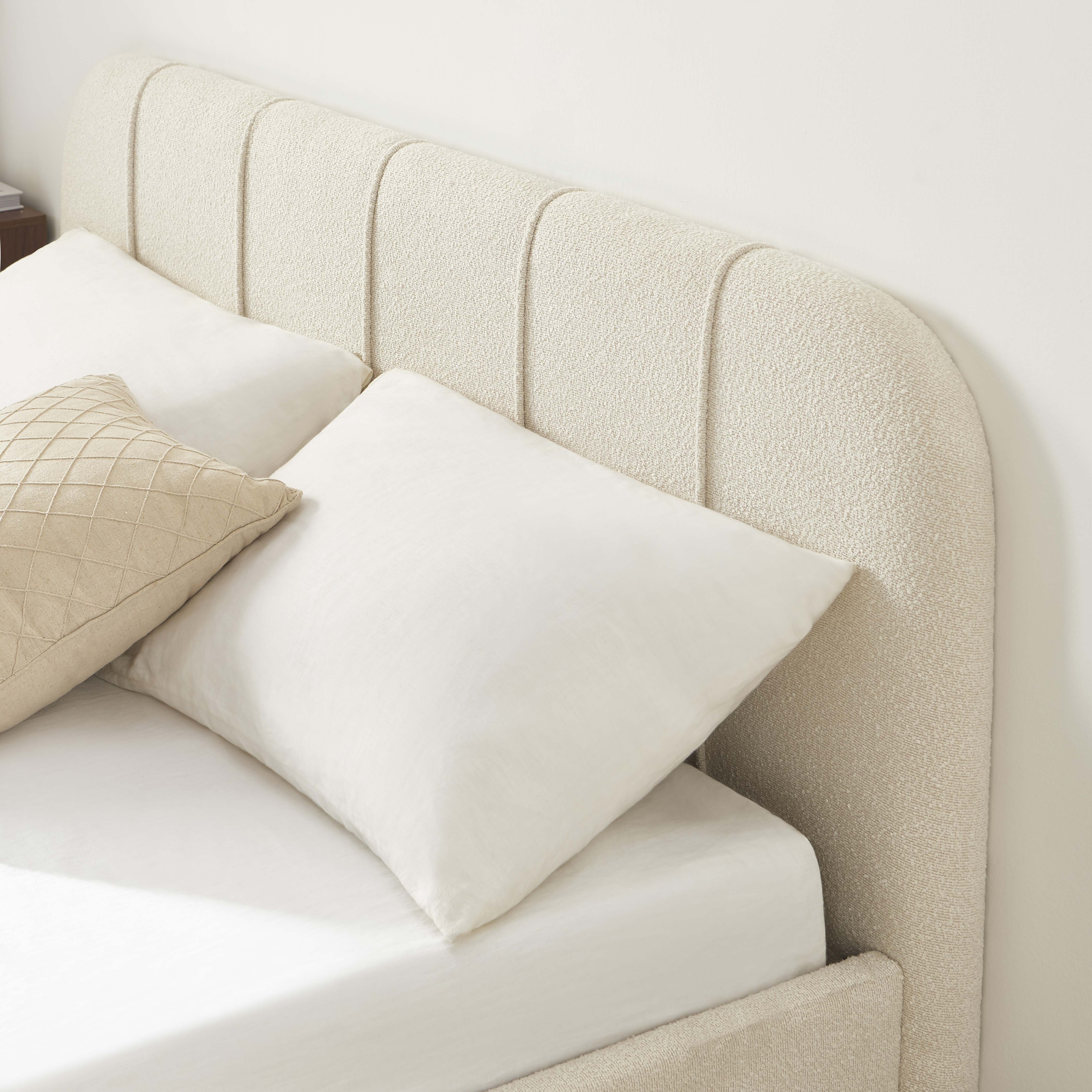Il letto YUME seduce con il suo rivestimento in tessuto bouclé, un materiale molto di moda che invita al relax. La sua tonalità beige luminosa si integra facilmente in un arredamento contemporaneo, bohémien o minimalista. Con la sua testiera imbottita leggermente arrotondata, il letto YUME presenta un design curato e accogliente. Perfetto per creare un'atmosfera calda in una camera da letto.