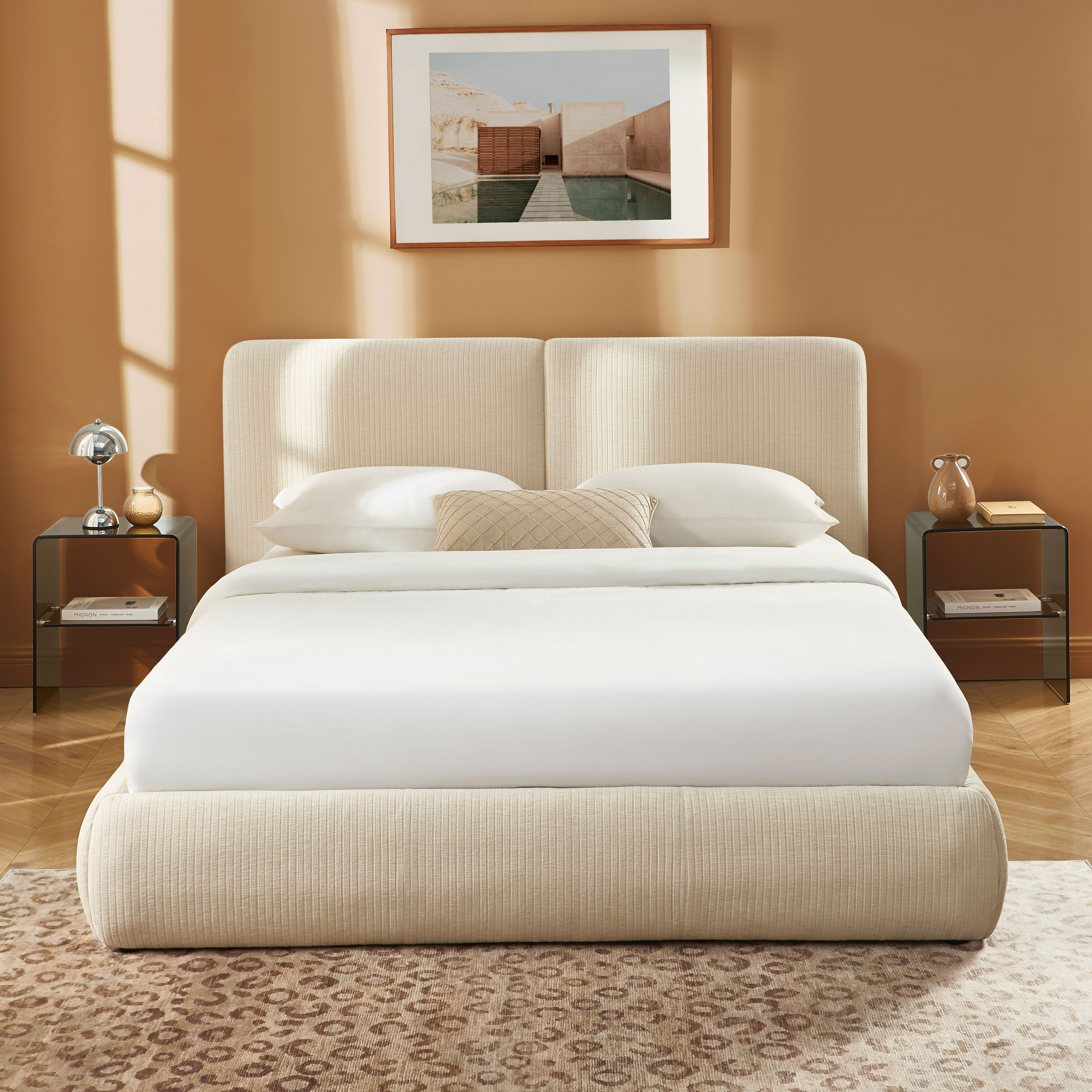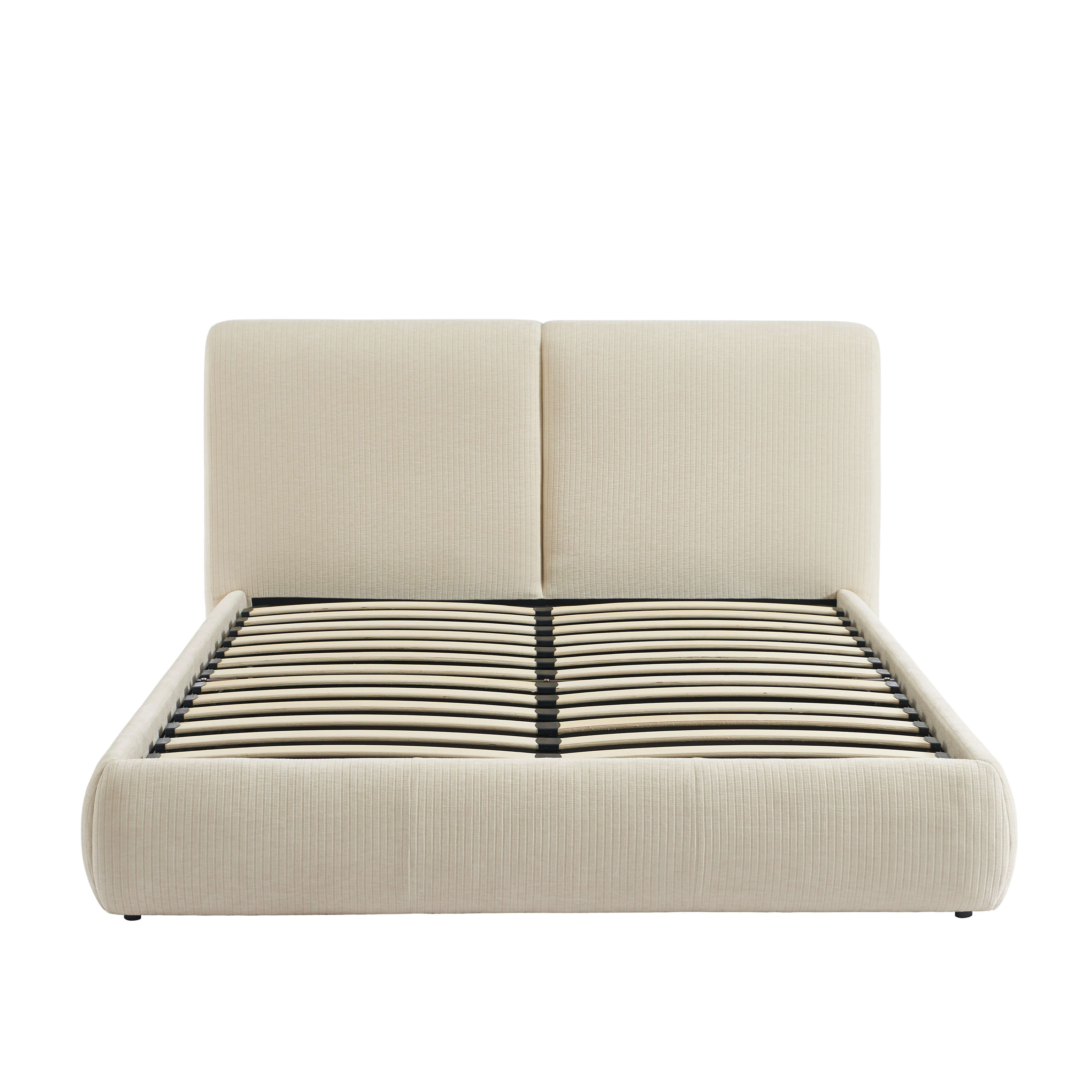 Con il suo rivestimento in velluto a coste e il contenitore integrato, il letto YOKA combina stile e praticità per una camera da letto funzionale.