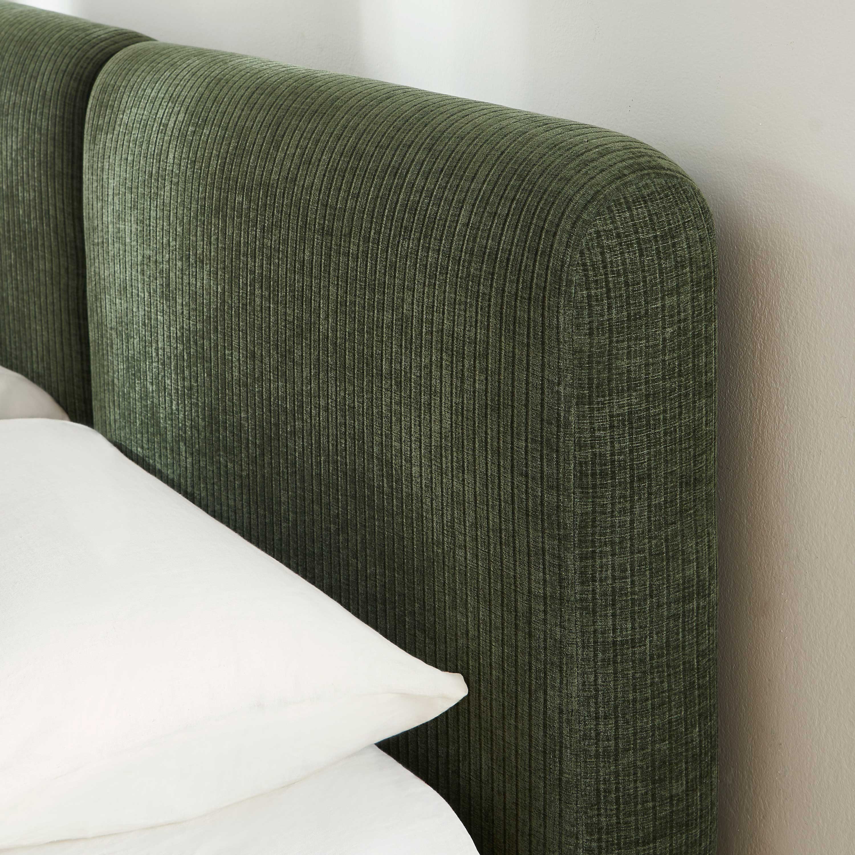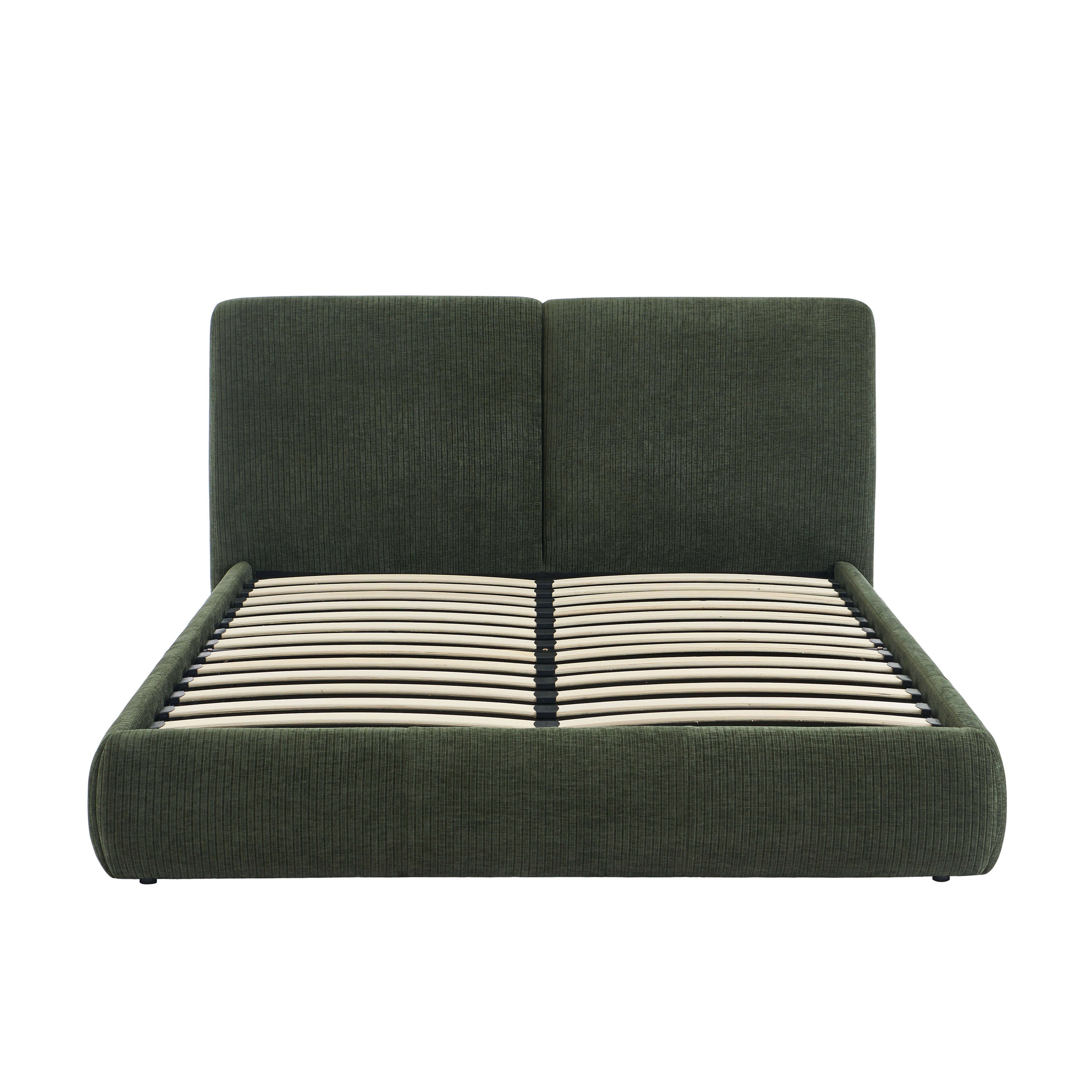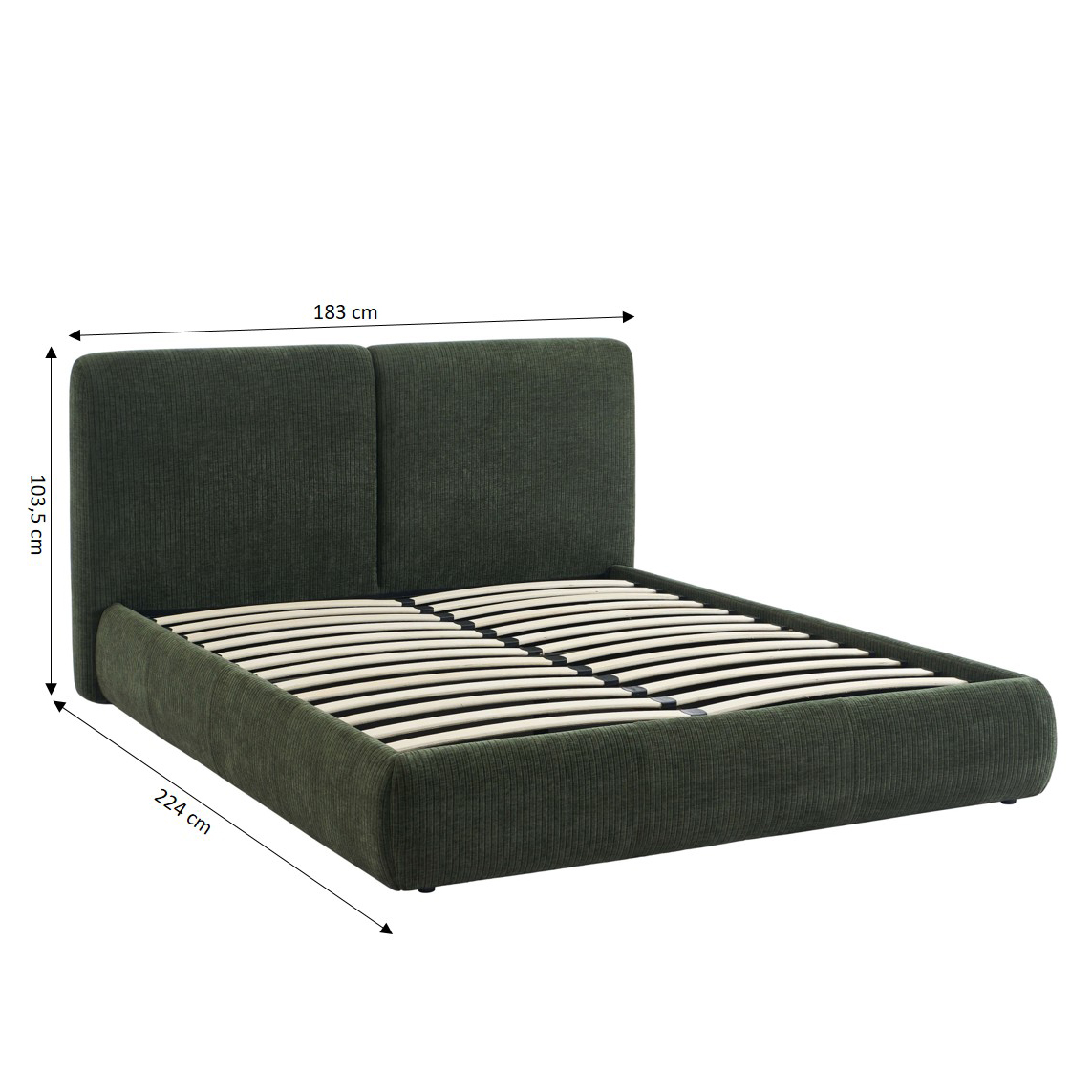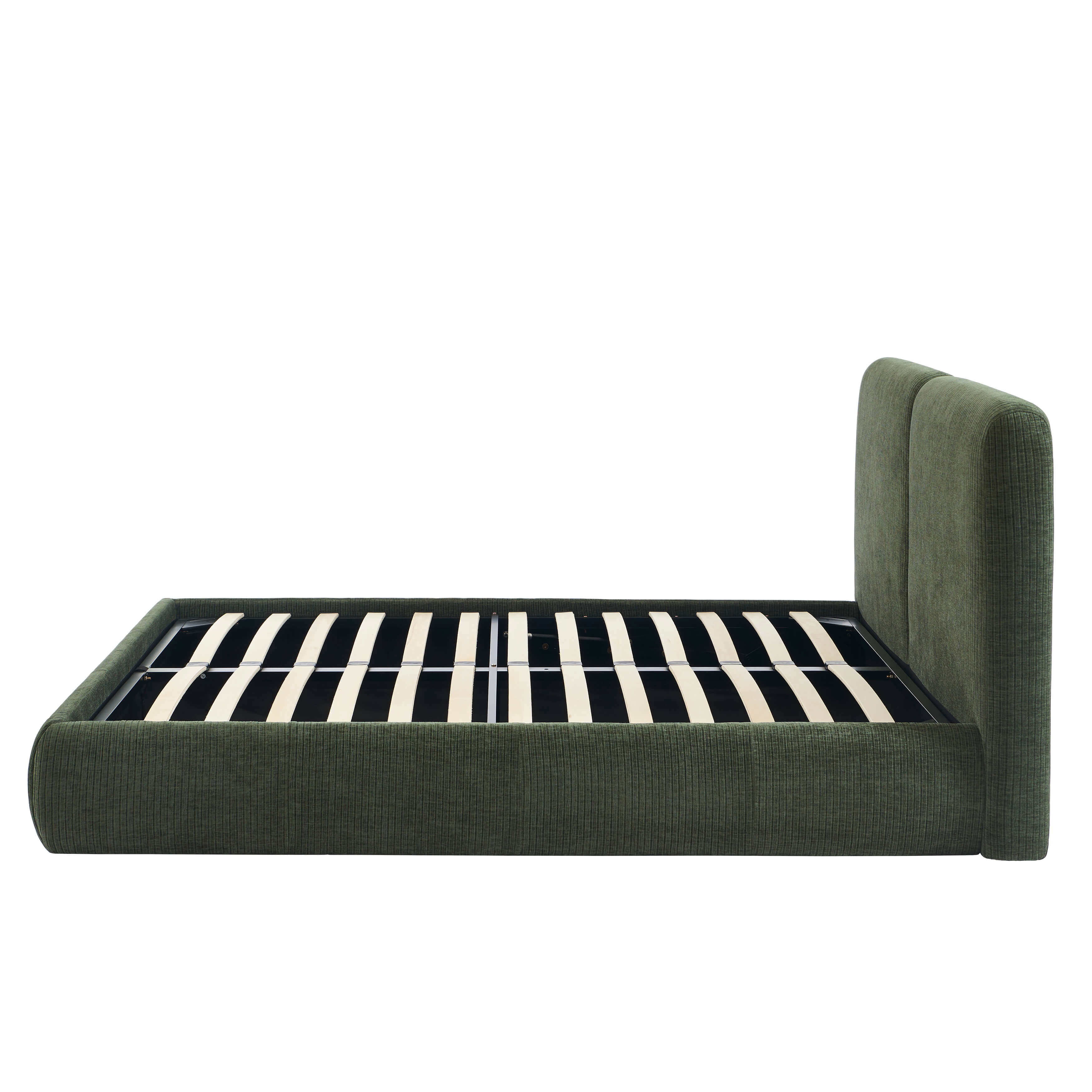 Con il suo rivestimento in velluto a coste e il contenitore integrato, il letto YOKA combina stile e praticità per una camera da letto funzionale.