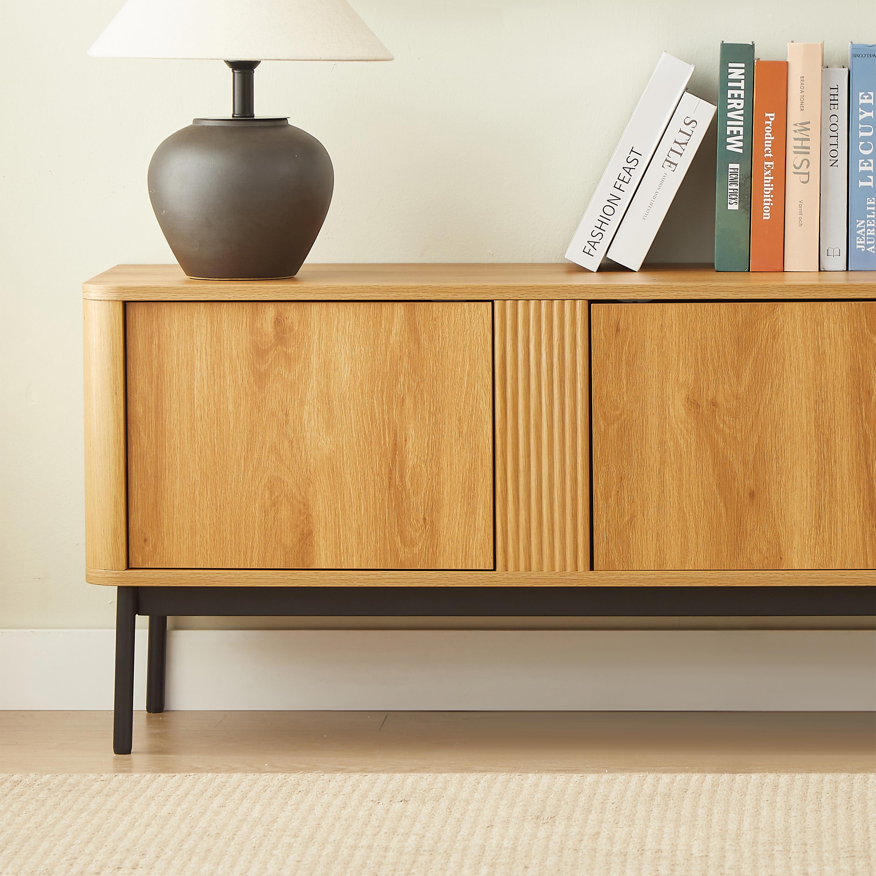 Un mobile TV elegante e pratico, che combina una calda finitura effetto rovere con una base contemporanea in acciaio nero.