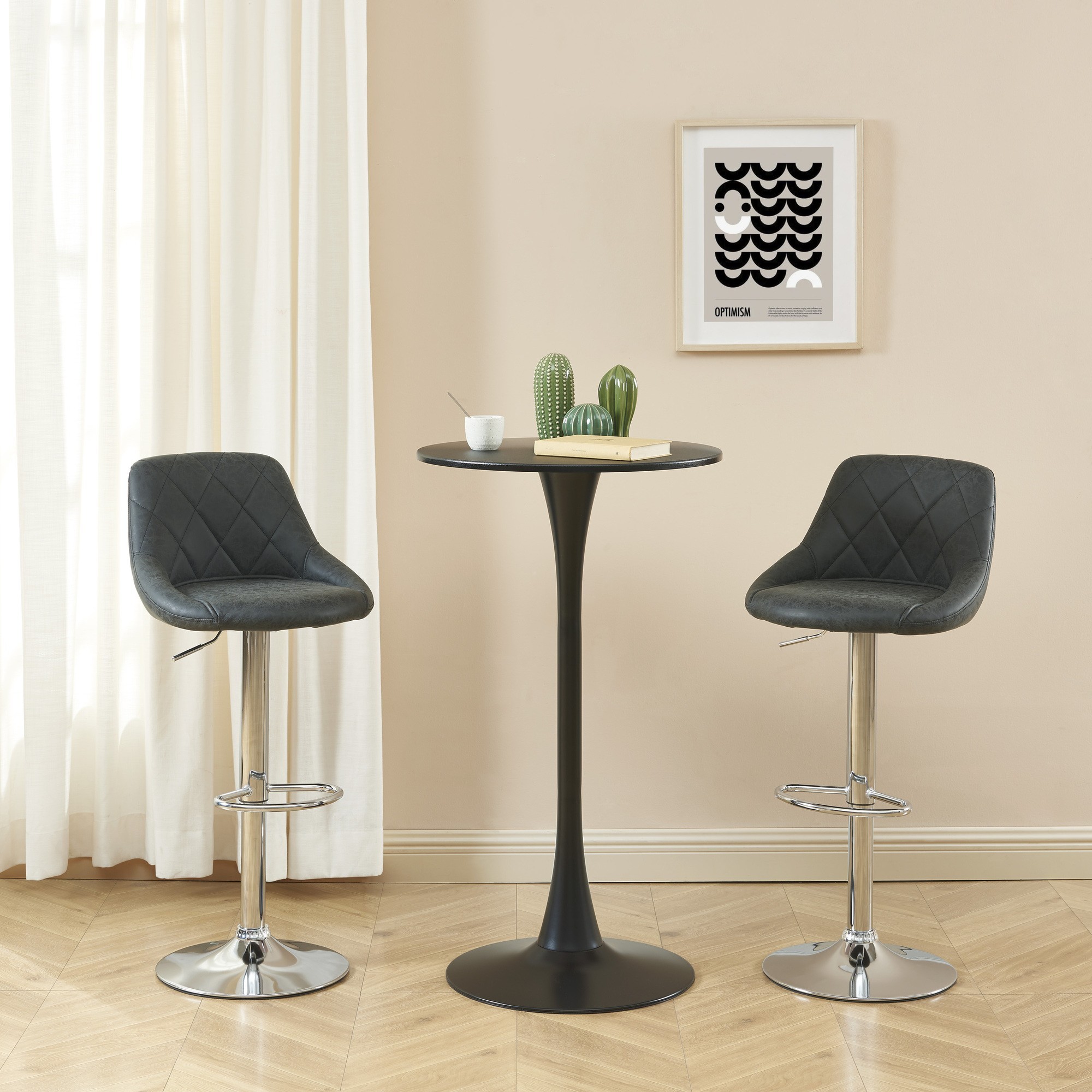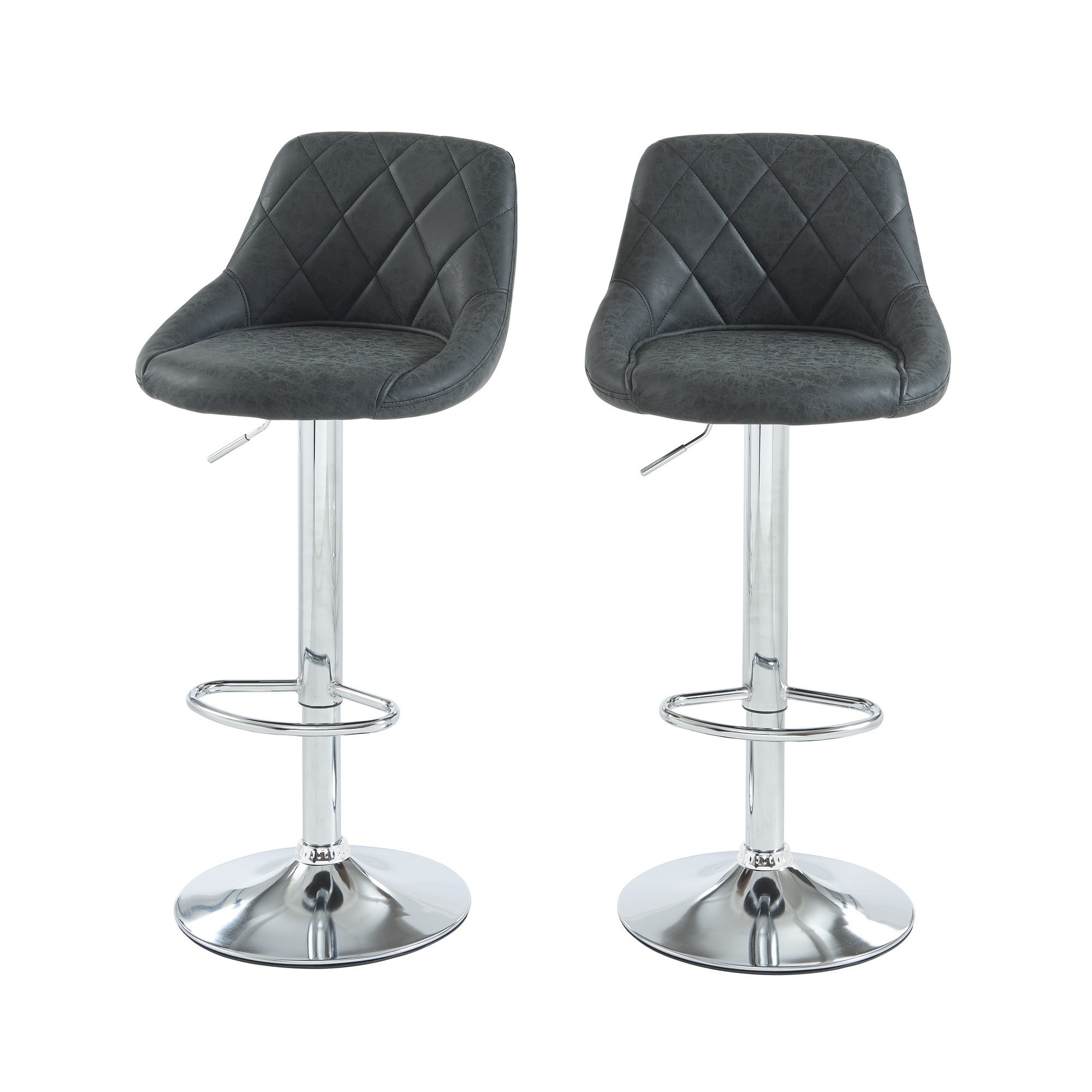 Set di 2 sgabelli da bar MATT in PU nero con base in metallo argentato. Dimensioni degli sgabelli: 45 x 49 x 84 - 104 cm
