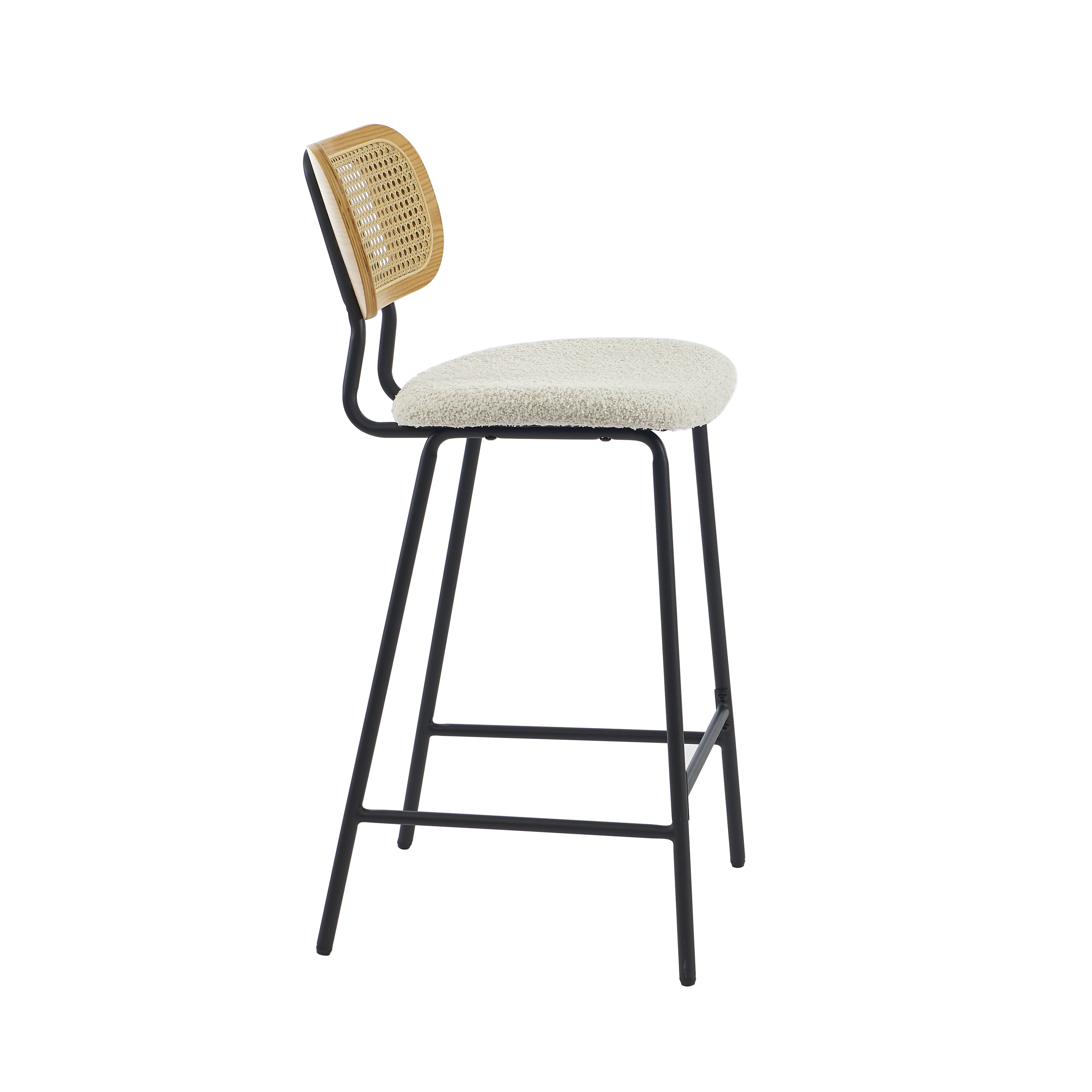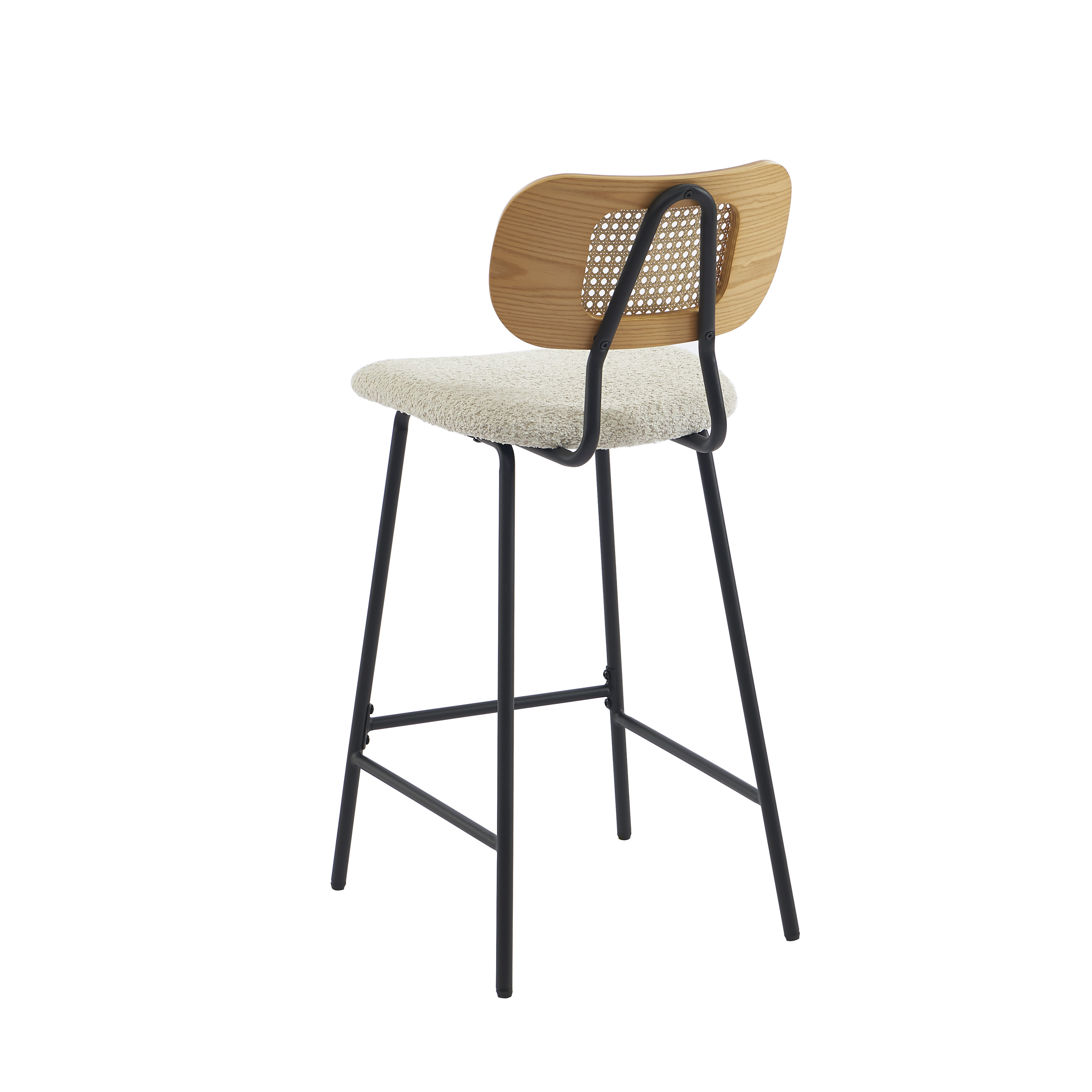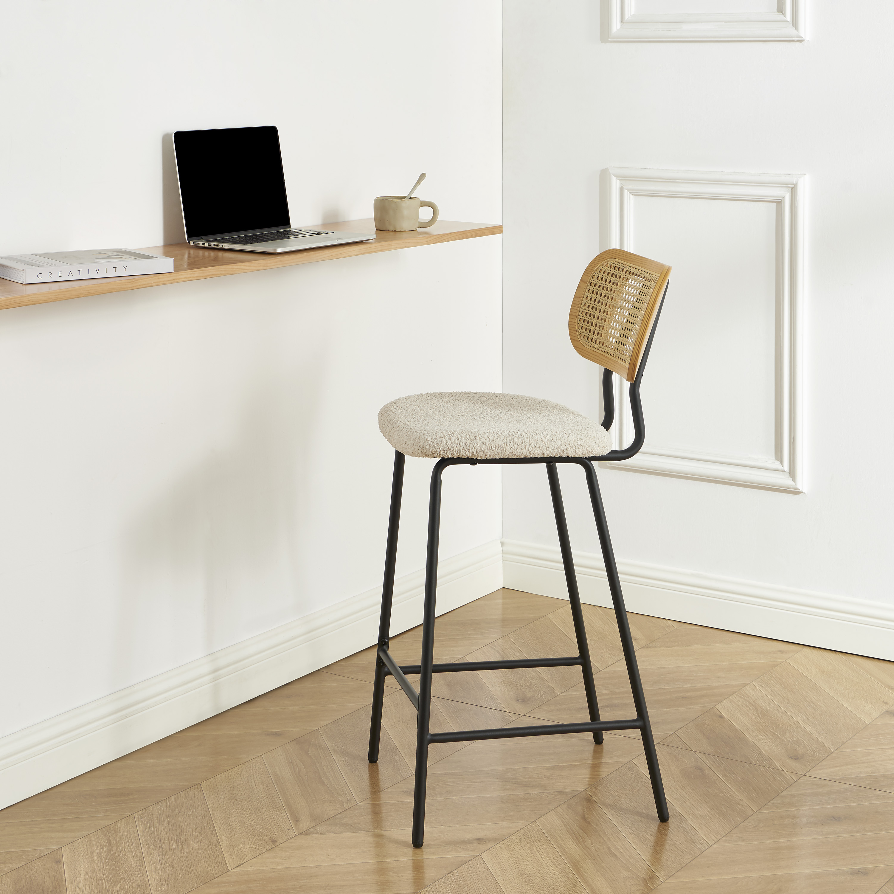 Gli sgabelli TINA combinano con eleganza materiali moderni e naturali: il tessuto bouclé conferisce morbidezza, mentre lo schienale in rattan intrecciato dona un fascino autentico e uno spirito bohémien all'insieme.