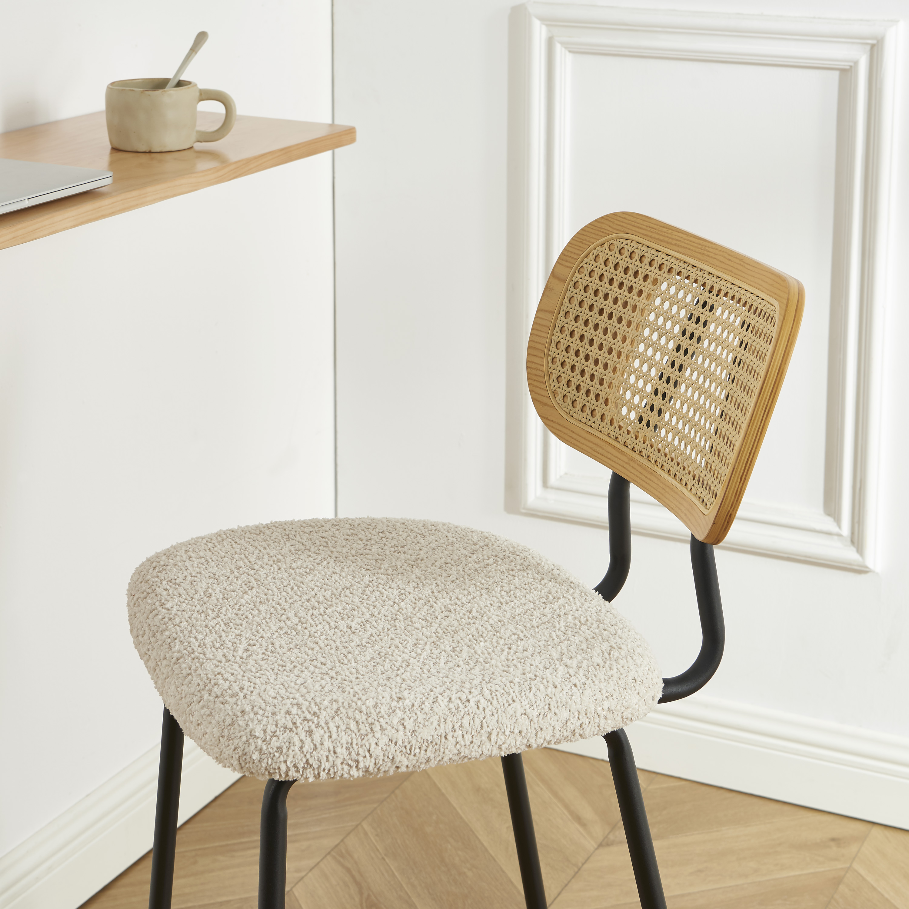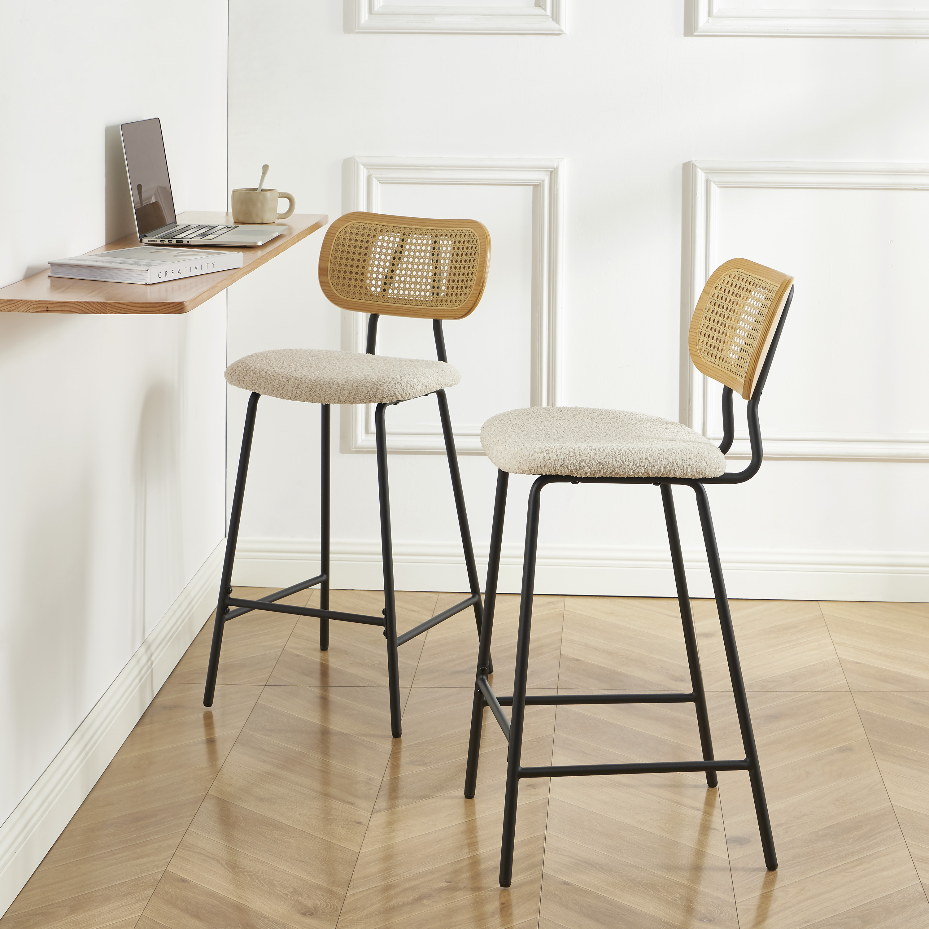 Una coppia di sgabelli dal look naturale e accogliente, che combinano bouclé e canna di rattan per una zona pranzo calda.